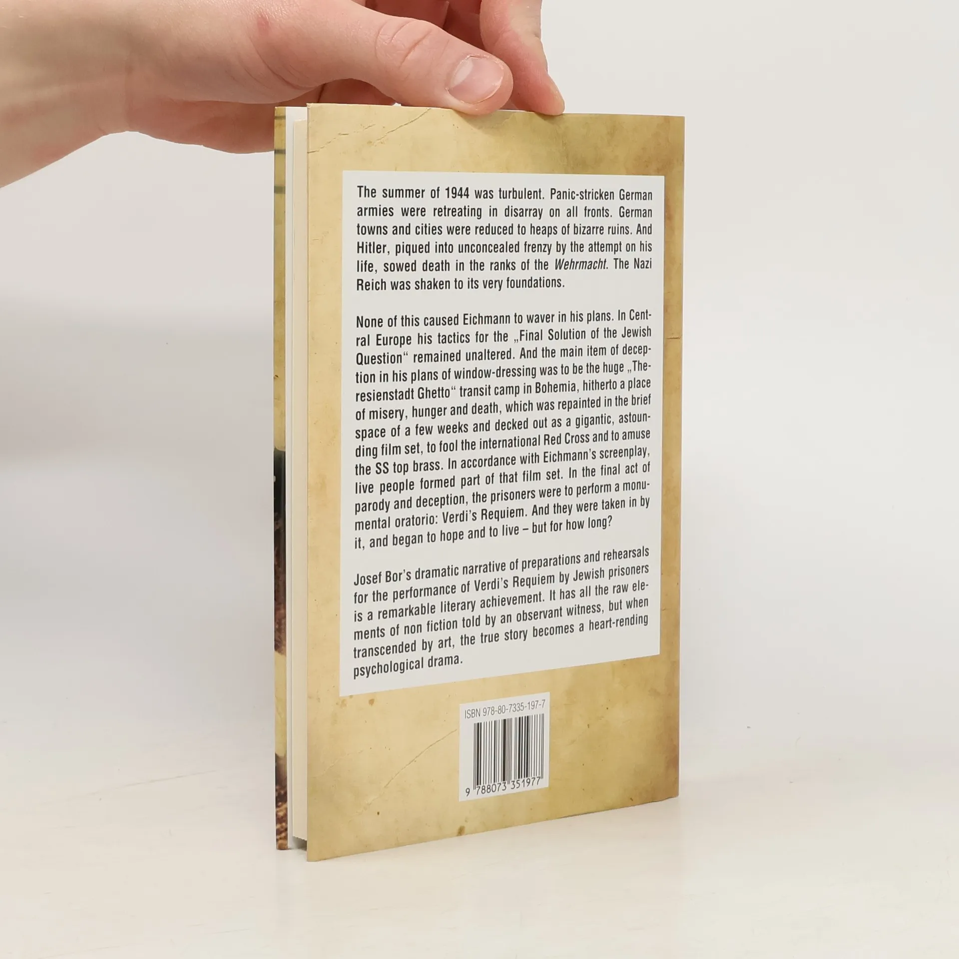The summer of 1944 was turbulent. Panic-stricken German armies were retreating in disarray on all fronts. German towns and cities were reduced to heaps of bizarre ruins. And Hitler, piqued into unconcealed frenzy by the attempt on his life, sowed death in the ranks of the Wehrmacht. The Nazi Reich was shaken to its very foundations. None of this caused Eichmann to waver in his plans. In Central Europe his tactics for the “Final Solution of the Jewish Question” remained unaltered. And the main item of deception in his plans of window-dressing was to be the huge “Theresienstadt Ghetto” transit camp in Bohemia, hitherto a place of misery, hunger and death, which was repainted in the brief space of a few weeks and decked out as a gigantic, astounding film set, to fool the international Red Cross and to amuse the SS-top brass. In accordance with Eichmann’s screenplay, live people formed part of that film set. In the final act of parody and deception, the prisoners were to perform the monumental oratorium, theVerdi´s Requiem. And they were taken in by it, and began to hope and to live. Josef Bor’s dramatic narrative of preparations and rehearsals for the performance of Verdi’s Requiem by Jewish prisoners is a remarkable literary achievement. It has all the raw elements of non fiction told by an observant witness, but when transcended by art, the true story becomes a heart-rending psychological drama.