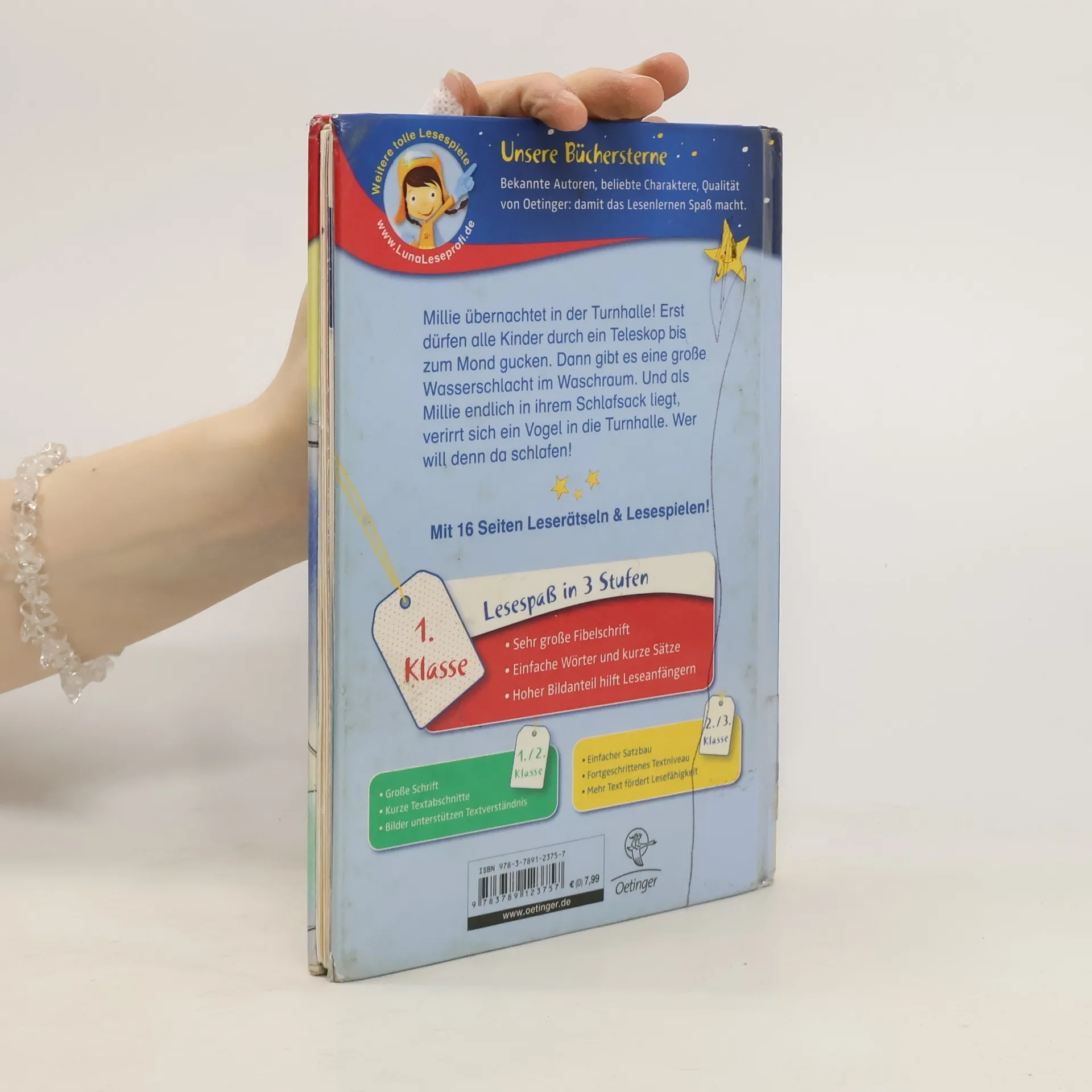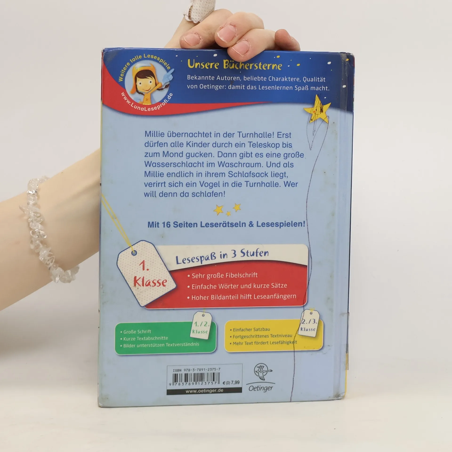 Wer will denn schlafen? Millies Klasse macht die Nacht zum Tag Wie aufregend! Millie und ihre Mitschüler übernachten in der Turnhalle. Doch kommt man da überhaupt zum Schlafen? Erst baut Millie ein Sonnensystem aus Murmeln und einem Hüpfball, dann gibt’s eine tolle Wasserschlacht im Waschraum. Und als Millie sich endlich in ihren Schlafsack kuschelt, hat sich ein kleiner Vogel in die Turnhalle verirrt! Eine lustige Büchersterne-Schulgeschichte von Millie, der Kinderbuch-Erfolgsfigur von Dagmar Chidolue. Lesen lernen mit „Büchersterne“ für die 1. Klasse: sehr große Fibelschrift, einfache Wörter, kurze Sätze und ein hoher Bildanteil für die jüngsten Leseanfänger. Dazu 16 Seiten Leserätsel und Lesespiele im Anhang.
