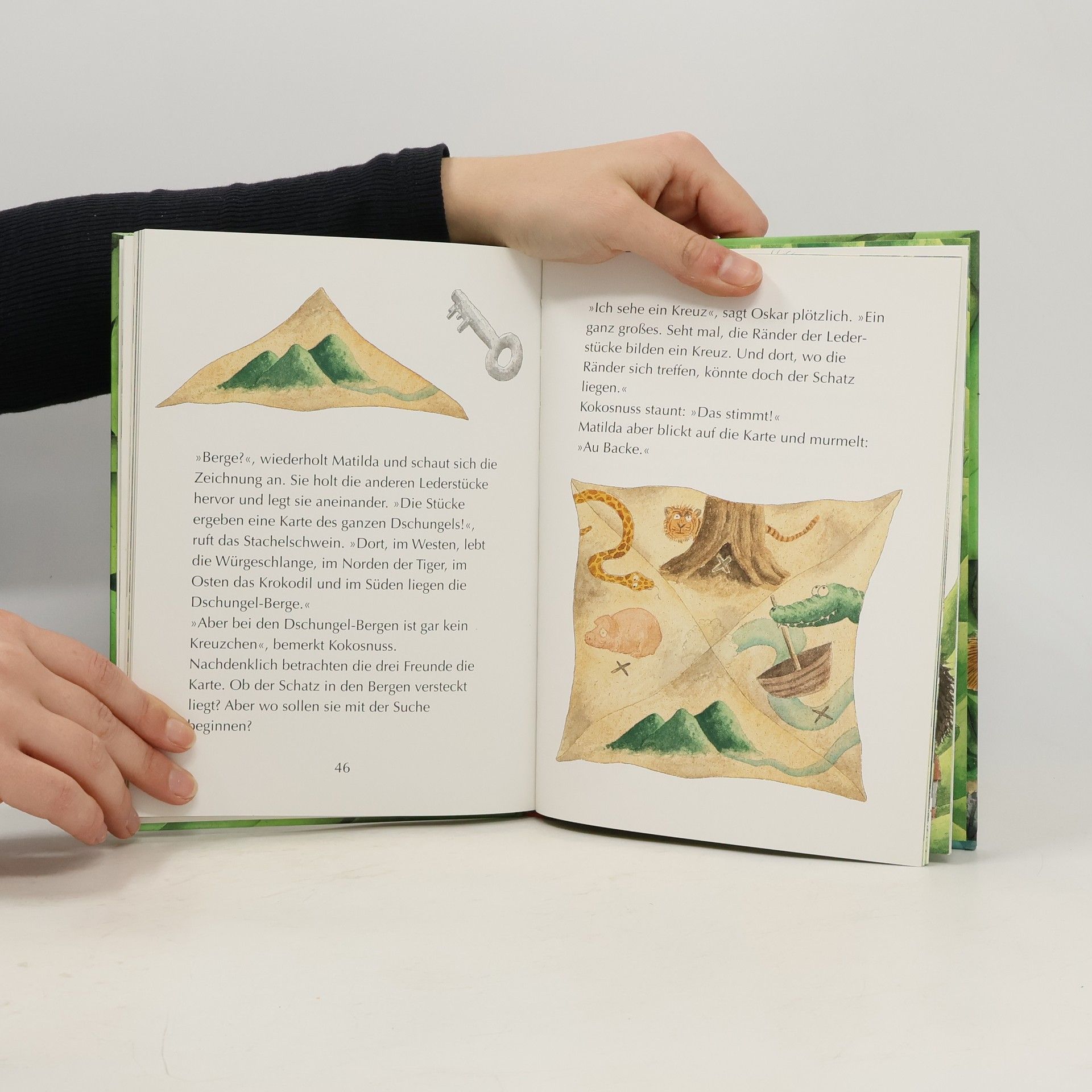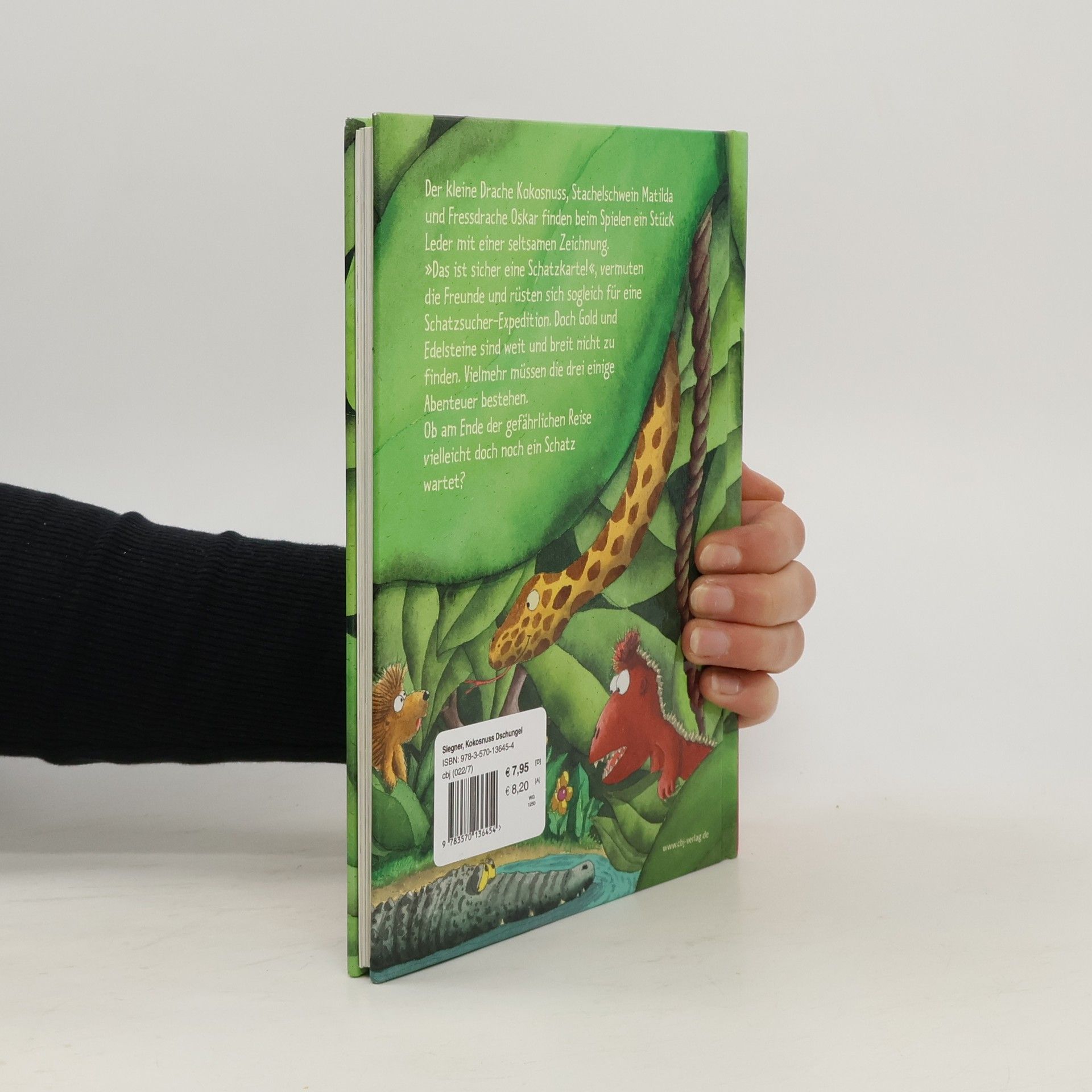 Der kleine Drache Kokosnuss auf Schatzsuche Der kleine Drache Kokosnuss und seine Freunde Matilda und Oskar finden beim Spielen ein kleines Stück Leder, auf dem ein seltsames Bild eingezeichnet ist. Die kluge Matilda erkennt sofort, dass das der Felsen unweit der Stachelschwein-Höhle sein muss. Hier ist sicher ein Schatz versteckt!, vermuten Kokosnuss und Oskar und rüsten sich sogleich für eine große Schatzsucher-Expedition. Doch anstelle von Gold und Diamanten finden die drei Freunde unter dem Felsen einen weiteren Teil der Schatzkarte. Die Karte führt sie mitten in einen gefährlichen Dschungel. Kokosnuss, Matilda und Oskar müssen all ihren Mut zusammen nehmen, als sie Würgeschlangen, Tigern und Krokodilen begegnen. Doch am Ende ihrer abenteuerlichen Reise wartet eine große Überraschung … Die Geschichten über die aufregenden Abenteuer, die der kleine Drache Kokosnuss mit seinen Freunden erlebt, sind inzwischen wahre Kinderbuchklassiker. Ingo Siegner schreibt über Freundschaft und Mut und fügt liebenswert-originelle Illustrationen hinzu. Die »Dein-Spiegel-Bestseller«-Reihe eignet sich perfekt zum Vor- und Selberlesen. Ausstattung: Mit fbg. Illustrationen
