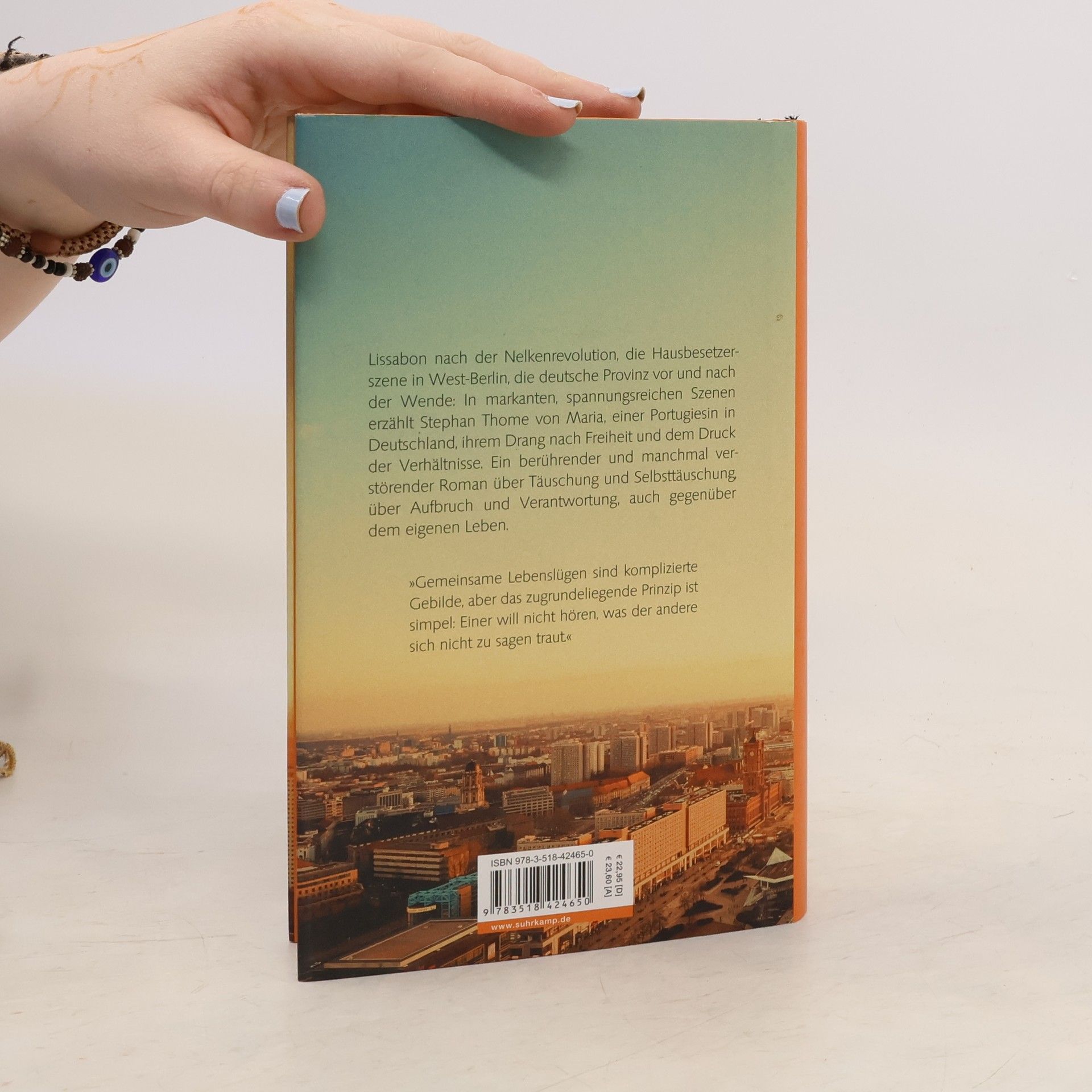 Maria ist achtzehn und möchte raus aus Portugal. Mitte der Siebzigerjahre bietet das Land einer jungen Frau wenig Perspektiven. Maria aber will nicht heiraten und Kinder kriegen, sie will mehr vom Leben. Als das neue Jahrzehnt anbricht, geht sie nach Berlin, beginnt ein Studium und eine Beziehung mit einem rebellischen Theatermacher, die bald scheitert. Allen Plänen vom unabhängigen Leben zum Trotz findet sich Maria schließlich als Ehefrau und Mutter in der nordrhein-westfälischen Provinz wieder und schaut ihrem Mann Hartmut beim Karrieremachen zu. Lang arrangiert sie sich mit den Verhältnissen, aber als die Tochter erwachsen und auf dem Sprung aus dem Haus ist, trifft Maria eine Entscheidung. Lissabon nach der Nelkenrevolution, die Hausbesetzerszene in Westberlin, die deutsche Provinz vor und nach der Wende: Stephan Thome erzählt in markanten, spannungsreichen Szenen eine bekannte Geschichte neu und völlig anders. Gegenspiel ist ein berührender und manchmal verstörender Roman über Täuschung und Selbsttäuschung, über Aufbruch und Verantwortung, auch gegenüber dem eigenen Leben – ein Roman voller Empathie und psychologischer Raffinesse.