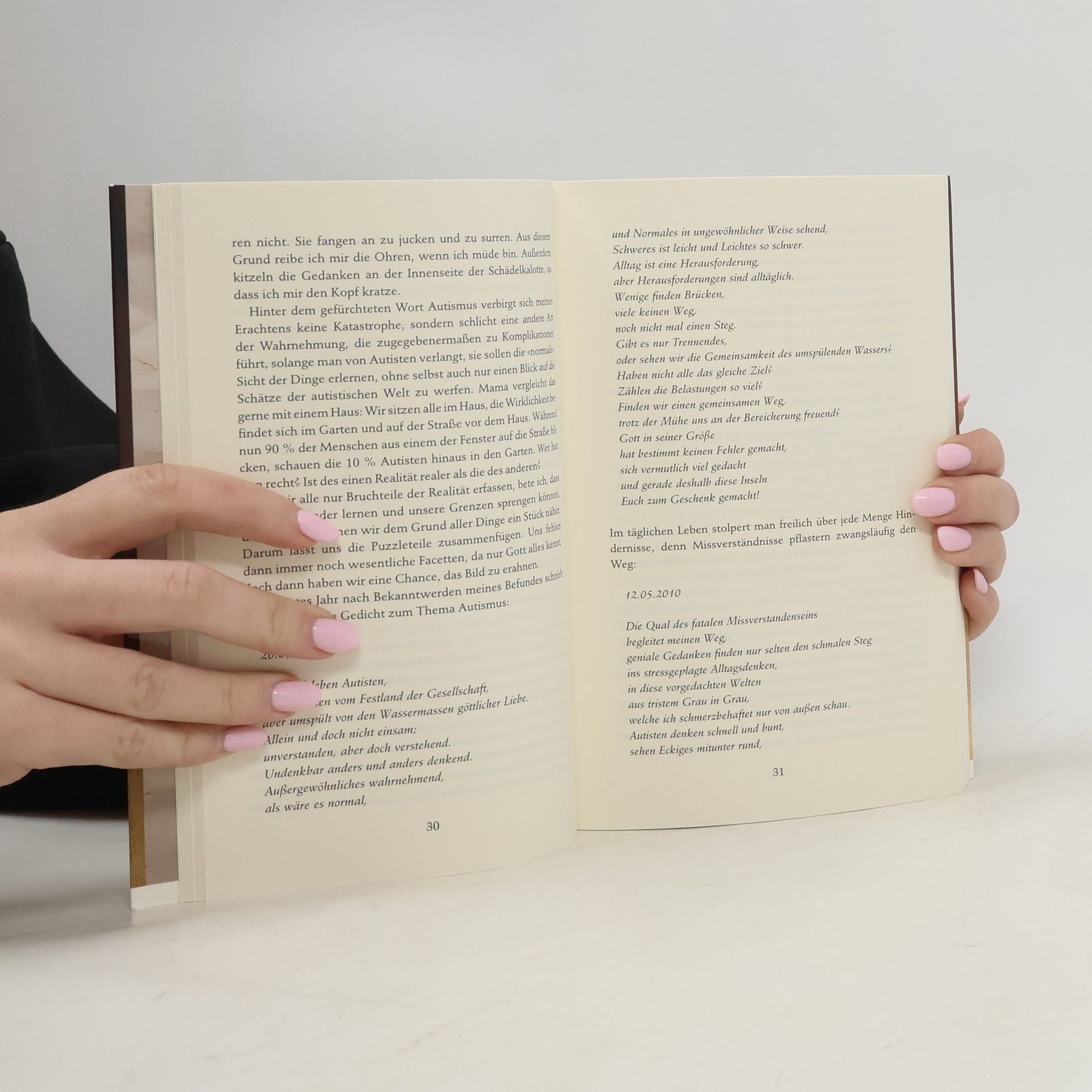 So etwas hat man zuvor noch kaum je gesehen, kaum gehört, kaum gelesen: Dieses Buch wurde geschrieben von einem heute 14-jährigen Jungen. Raphael ist wegen eines vorgeburtlichen Schlaganfalls Autist und Epileptiker, kann nicht reden, sondern nur Laute von sich geben. Seit der Geburt sitzt er schwerstbehindert im Rollstuhl, hat aber einen enormen IQ, ist gläubig und konnte - ohne jeden Unterricht - bereits als Kleinkind lesen und schreiben. Was man aber erst herausfand, als er etwa 6 Jahre alt war. Bis dorthin glaubten alle, auch die Ärzte, er sei richtiggehend "blöde". Dank gestütztem Schreiben kann er nun, seit er 7 ist, Gedichte und ganze Romane schreiben, geht aufs Gymnasium und wird oft auch an die Universität Augsburg eingeladen, wo er sich von den Studenten "interviewen" lässt. Alle staunen. Sein Buch ist wunderbar, es ist quasi der Bericht aus einer anderen, uns normalerweise völlig verborgenen Welt. Es sind Texte aus einem Paralleluniversum, eindringlich, nah, existenziell. Selten konnte jemand mit seinen Worten eine derartige Brücke bauen. Eine Offenbarung!