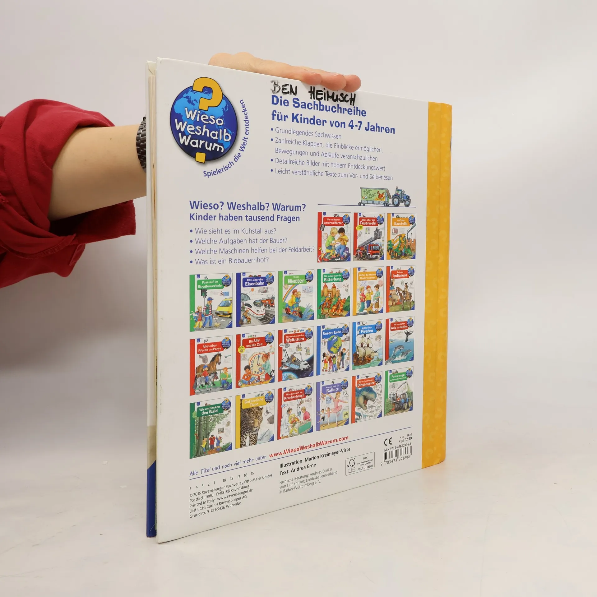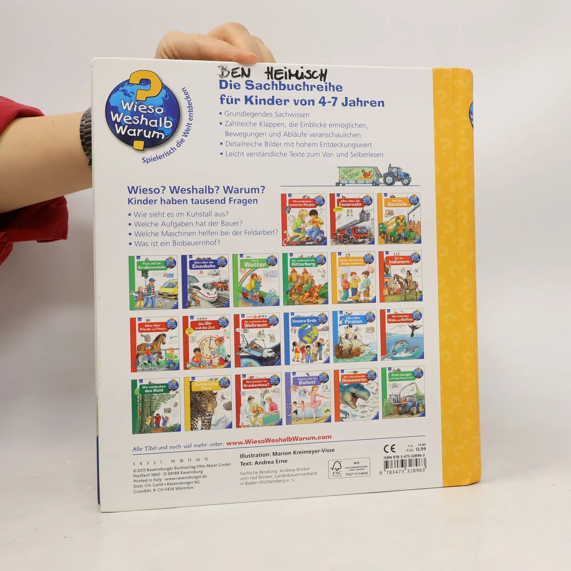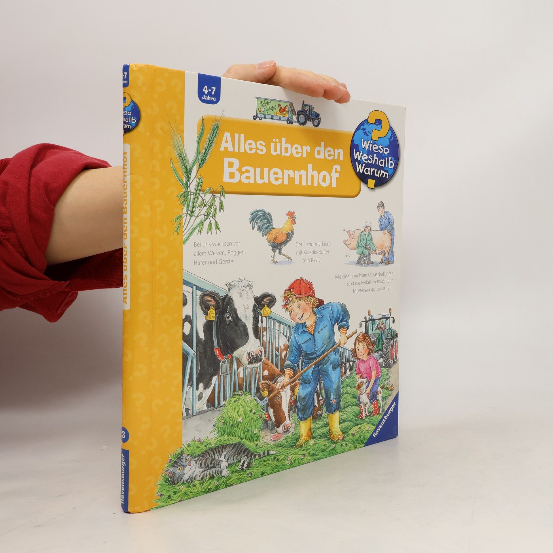 Ein Besuch im Stall bei Kühen, Hühnern und Schweinen sowie auf der Weide bei Schafen und Ziegen zeigt: Bauer und Bäuerin haben von morgens bis abends alle Hände voll zu tun. Zum Glück helfen Maschinen bei der Arbeit im Stall und auf dem Feld: ob elektrischer Stallreiniger, Melkroboter oder der hoch technisierte Mähdrescher. Und was ist das Besondere an einem Bio-Bauernhof? Klappen und detailreiche Illustrationen verschaffen Kindern wirklichkeitsgetreue Einblicke in das Leben auf modernen Höfen. Wieso? Weshalb? Warum? Die Sachbuchreihe für Kinder von 4–7 Jahren Jeden Tag entdecken Kinder etwas Neues – da kommen viele Fragen auf. Warum sind die Dinosaurier ausgestorben? Wo ist die Sonne in der Nacht? Wozu brauchen wir das Blut? Die beliebte Sachbuchreihe Wieso? Weshalb? Warum? gibt Kindern Antworten auf Augenhöhe. Dabei werden die unterschiedlichsten Themen aus der Alltags- und Interessenswelt der Kinder altersgerecht und mit viel Liebe zum Detail unter die Lupe genommen. Detailreiche Bilder, verständliche Sachtexte und überraschende Klappen, die Bewegungen oder Abläufe veranschaulichen und hinter die Dinge blicken lassen, ermöglichen Kindern, sich ihre Themen selbst zu erschließen. Der Spaß am eigenhändigen Entdecken, die liebevolle Umsetzung und die qualitativ hochwertige Ausstattung garantieren langanhaltende Freude an jedem einzelnen Buch.