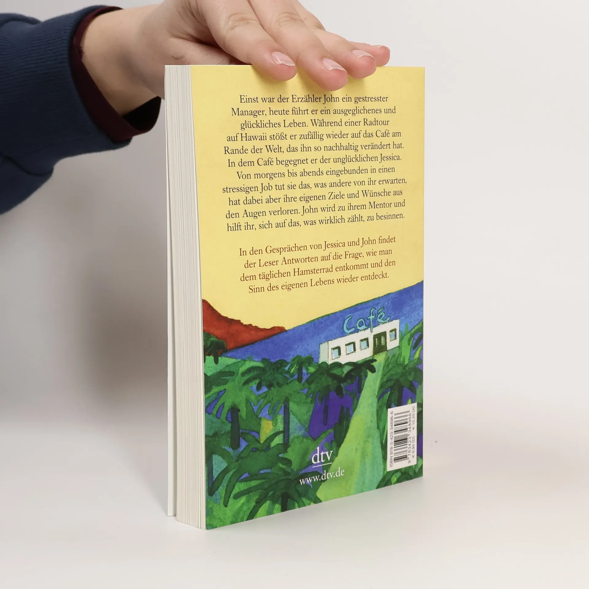 Inspirationen fürs eigene Leben Einst war der Erzähler John ein gestresster Manager, heute führt er ein ausgeglichenes und glückliches Leben. Während einer Radtour auf Hawaii erinnert sich John an den Tag vor zehn Jahren, der sein Leben radikal verändert hat. Damals war er zufällig auf das Café am Rande der Welt gestoßen. Und obwohl er sich an einem völlig anderen Ort befindet, Tausende Kilometer entfernt, sieht er es plötzlich wieder. In dem Café begegnet er Jessica, die unglücklich mit ihrem Leben ist. Eingebunden in ein stressiges Arbeitsleben, tut sie das, was andere von ihr erwarten, hat dabei aber ihre eigenen Ziele und Wünsche aus den Augen verloren. John wird zu ihrem Mentor und hilft ihr, sich auf den Sinn ihres Lebens zu besinnen. In den Gesprächen von Jessica und John findet der Leser Antworten auf die Frage, wie man dem täglichen Hamsterrad entkommt und den Sinn des eigenen Lebens wieder entdeckt. Wunderbar vierfarbig illustriert von Root Leeb.