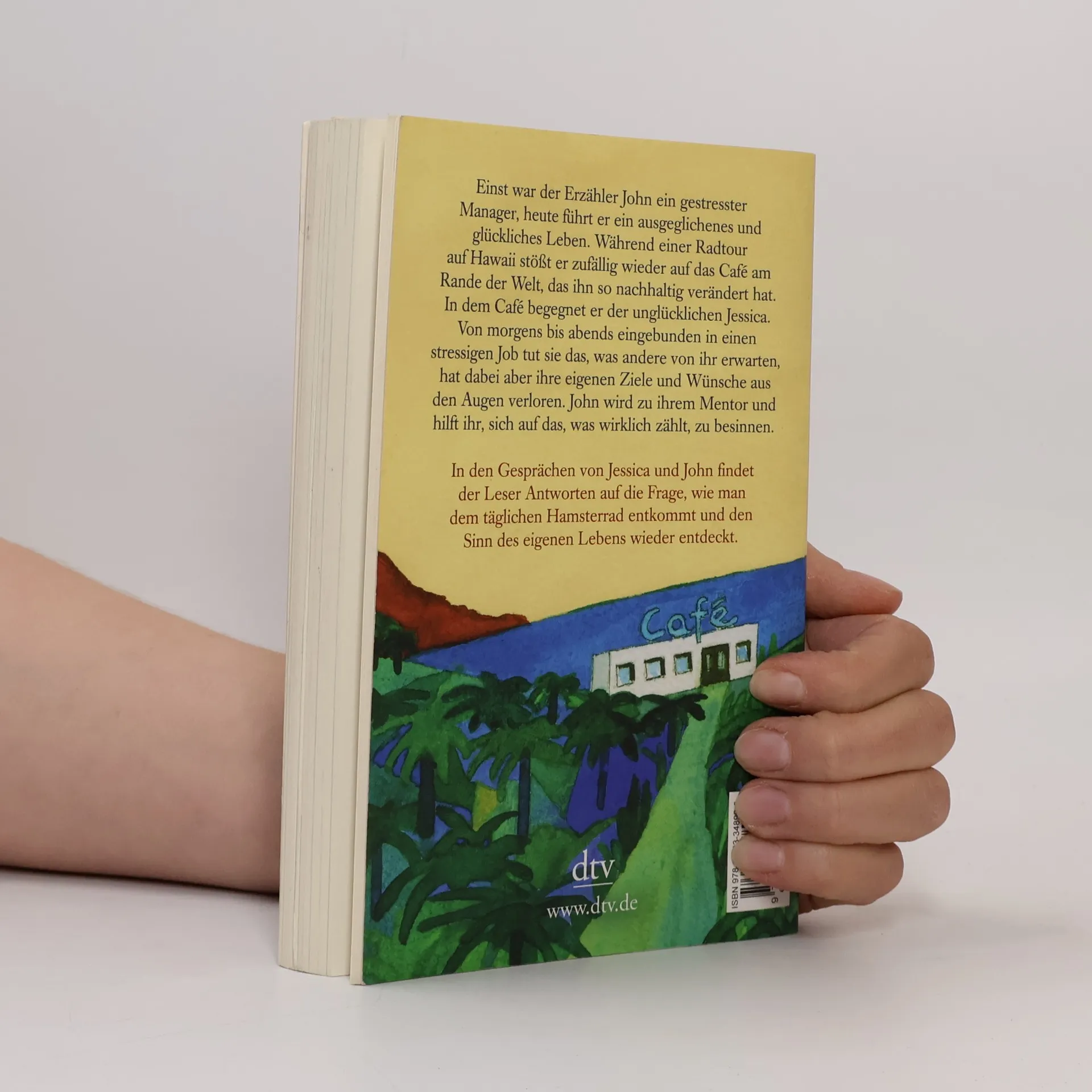 Inspirationen fürs eigene Leben Einst war der Erzähler John ein gestresster Manager, heute führt er ein ausgeglichenes und glückliches Leben. Während einer Radtour auf Hawaii erinnert sich John an den Tag vor zehn Jahren, der sein Leben radikal verändert hat. Damals war er zufällig auf das Café am Rande der Welt gestoßen. Und obwohl er sich an einem völlig anderen Ort befindet, Tausende Kilometer entfernt, sieht er es plötzlich wieder. In dem Café begegnet er Jessica, die unglücklich mit ihrem Leben ist. Eingebunden in ein stressiges Arbeitsleben, tut sie das, was andere von ihr erwarten, hat dabei aber ihre eigenen Ziele und Wünsche aus den Augen verloren. John wird zu ihrem Mentor und hilft ihr, sich auf den Sinn ihres Lebens zu besinnen. In den Gesprächen von Jessica und John findet der Leser Antworten auf die Frage, wie man dem täglichen Hamsterrad entkommt und den Sinn des eigenen Lebens wieder entdeckt. Wunderbar vierfarbig illustriert von Root Leeb.