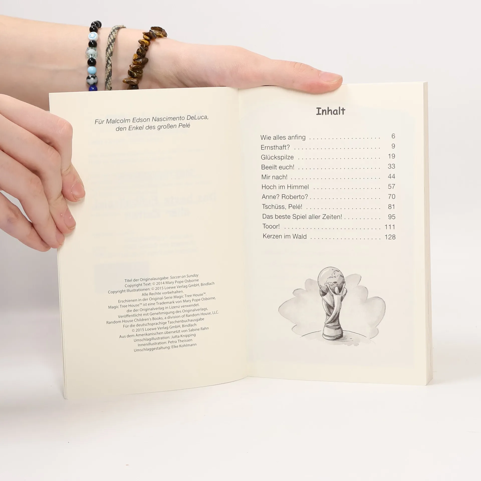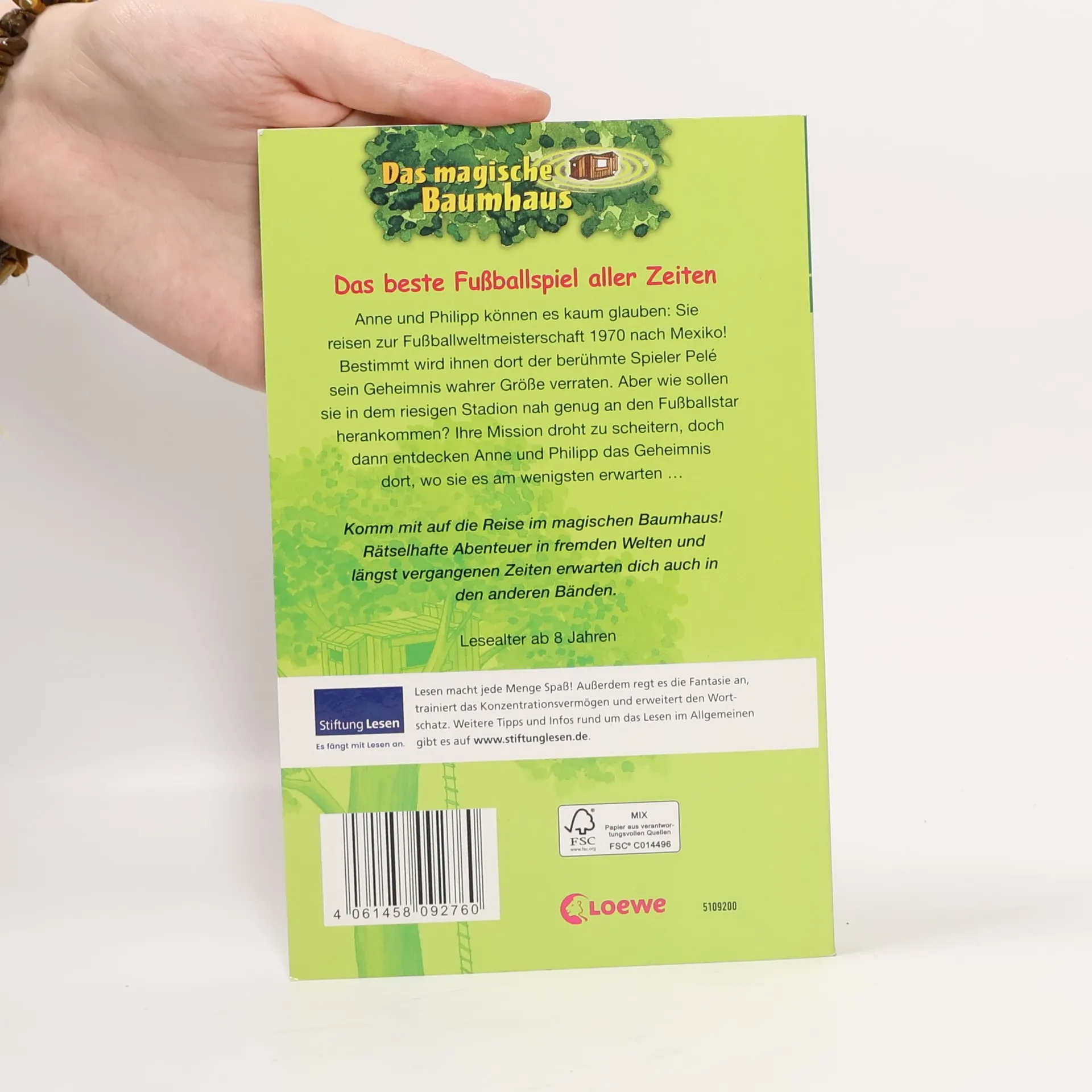 Das Buch ist bei deiner Buchhandlung vor Ort und bei vielen Online-Buchshops erhältlich! + Bücher, die Kinder gerne lesen wollen + Beliebte Themen: Abenteuer, Tiere, fremde Länder und Fußball + Hochwertiges Hardcover + Mit vielen Illustrationen + Bereits über 10 Millionen verkaufte Bücher der Baumhaus-Reihe + Ausgewogenes Text-Bild-Verhältnis + Große Schrift + Kurze Kapitel + Anne und Philipp können es kaum glauben: Sie reisen zur Fußballweltmeisterschaft 1970 nach Mexico! Bestimmt wird ihnen dort der berühmte Spieler Pelé sein Geheimnis wahrer Größe verraten. Aber wie sollen sie in dem riesigen Stadion nah genug an den Fußballstar herankommen? Ihre Mission droht fast zu scheitern, doch dann entdecken Anne und Philipp das Geheimnis wahrer Größe dort, wo sie es am wenigsten erwarten … Komm mit auf die Reise im magischen Baumhaus! Rätselhafte Abenteuer in fremden Welten und längst vergangenen Zeiten erwarten dich auch in den anderen Bänden. Die beliebte Kinderbuch-Reihe von Bestsellerautorin Mary Pope Osborne! Die Geschwister Anne und Philipp reisen mit dem magischen Baumhaus durch die Zeit. Sie erleben spannende Abenteuer, entdecken ferne Länder und lernen viele berühmte Persönlichkeiten kennen. Mehr Infos zur Reihe und tolle Extras unter: www. MagischesBaumhaus. de