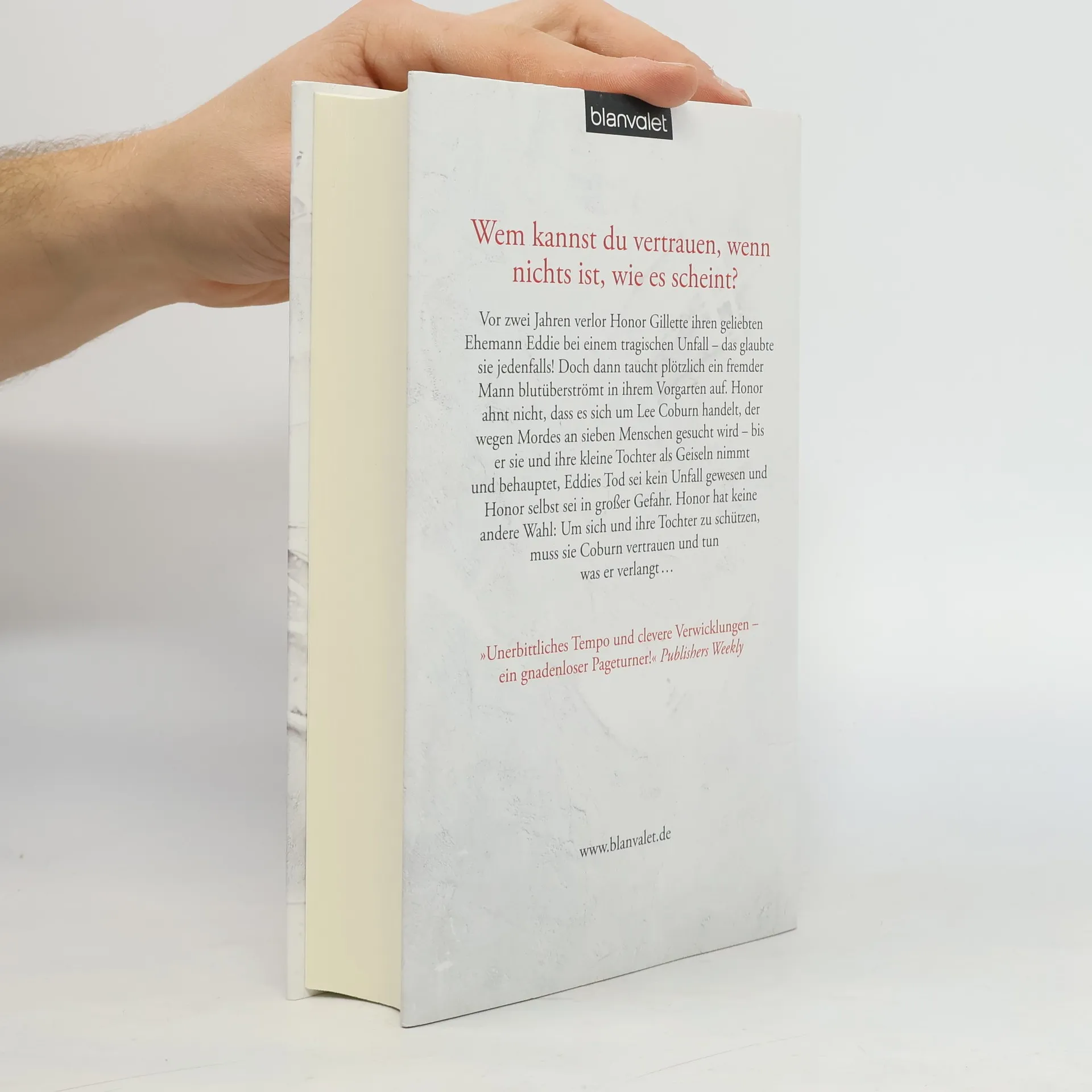 Wem kannst du vertrauen, wenn nichts ist, wie es scheint? Vor zwei Jahren verlor Honor Gillette ihren geliebten Ehemann Eddie bei einem tragischen Unfall – das glaubte sie jedenfalls, als plötzlich ein fremder Mann blutüberströmt in ihrem Vorgarten auftaucht. Honor ahnt nicht, dass es sich um Lee Coburn handelt, der wegen Mordes an sieben Menschen gesucht wird – bis er sie und ihre kleine Tochter als Geiseln nimmt und behauptet, Eddies Tod sei kein Unfall gewesen und Honor selbst sei in großer Gefahr. Honor hat keine andere Wahl: Um sich und ihre Tochter zu schützen, muss sie Coburn vertrauen und tun was er verlangt.