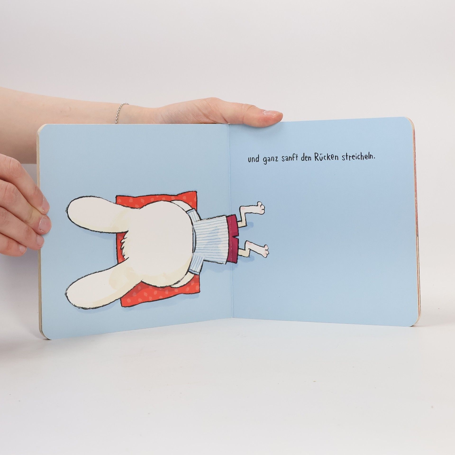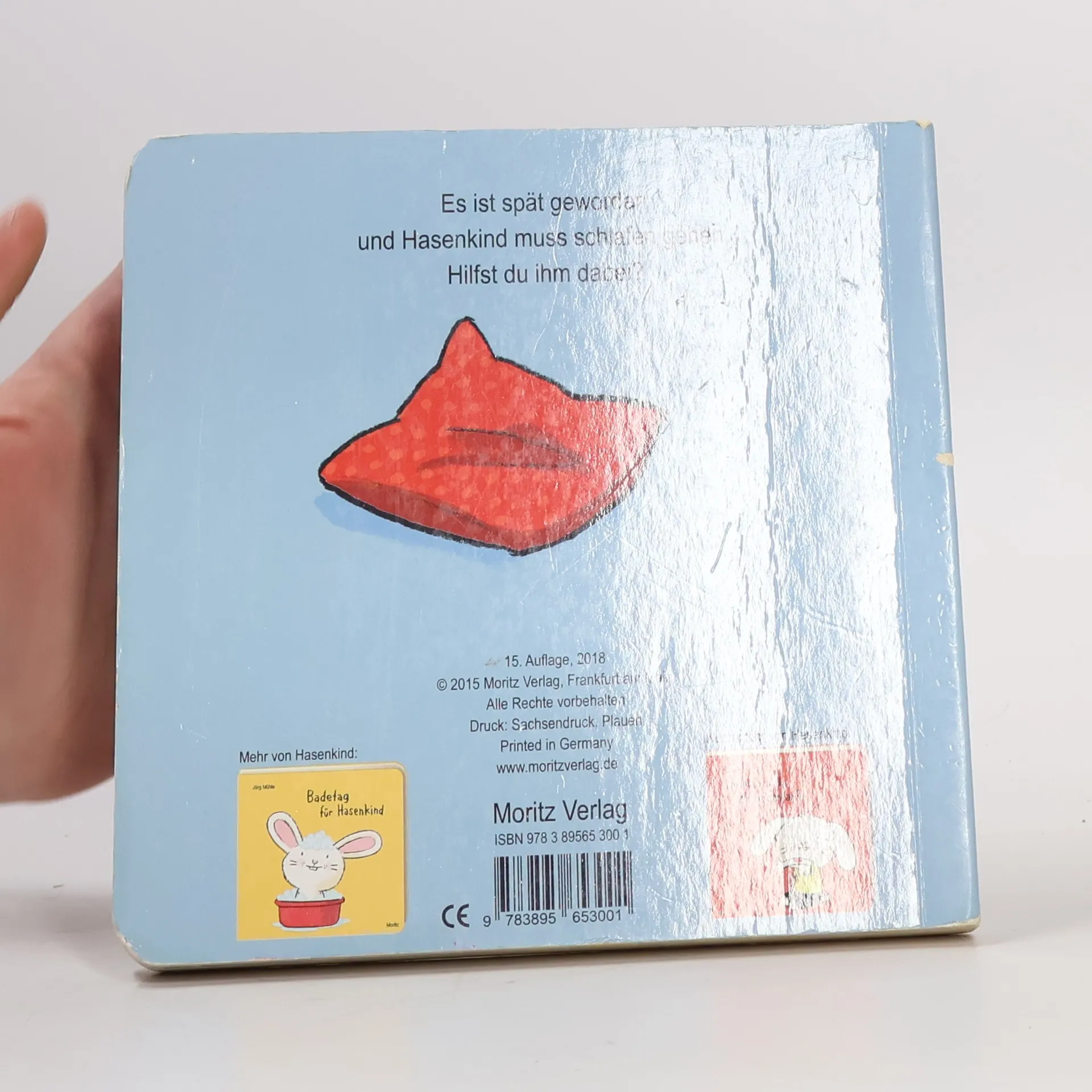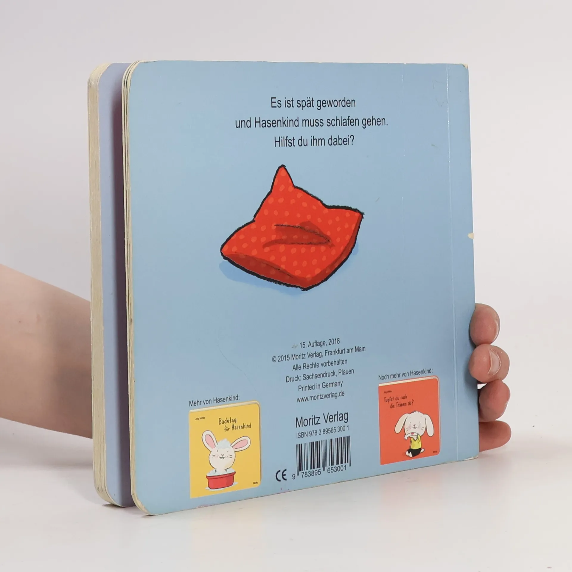Es ist spät geworden: Hasenkind muss ins Bett. Die Zähne sind geputzt, der Schlafanzug liegt bereit. Klatsch in die Hände – schon hat Hasenkind ihn an. Jörg Mühle hat sich ein wunderbares Ritual ausgedacht, mit dem Hasenkind ins Bett gebracht wird: Händeklatschen, Kissen zurechtklopfen, Simsalabim sagen, Ohren kraulen, Rücken streicheln, gut zudecken und schließlich den Schlaf-gut-Kuss geben. Bis es dann auf der letzten Seite heißt: Mach bitte auch noch das Licht aus. Hier ist der Schalter. Dieses interaktive Pappbilderbuch verzaubert alle, die es sehen: Kinder, Eltern, Hasen.