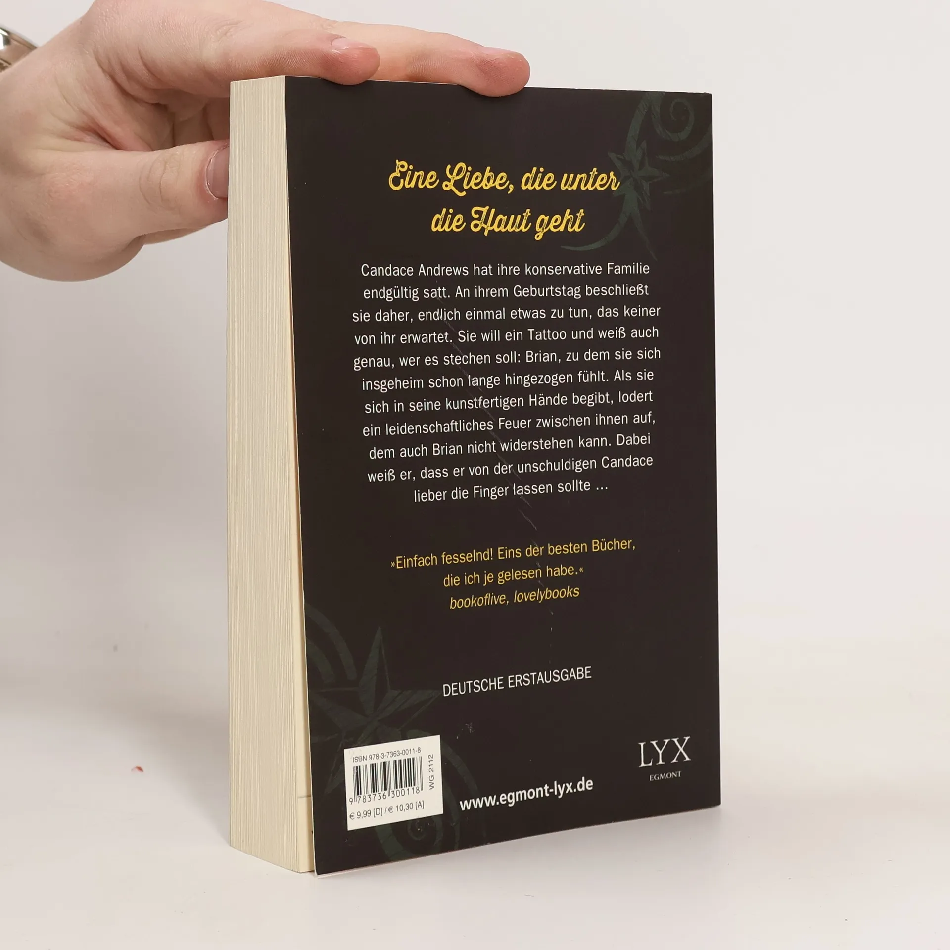 Candace Andrews hat ihre konservative Familie endgültig satt. An ihrem Geburtstag beschließt sie daher, endlich einmal etwas zu tun, das keiner von ihr erwartet. Sie will ein Tattoo und weiß auch genau, wer es stechen soll: Brian, zu dem sie sich insgeheim schon lange hingezogen fühlt. Als sie sich in seine kunstfertigen Hände begibt, lodert ein leidenschaftliches Feuer zwischen ihnen auf, dem auch Brian nicht widerstehen kann. Dabei weiß Brian, dass er von der unschuldigen Candace lieber die Finger lassen sollte - „Einfach fesselnd! Eins der besten Bücher, die ich je gelesen habe.“ bookoflive, lovelybooks