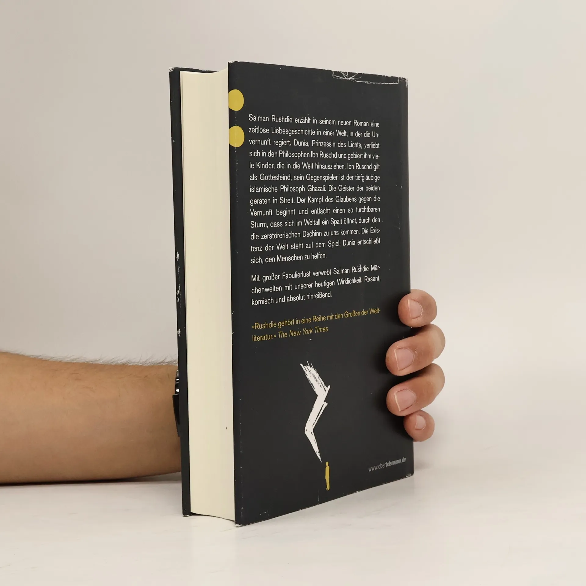 Salman Rushdie erzählt in seinem neuen Roman eine zeitlose Liebesgeschichte in einer Welt, in der die Unvernunft regiert. Dunia, die Fürstin des Lichts, verliebt sich in den Philosophen Ibn Rush und zeugt mit ihm viele Kinder, die in die Welt hinaus ziehen. Ibn Rush gilt als Gottesfeind, sein Gegenspieler ist der tiefgläubige islamische Philosoph Ghazali. Die Geister der beiden geraten in Streit. Der Kampf des Glaubens gegen die Vernunft beginnt und entfacht einen so furchtbaren Sturm, dass sich im Weltall ein Spalt öffnet, durch den die zerstörerischen Dschinn zu uns kommen. Die Existenz der Welt steht auf dem Spiel. Dunia entschließt sich, den Menschen zu helfen. Mit großer Fabulierlust verwebt Salman Rushdie Märchenwelten mit unserer heutigen Wirklichkeit. Rasant, komisch und absolut hinreißend, denn Zwei Jahre, acht Monate und achtundzwanzig Nächte ergeben genau tausendundeine Nacht.