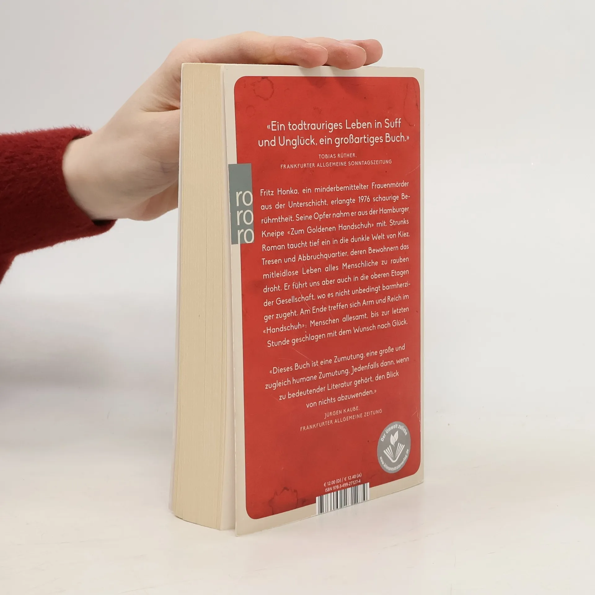 Fritz Honka, ein minderbemittelter Frauenmörder aus der Unterschicht, erlangte 1976 schaurige Berühmtheit. Seine Opfer nahm er aus der Hamburger Kneipe «Zum Goldenen Handschuh» mit. Strunks Roman taucht tief ein in die dunkle Welt von Kiez, Tresen, Abbruchquartier, deren Bewohnern das mitleidlose Leben alles Menschliche zu rauben droht. Er führt uns aber auch in die oberen Etagen der Gesellschaft, wo es nicht unbedingt menschlicher zugeht. Am Ende treffen sich Arm und Reich im «Handschuh»: Menschen allesamt, bis zur letzten Stunde geschlagen mit dem Wunsch nach Glück. Jetzt im Kino, verfilmt von Fatih Akin