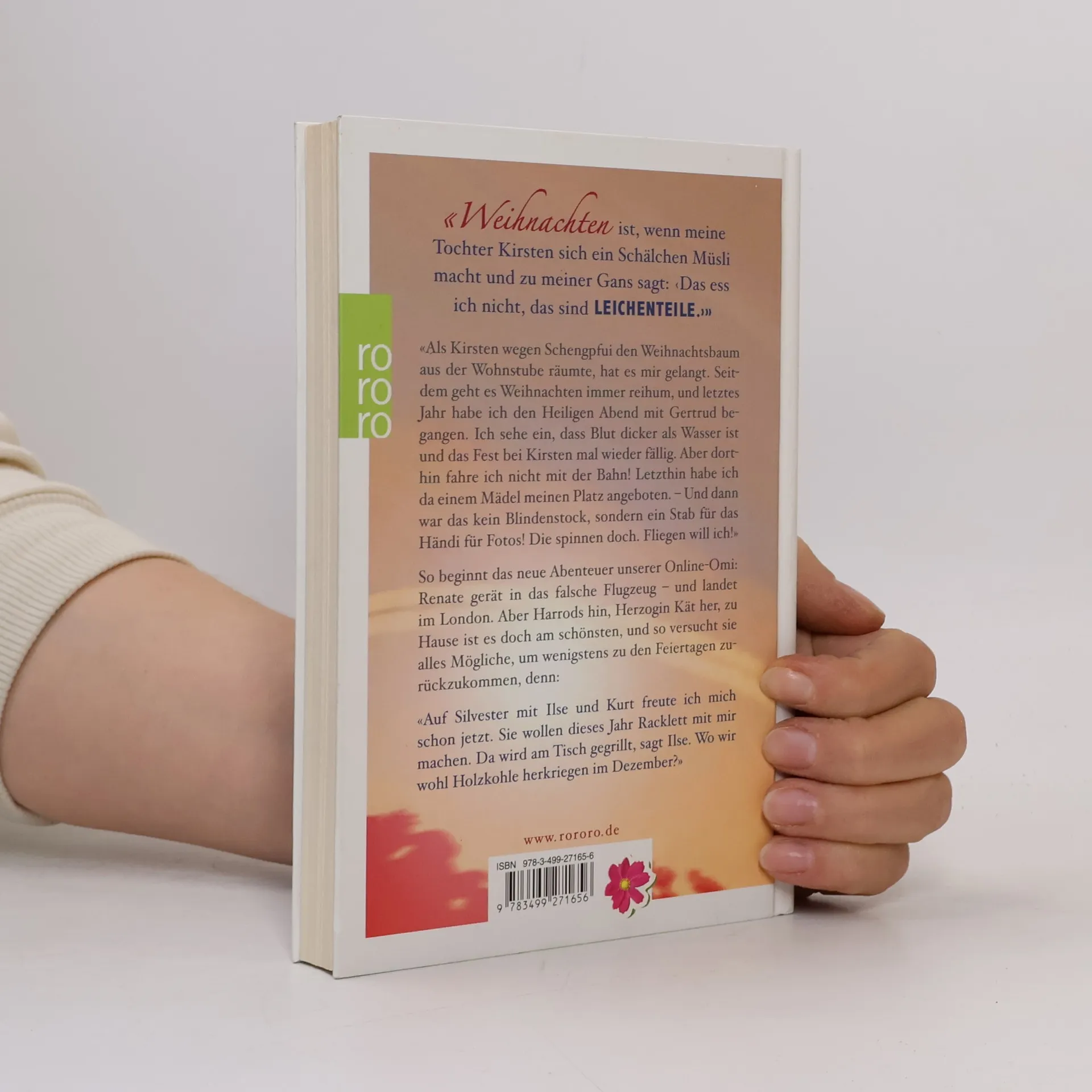 «Weihnachten ist, wenn meine Tochter Kirsten sich ein Schälchen Müsli macht und zu meiner Gans sagt: ‹Das sind LEICHENTEILE.›»«Als Kisten wegen Schengpfui den Weihnachtsbaum aus der Wohnstube räumte, hat es mir gelangt. Seitdem geht es Weihnachten immer reihum, und letztes Jahr habe ich den Heiligen Abend mit Gertrud begangen. Ich sehe ein, dass Blut dicker als Wasser ist und das Fest bei Kirsten mal wieder fällig. Aber dorthin fahre ich nicht mit der Bahn! Letzthin habe ich da einem Mädel meinen Platz angeboten. - Und dann was das kein Blindenstock, sondern ein Stab für das Händi für Fotos! Die spinnen doch. Fliegen will ich!»So beginnt das neue Abenteuer unserer Online-Omi: Renate gerät in das falsche Flugzeug - und landet im London. Aber Harrods hin, Herzogin Kät her, zu Hause ist es doch am schönsten, und so versucht sie alles Mögliche, um wenigstens zu den Feiertagen zurückzukommen, denn:«Auf Silvester mit Ilse und Kurt freute ich mich schon jetzt. Sie wollen dieses Jahr Racklett mit mir machen. Da wird am Tisch gegrillt, sagt Ilse. Wo wir wohl die Holzkohle herkriegen im Dezember?»