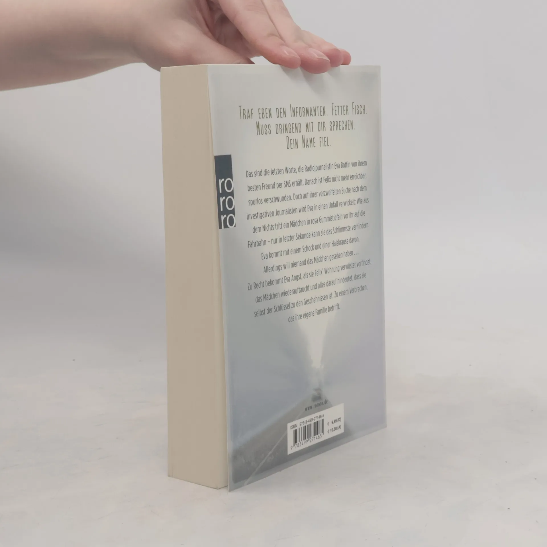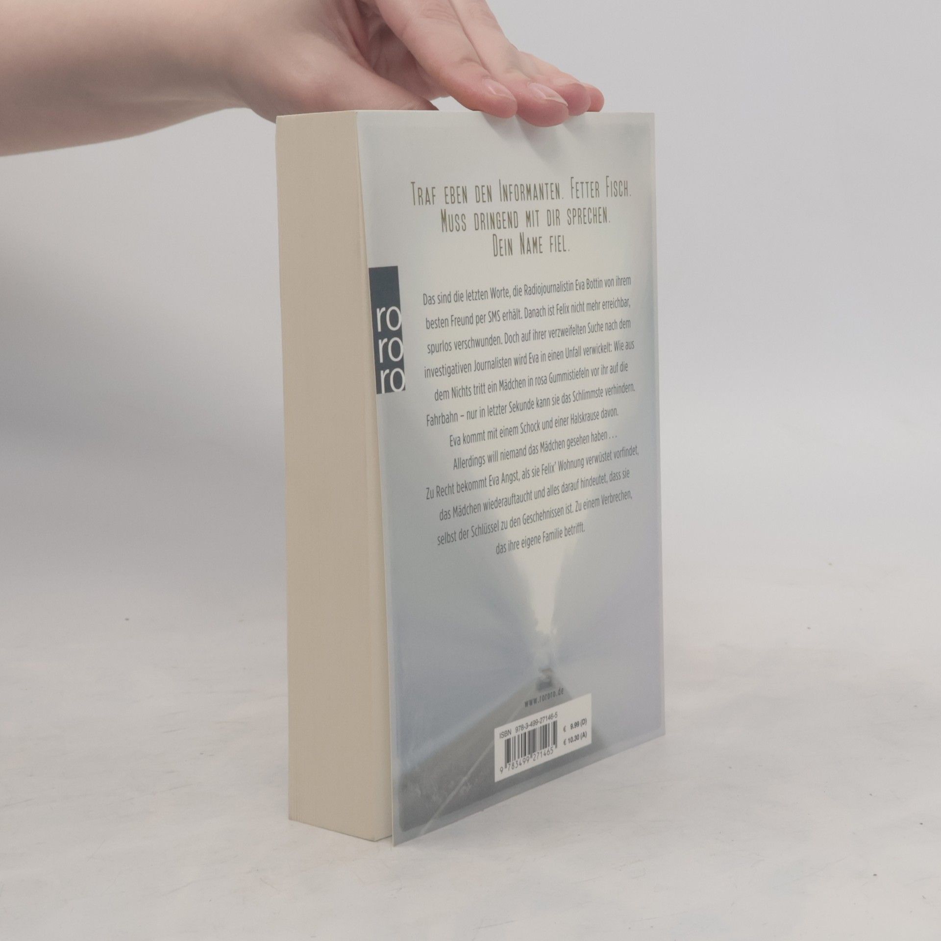 Traf eben den Informanten. Fetter Fisch. Muss dringend mit dir sprechen. Dein Name fiel. Das sind die letzten Worte, die Radiojournalistin Eva Bottin von ihrem besten Freund per SMS erhält. Danach ist Felix nicht mehr erreichbar, spurlos verschwunden. Doch auf ihrer verzweifelten Suche nach dem investigativen Journalisten wird Eva in einen Unfall verwickelt: Wie aus dem Nichts tritt ein Mädchen in rosa Gummistiefeln vor ihr auf die Fahrbahn - nur in letzter Sekunde kann sie das Schlimmste verhindern. Eva kommt mit einem Schock und einer Halskrause davon. Allerdings will niemand das Mädchen gesehen haben...Zurecht bekommt Eva Angst, als sie Felix‘ Wohnung verwüstet vorfindet, das Mädchen wieder auftaucht, und alles darauf hindeutet, dass sie selbst der Schlüssel zu den Geschehnissen ist. Zu einem Verbrechen, das ihre eigene Familie betrifft.