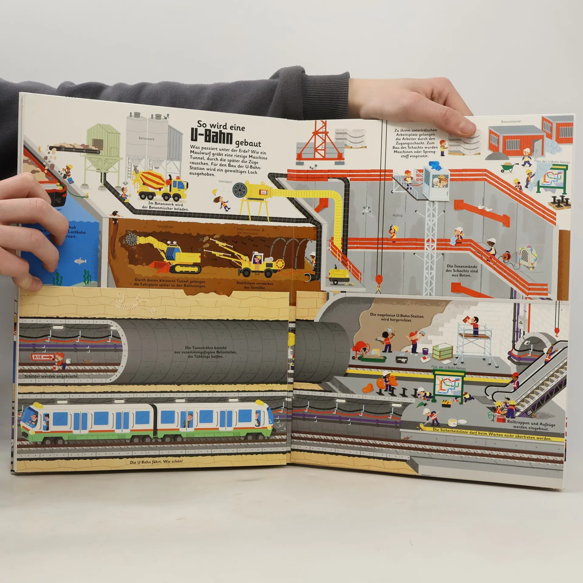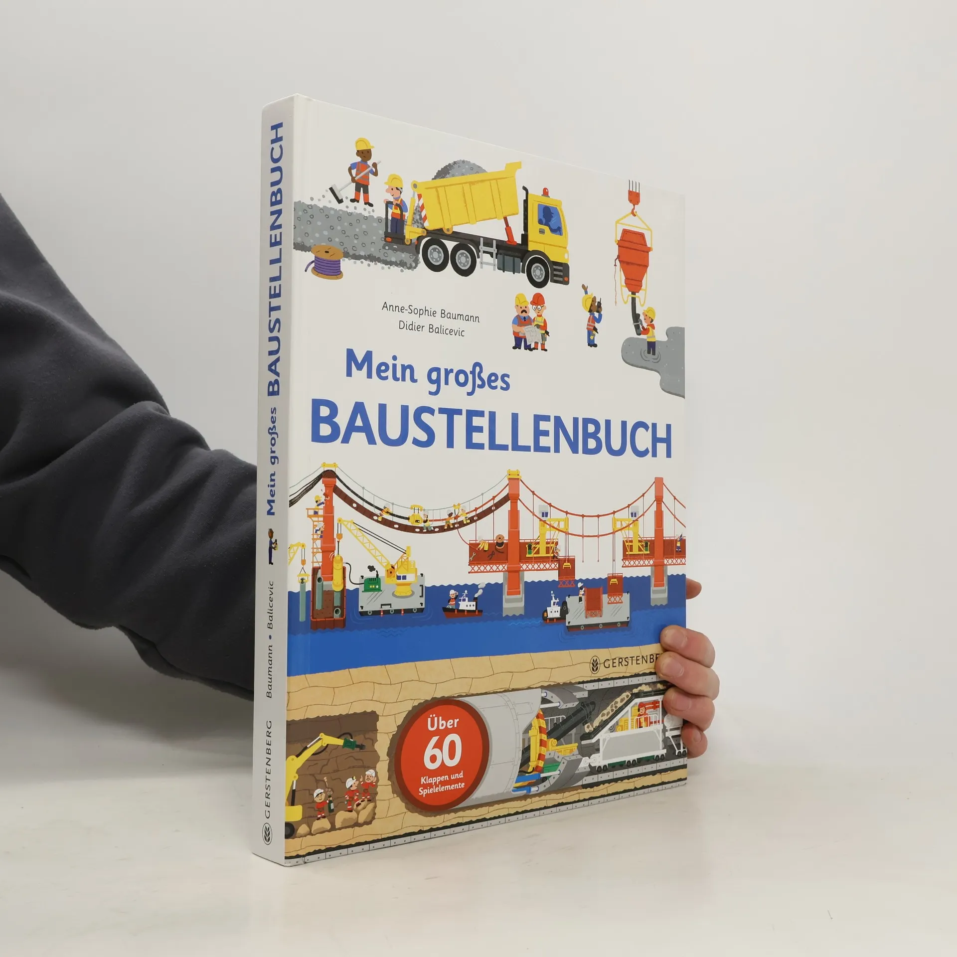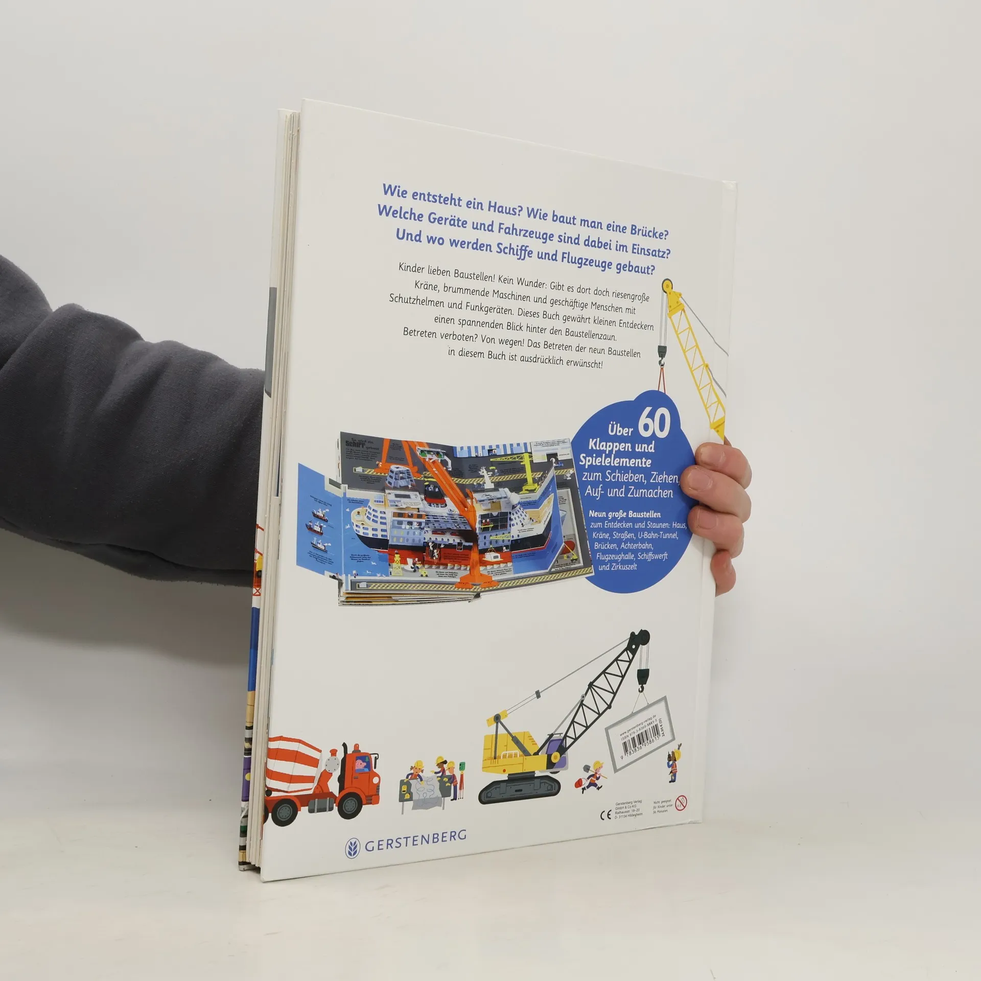 Wie entsteht ein Haus? Wie baut man eine Brücke? Welche Geräte und Fahrzeuge sind dabei im Einsatz? Und wo werden Schiffe und Flugzeuge gebaut? Kinder lieben Baustellen! Kein Wunder: Gibt es dort doch riesengroße Kräne, brummende Maschinen und geschäftige Menschen mit Schutzhelmen und Funkgeräten. Dieses Buch gewährt kleinen Entdeckern einen spannenden Blick hinter den Baustellenzaun! Neun große Baustellen laden ein zum Entdecken und Staunen: Haus- und Straßenbau, Kräne, U-Bahn, Brücken, Achterbahn, Flugzeughalle, Schiffswerft und Zirkuszelt. Über 60 Klappen und Spielelemente zum Schieben, Ziehen, Auf- und Zumachen machen das Buch zu einer interaktiven Baustelle für kleine Entdecker - und Experten aus renommierten Bauunternehmen haben das Buch fachlich geprüft! Achtung! Nicht geeignet für Kinder unter 36 Monaten.