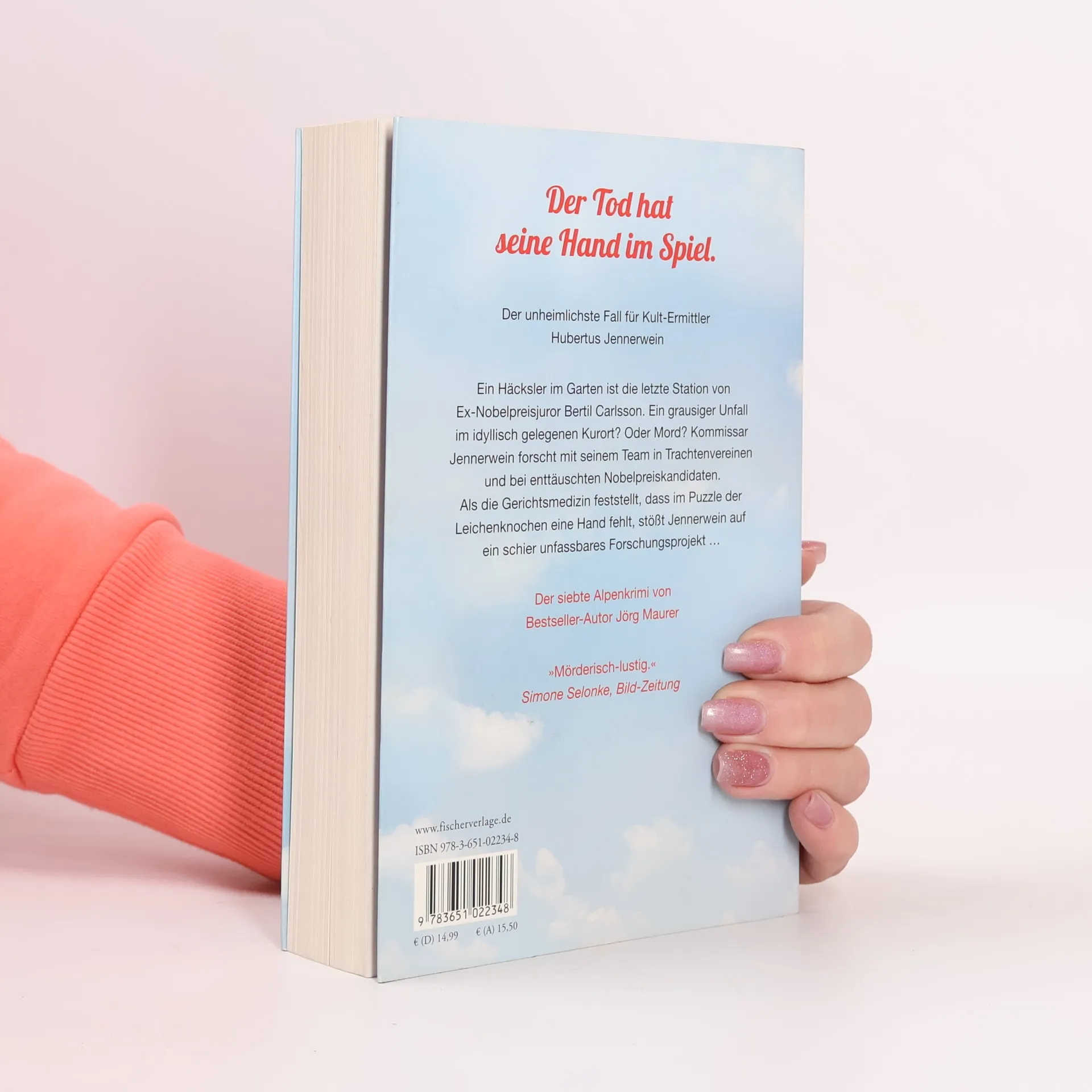 Der Tod hat seine Hand im Spiel. Der unheimlichste Fall von Kult-Ermittler Hubertus Jennerwein Der siebte Alpenkrimi von Bestseller-Autor Jörg Maurer Im idyllisch gelegenen Kurort fühlt sich Bertil Carlsson, ehemaliges Mitglied der Nobelpreisjury für Medizin, ganz zu Hause, ist seit Jahren im Trachten- und Heimatverein. Gerade hat er noch im Garten gearbeitet. Kurz danach macht seine Frau einen grausigen Fund – im großen Häcksler. War es ein Unfall? Oder doch Mord? Kommissar Jennerwein und sein bewährtes Team forschen unter hartleibigen Brauchtumswächtern und neidischen Nobelpreiskandidaten. Da meldet die Gerichtsmedizin: im Puzzle der Leichenknochen fehlt eine Hand. Als Jennerwein nach ähnlichen Fällen sucht und ein gruseliges Forschungsprojekt entdeckt, zweifelt er, ob er diesen Fall in den Griff bekommen wird…