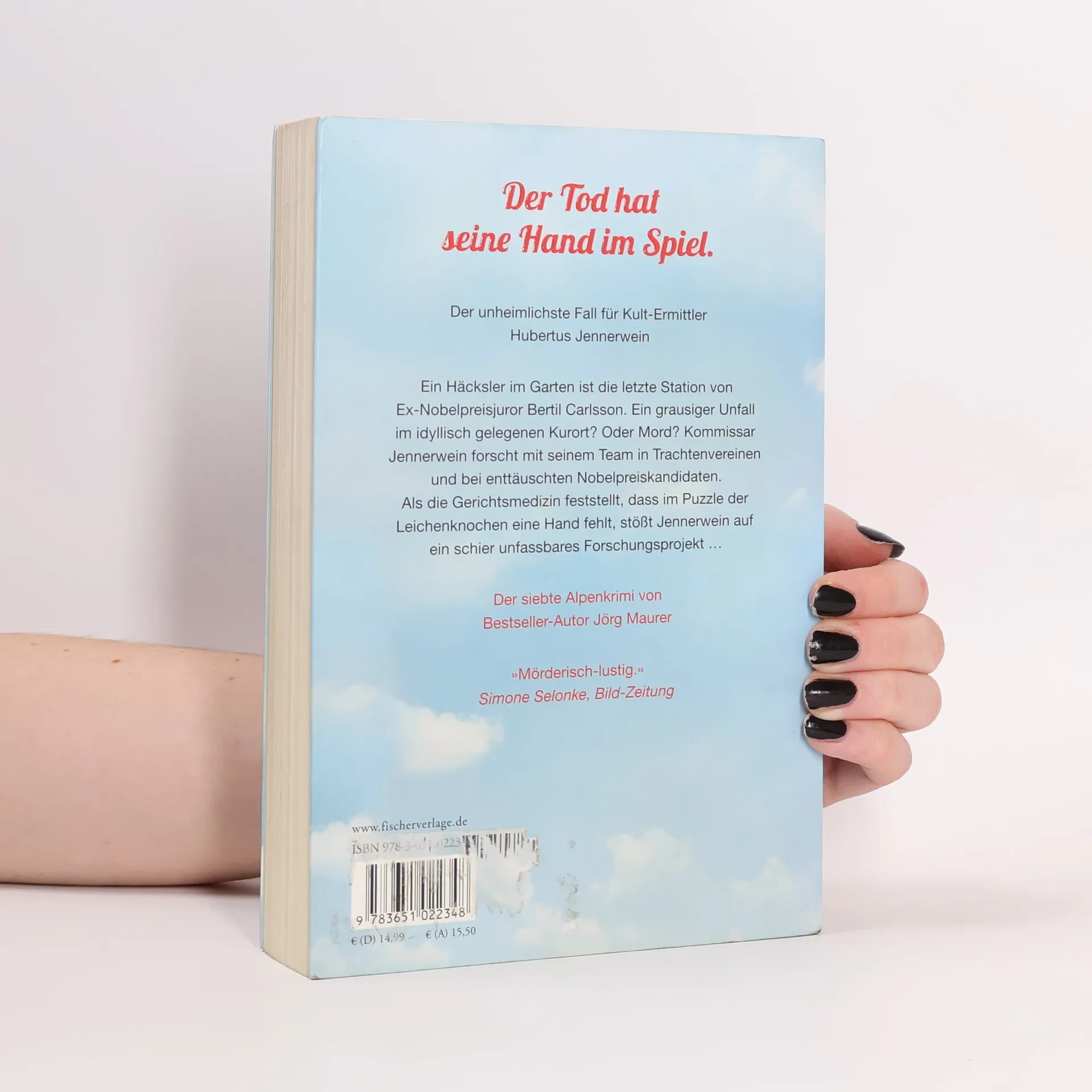 Der Tod hat seine Hand im Spiel. Der unheimlichste Fall von Kult-Ermittler Hubertus Jennerwein Der siebte Alpenkrimi von Bestseller-Autor Jörg Maurer Im idyllisch gelegenen Kurort fühlt sich Bertil Carlsson, ehemaliges Mitglied der Nobelpreisjury für Medizin, ganz zu Hause, ist seit Jahren im Trachten- und Heimatverein. Gerade hat er noch im Garten gearbeitet. Kurz danach macht seine Frau einen grausigen Fund – im großen Häcksler. War es ein Unfall? Oder doch Mord? Kommissar Jennerwein und sein bewährtes Team forschen unter hartleibigen Brauchtumswächtern und neidischen Nobelpreiskandidaten. Da meldet die Gerichtsmedizin: im Puzzle der Leichenknochen fehlt eine Hand. Als Jennerwein nach ähnlichen Fällen sucht und ein gruseliges Forschungsprojekt entdeckt, zweifelt er, ob er diesen Fall in den Griff bekommen wird…