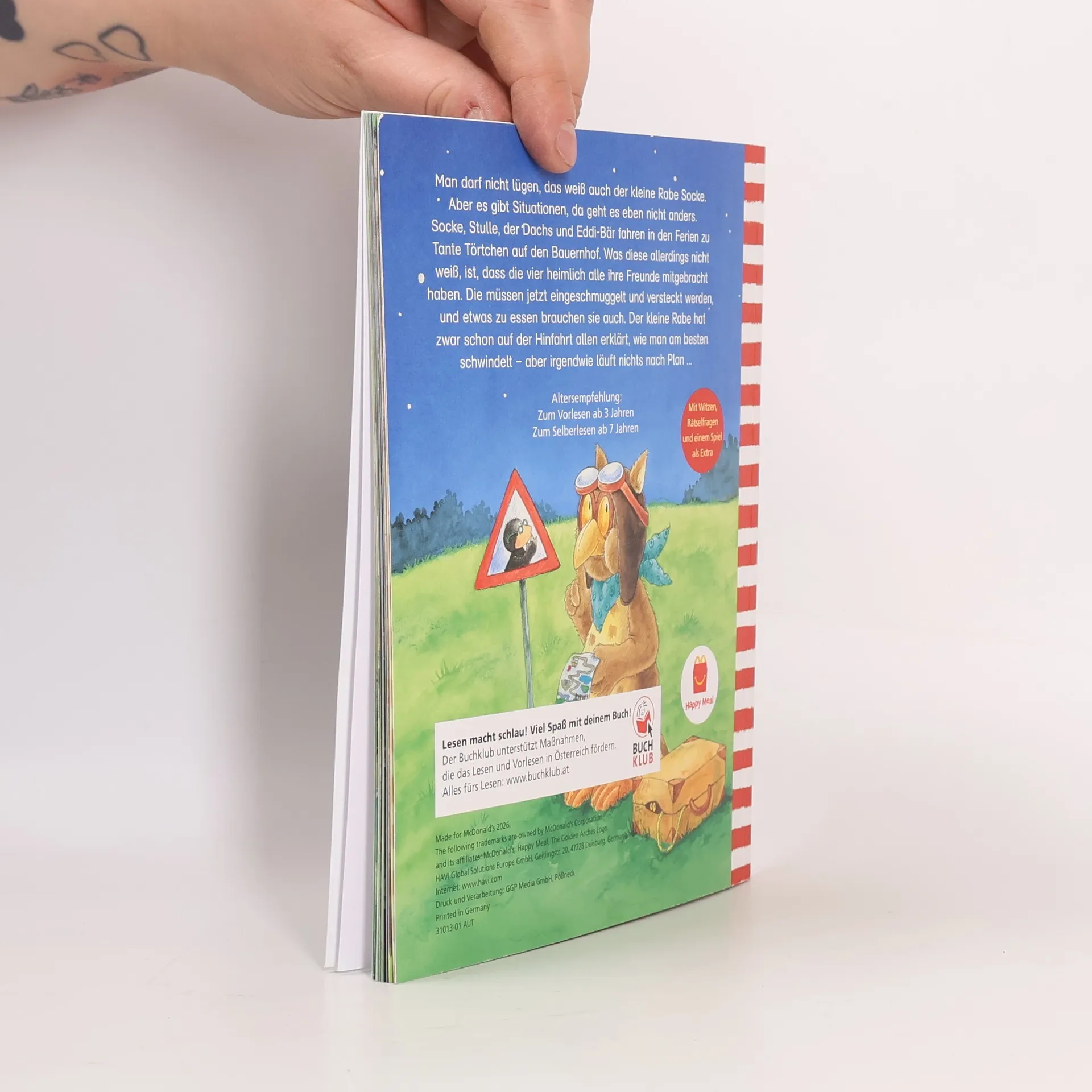Man darf nicht lügen, das weiß auch der kleine Rabe Socke. Aber es gibt Situationen, da geht es eben nicht anders. Socke, Stulle, der Dachs und Eddi-Bär fahren in den Ferien zu Tante Törtchen auf den Bauernhof. Was diese allerdings nicht weiß, ist, dass die vier heimlich alle ihre Freunde mitgebracht haben. Die müssen jetzt eingeschmuggelt und versteckt werden, und etwas zu essen brauchen sie auch. Der kleine Rabe hat zwar schon auf der Hinfahrt allen erklärt, wie man am besten schwindelt – aber irgendwie läuft nichts nach Plan … Als Sonderausgabe zum 20jährigen Jubiläum des kleinen Raben Socke mit einem bekannten Kinderlied und Rabenstrophe als Extra!