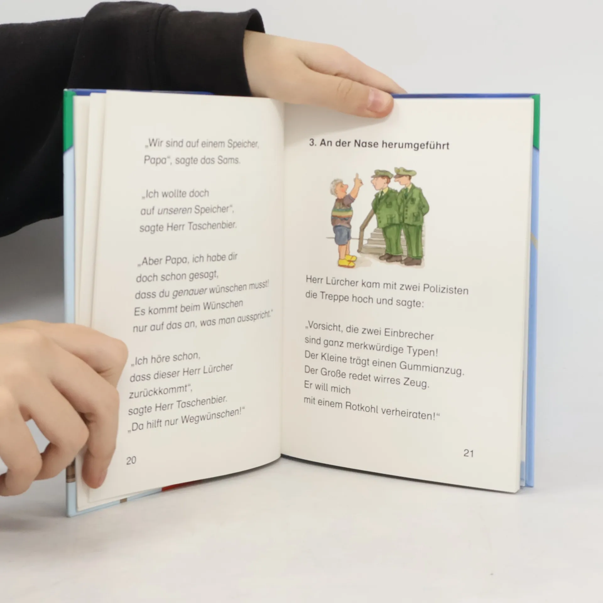 Verrückte Welt: Die Wunschmaschine stiftet Chaos! Oh nein: Die Wunschpunkte im Gesicht des Sams verschwinden! Höchste Zeit, dass Herr Taschenbier seine Wunschmaschine fertigstellt! Die hat er auf dem Dachboden von Frau Rotkohl versteckt. Auf dem schnellsten Weg wünscht er sich und das Sams dorthin. Doch die beiden landen auf dem falschen Dachboden und stehen einem aufgebrachten Hausmeister gegenüber. Zum Glück können das Sams und Herr Taschenbier durch einen weiteren Wunsch entkommen und landen bei der Wunschmaschine. Endlich kann Herr Taschenbier sie ausprobieren, und was wünscht er sich als Erstes? Ganz viel Geld! Es klappt, und überall im Zimmer finden sich Münzen und Geldscheine wieder: nur in der falschen Währung. In „Das Sams und die Wunschmaschine“ sind erstmals farbige Illustrationen von Paul Maar abgebildet.