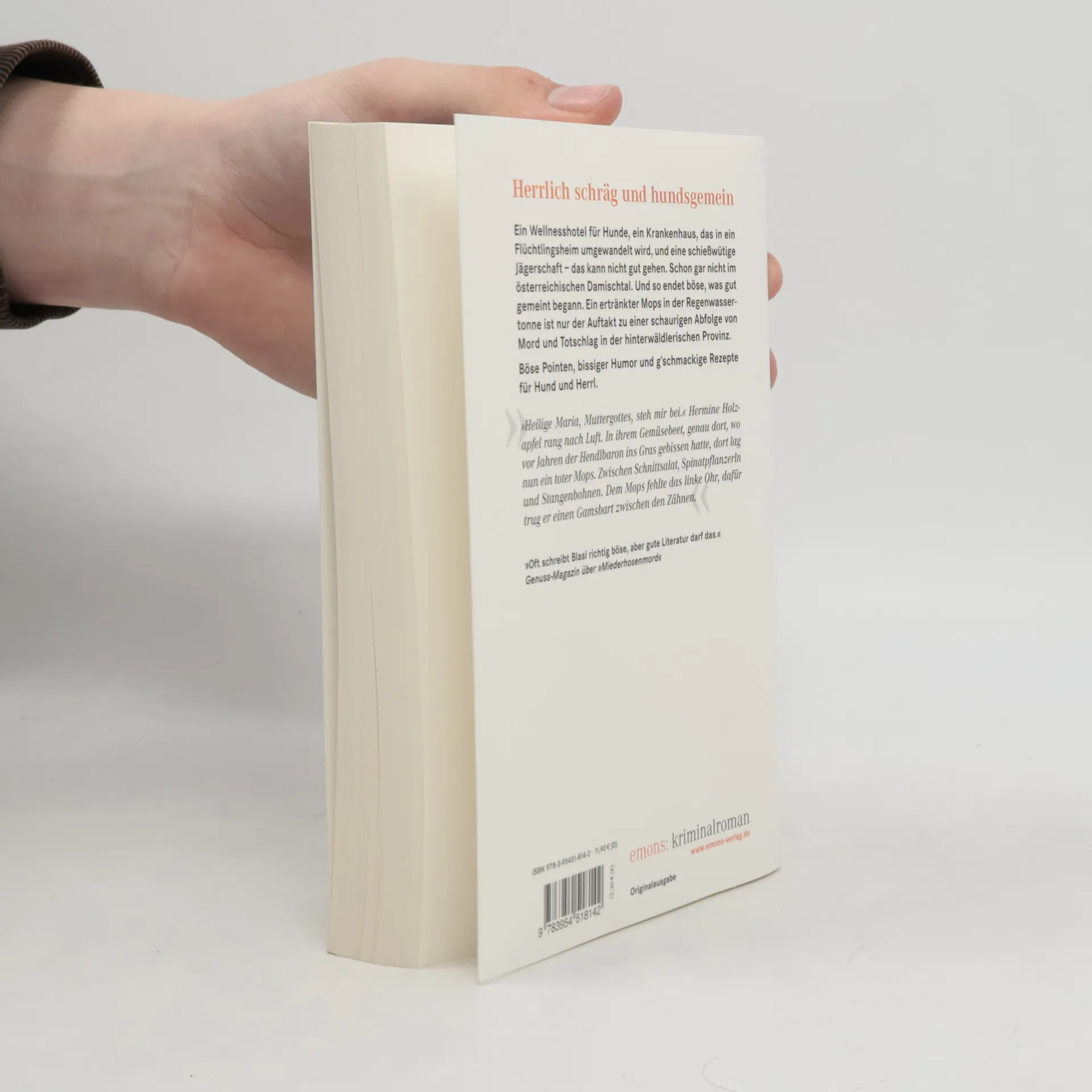 Ein Wellnesshotel für Hunde, ein Krankenhaus, das in ein Flüchtlingsheim umgewandelt wird, und eine schießwütige Jägerschaft – das kann nicht gut gehen. Schon gar nicht im österreichischen Damischtal. Und so endet böse, was gut gemeint begann. Ein ertränkter Mops in der Regenwassertonne ist nur der Auftakt zu einer schaurigen Abfolge von Mord und Totschlag in der hinterwäldlerischen Provinz. Böse Pointen, bissiger Humor und g’schmackige Rezepte für Hund und Herrl.