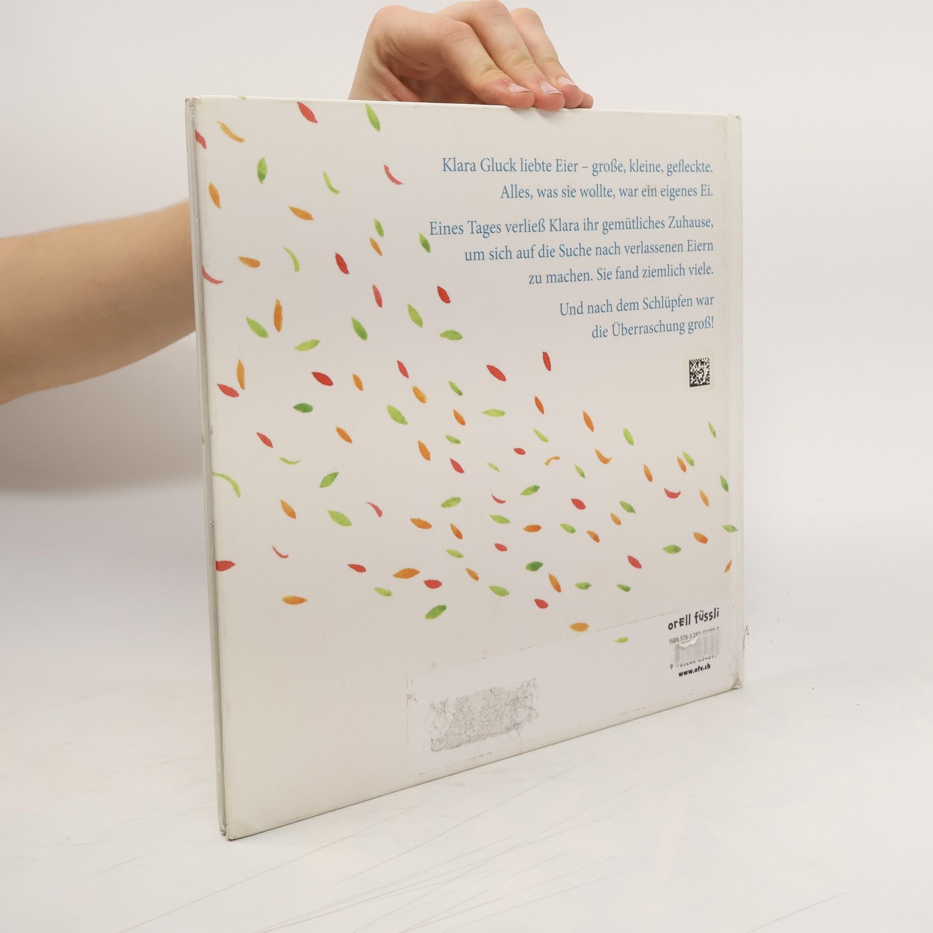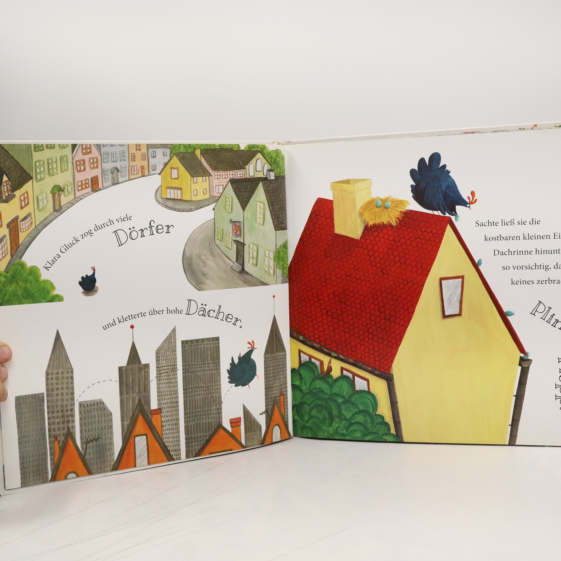 Ach du dickes Ei! Klara Gluck ist traurig. Aus ihrem einzigen Ei ist kein Küken geschlüpft. Aber Klara gibt nicht auf: Sie beschließt, alle verwaisten Eier dieser Welt zu adoptieren. Die Suche beginnt! Ihre abenteuerliche Reise führt Klara über das weite Meer, von Dorf zu Dorf, durch riesige Städte, über Berge und Täler und durch dunkle Höhlen. Sie überwindet Feuer, Sturm und Eis – und sie findet viele Eier, in allen Größen und Farben! Wieder daheim, beginnt Klara Gluck, den großen Eierberg auszubrüten. Und endlich ist es so weit, die Eier knacken und krachen und gehen auf, und Klara Gluck staunt nicht schlecht, als sie sieht, was da alles schlüpft ...