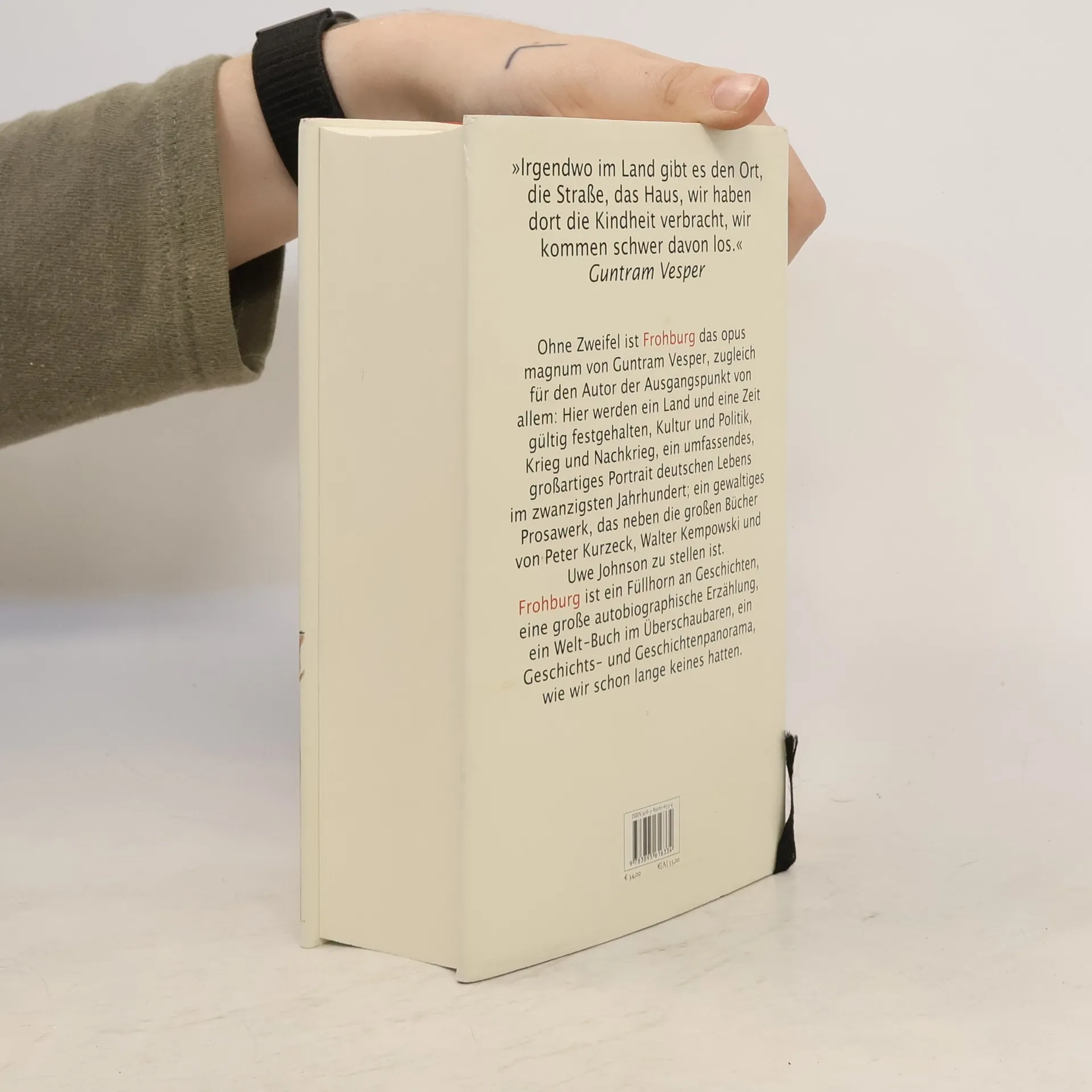 »Frohburg« ist ohne Zweifel das opus magnum von Guntram Vesper, zugleich für den Autor der Ausgangspunkt von allem: Der Ort seiner Geburt 1941, Jugend, Aufwachsen und Erwachen, die Flucht der Familie 1957, das umliegende Land die Folie der Geschichtsbetrachtung einer deutschen Epoche. Hier werden ein Land und eine Zeit gültig festgehalten, Kultur und Politik, Krieg und Nachkrieg, ein umfassendes, großartiges Portrait deutschen Lebens im zwanzigsten Jahrhundert; ein gewaltiges Prosawerk, das neben die großen Bücher von Peter Kurzeck, Walter Kempowski und Uwe Johnson zu stellen ist. FROHBURG ist ein Füllhorn an Geschichten, zumeist aus eigenem Erleben grundiert, eine große autobiographische Erzählung, ein Welt-Buch im Überschaubaren, ein Geschichts- und Geschichtenpanorama, wie wir schon lange keines hatten.