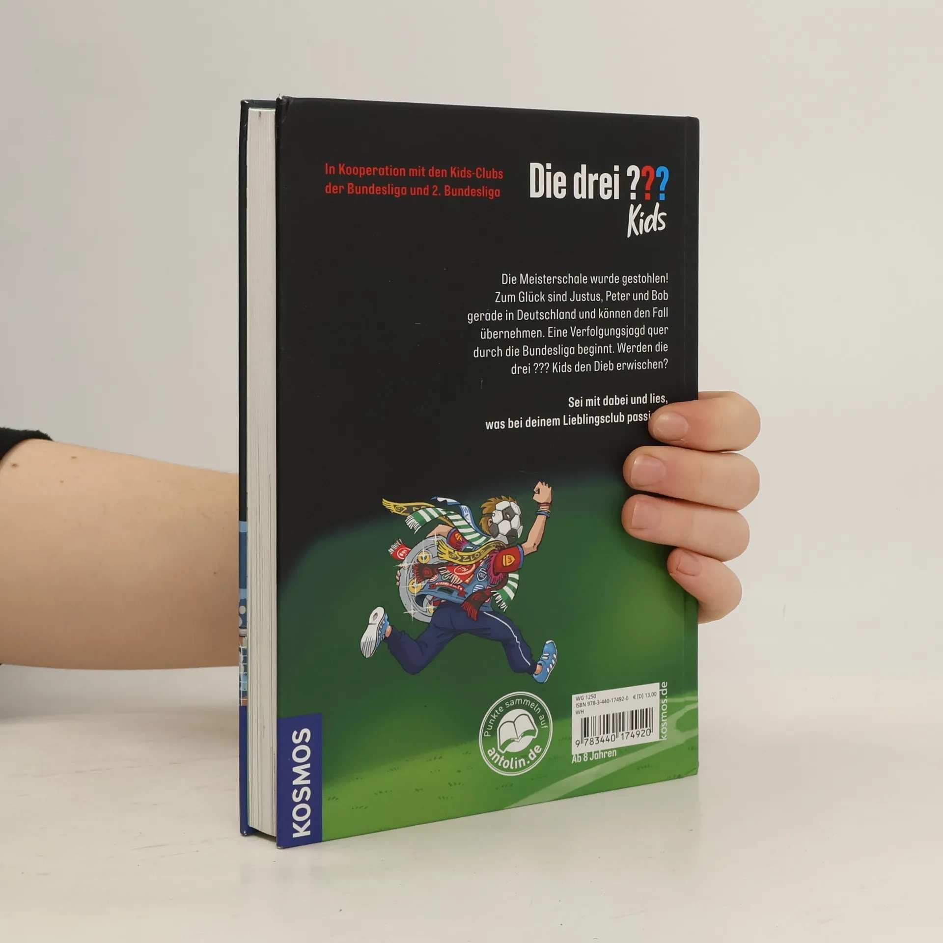 Justus, Peter und Bob machen gemeinsam mit Tante Mathilda und Onkel Titus eine Deutschlandreise. Dabei geraten sie mitten in einen Fall, der sie zu 27 Vereinen der Bundesliga führt: Die Meisterschale wurde gestohlen! Glücklicherweise sind Justus, Peter und Bob gerade vor Ort und können den Fall übernehmen. Der wahnsinnige Dieb jagt die drei ??? Kids quer durch die Bundesliga, vom Hamburger SV bis zum FC Bayern, von Eintracht Braunschweig bis zum VfB Stuttgart. In insgesamt 27 Fußballclubs müssen die Kult-Detektive vor Ort ermitteln. Werden sie den dreisten Dieb erwischen? Bundesliga club logos and DFL logos are protected trademarks of the respective clubs/organisations and are used with the kind permission of the respective owners. Manufactured under license from the DFL/Ligaverband in sole responsibility of Franckh-Kosmos Verlags-GmbH & Co. KG