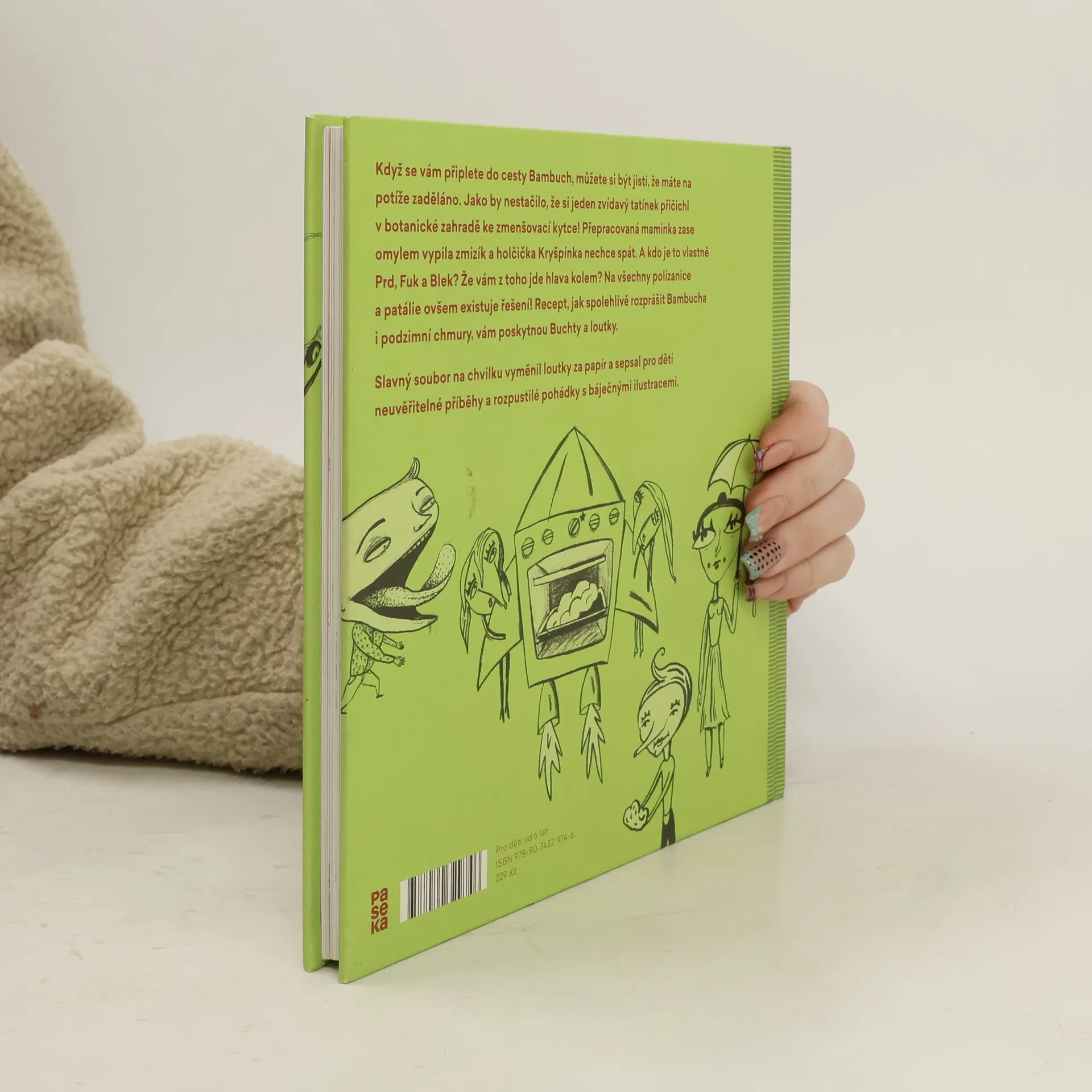 Když se vám připlete do cesty Bambuch, můžete si být jisti, že máte na potíže zaděláno. Jako by nestačilo, že si jeden zvídavý tatínek přičichl v botanické zahradě ke zmenšovací kytce! Přepracovaná maminka zase omylem vypila zmizík a holčička Kryšpínka nechce spát. A kdo je to vlastně Prd, Fuk a Blek? Že vám z toho jde hlava kolem? Na všechny polízanice a patálie ovšem existuje řešení! Recept, jak spolehlivě rozprášit Bambucha i podzimní chmury, vám poskytnou Buchty a loutky. Slavný soubor na chvilku vyměnil loutky za papír a sepsal pro děti neuvěřitelné příběhy a rozpustilé pohádky s báječnými ilustracemi.