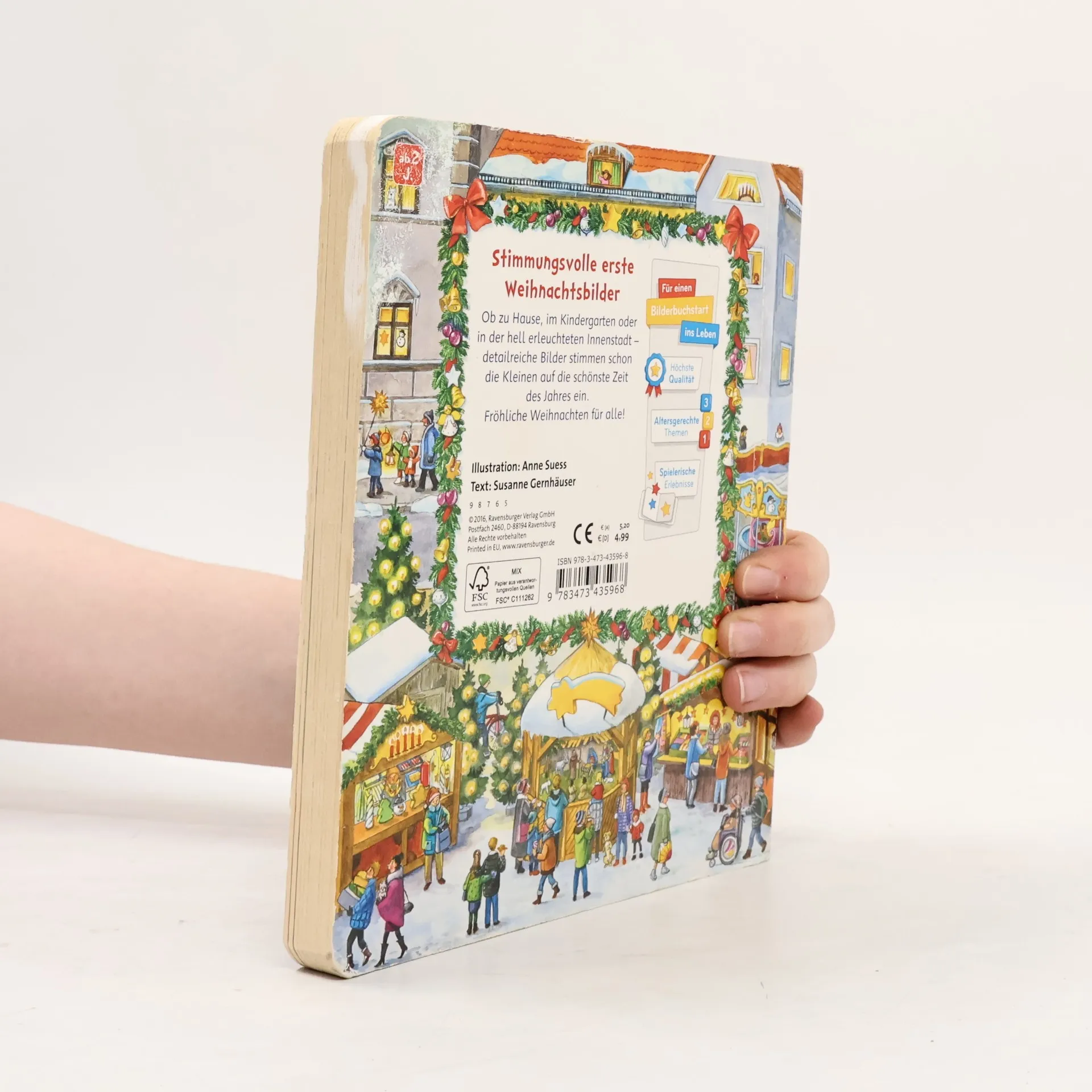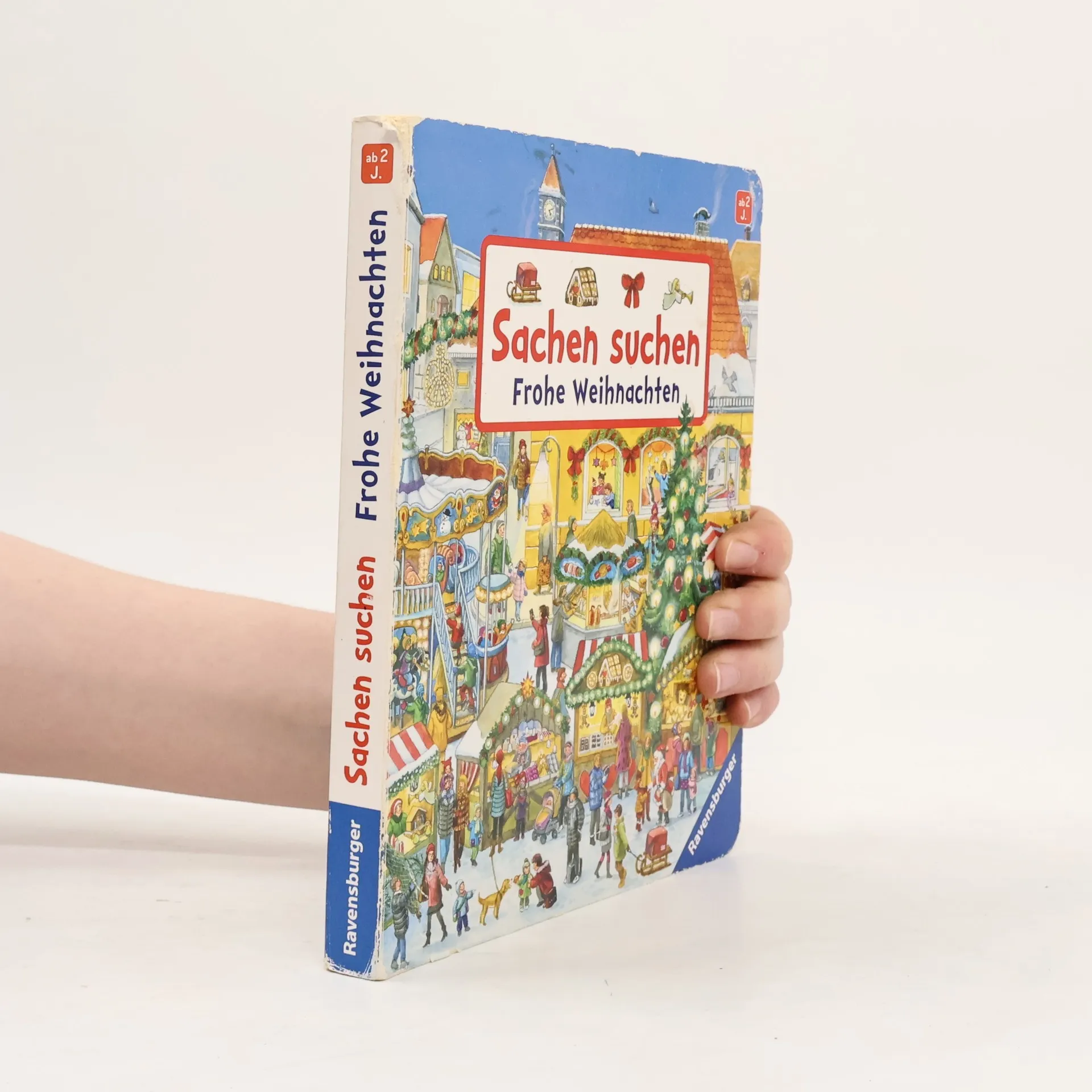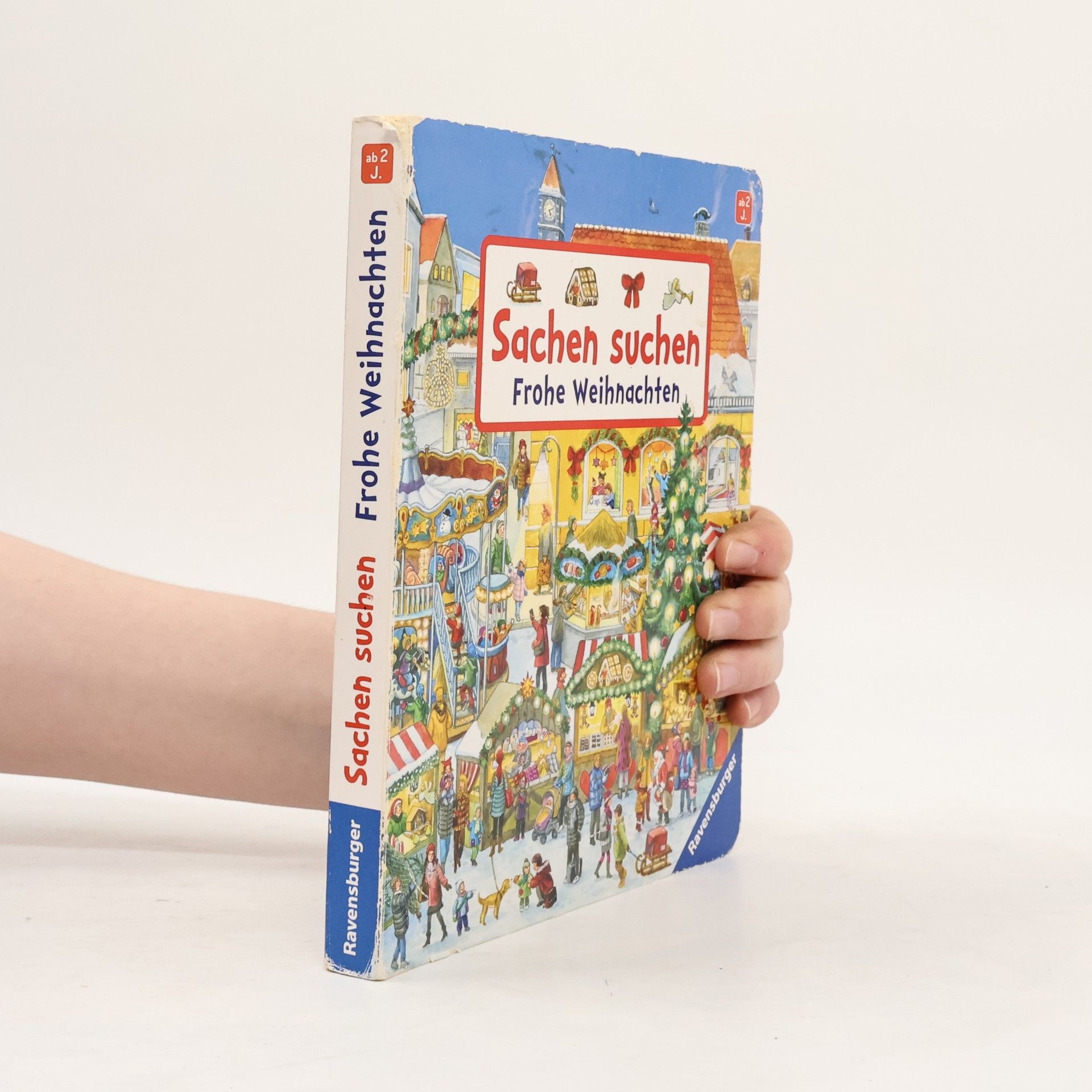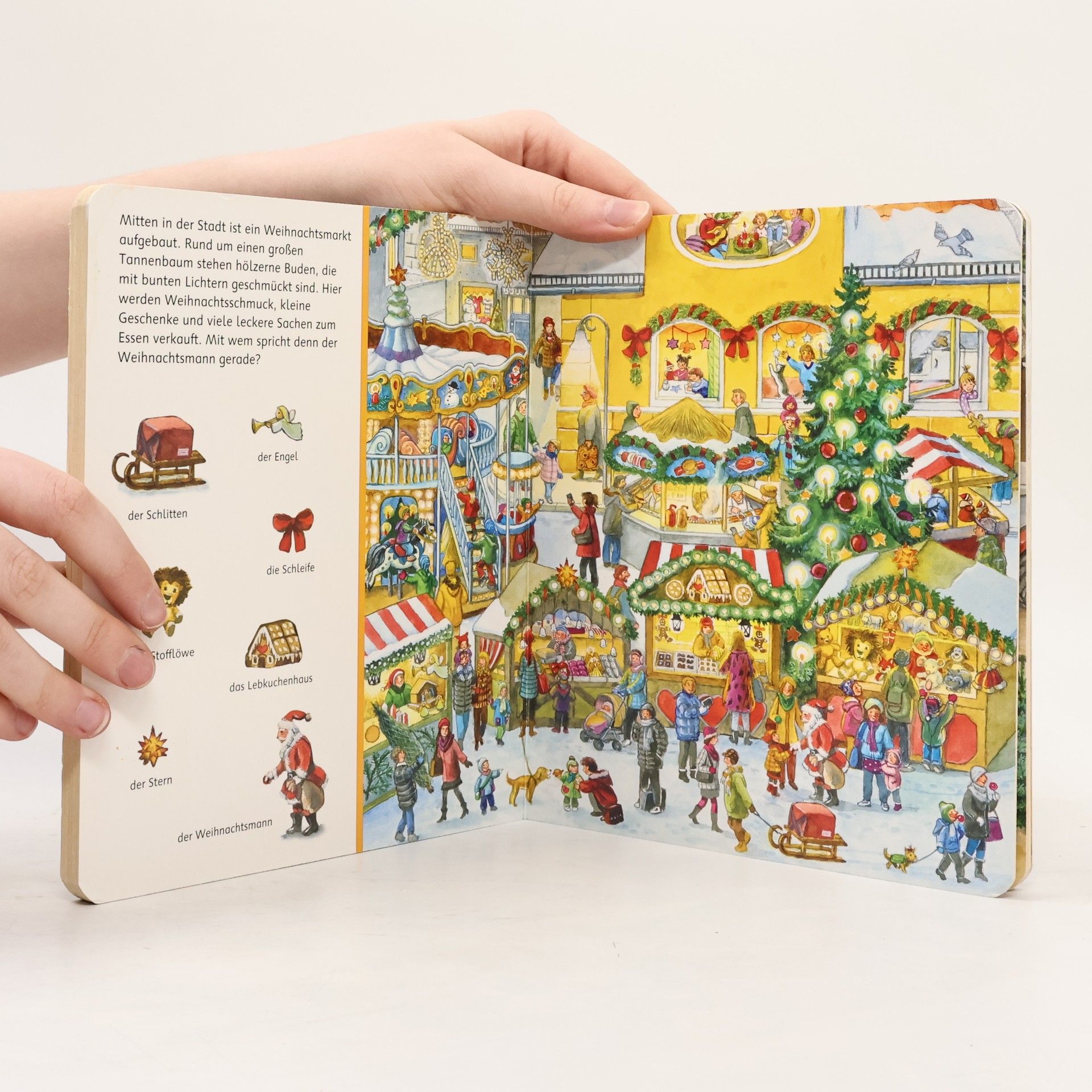 Mit „Sachen suchen“ Weihnachten feiern. Elf stimmungsvoll illustrierte Weihnachtsbilder stimmen auf die schönste Zeit des Jahres ein. Überall geht es ganz weihnachtlich zu. Im Kindergarten wird gebastelt und zu Hause gebacken. Auf den Straßen in der Innenstadt leuchten die Lichter und auf dem Weihnachtsmarkt kann man einen Tannenbaum für das Fest kaufen. Das beliebte und kinderleichte Suchprinzip mit den kleinen Bildern an den Seitenrändern macht großen Spaß und unterstützt die Konzentrationsfähigkeit. Ein ideales Familienbuch zur Vorbereitung und Einstimmung auf das Weihnachtsfest. Alle Jahre wieder! Elf stimmungsvoll illustrierte Bilder und über 70 kleine, dazu passende Suchbilder stimmen auf die schönste Zeit des Jahres ein. Ein Bilderbuch, das sich sehr zur Vorbereitung auf das Weihnachtsfest eignet, da kleine Kinder alles zum ersten Mal erleben. Ob zu Hause, im Kindergarten oder in der hell erleuchteten Innenstadt: Überall gibt es viel Weihnachtliches zu sehen und schon kleine Kinder spüren die besondere Stimmung dieser Zeit. Die kleinen Suchbilder fordern dazu auf, sich intensiv mit den Bildern zu beschäftigen und darüber hinaus miteinander zu sprechen. Das macht Spaß und unterstützt den Spracherwerb.