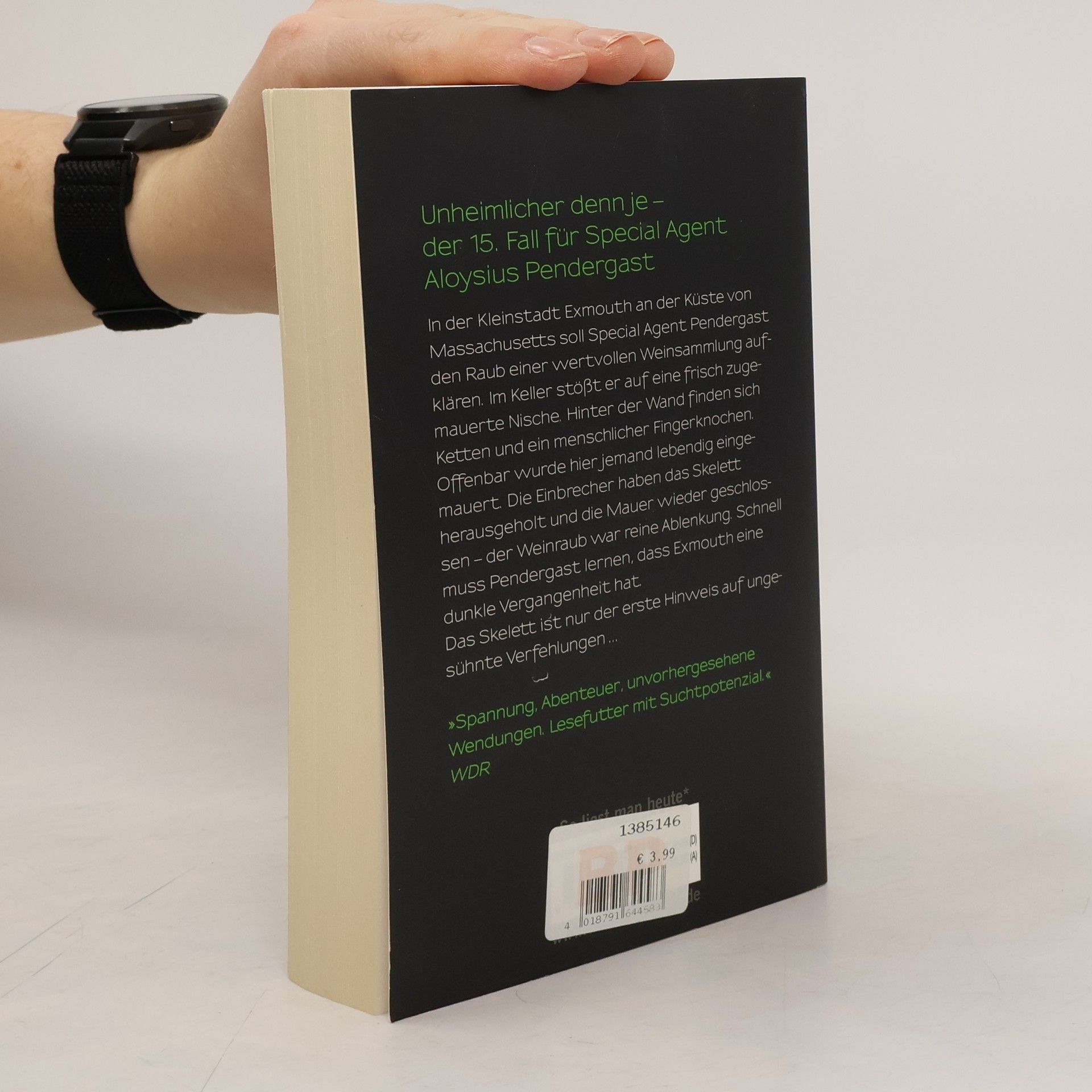 Eine geheime Gruft, ein mysteriöser Schiffbruch und ein Mord in den Salzmarschen - der 15. Fall für Special Agent Aloysius Pendergast In der Kleinstadt Exmouth an der Küste von Massachusetts soll Special Agent Pendergast den Raub einer wertvollen Weinsammlung aufklären. Im Weinkeller stößt er überraschend auf eine frisch zugemauerte Nische. Hinter der Wand sind Ketten zu finden, außerdem ein menschlicher Fingerknochen. Offenbar wurde hier vor langer Zeit jemand lebendig eingemauert. Die Einbrecher haben das Verlies geöffnet, das Skelett herausgeholt und die Mauer wieder geschlossen – der Weinraub war anscheinend reine Ablenkung. Schnell muss Pendergast lernen, dass Exmouth eine äußerst dunkle Vergangenheit hat. Das Skelett ist nur der erste Hinweis auf eine Verfehlung aus alter Zeit, die bis heute ungesühnt ist. „Spannung Abenteuer, unvorhergesehene Wendungen: Lesefutter mit Suchtpotential.“ WDR