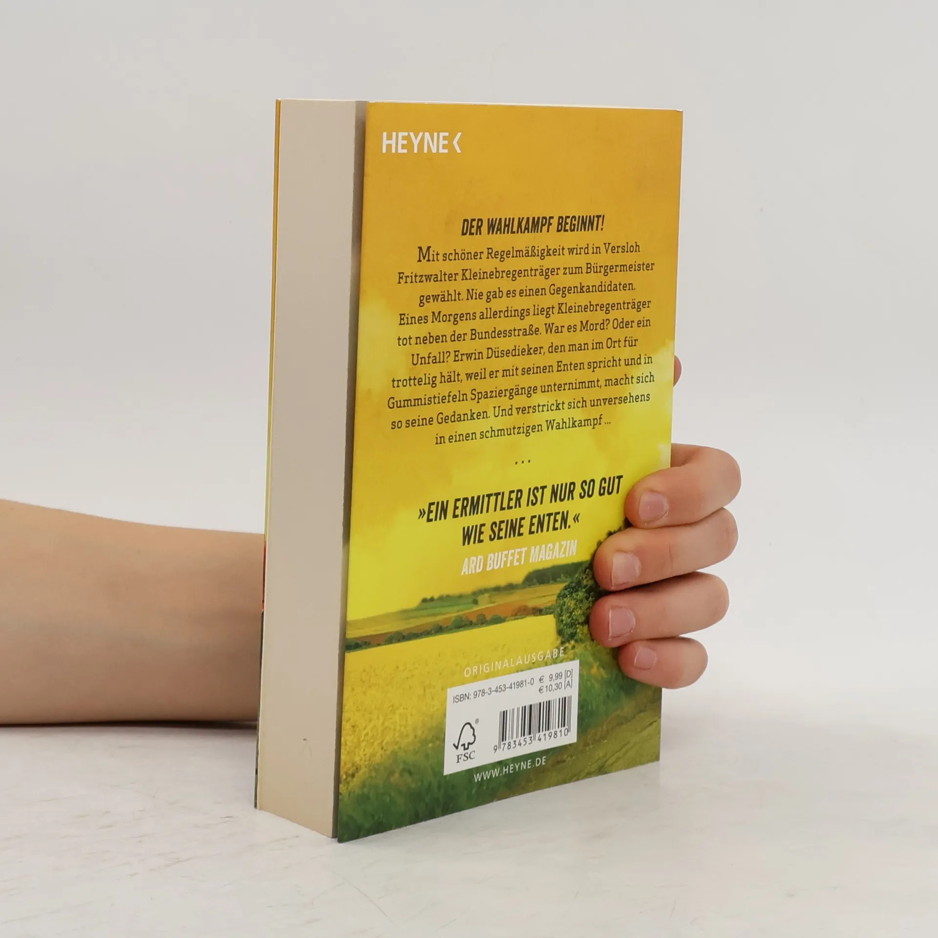 Wer wird Bürgermeister von Versloh? In Versloh, der Gemeinde mit den Dörfern Bramschebeck und Pogge, steht die Wahl vor der Tür. Alle paar Jahre wieder wird Fritzwalter Kleinebregenträger hier zum Bürgermeister gewählt. Nie gab es einen Gegenkandidaten. Eines Morgens allerdings liegt Kleinebregenträger tot neben der Bundesstraße. War es Mord? Oder ein Unfall? Erwin Düsedieker, den man im Ort für trottelig hält, weil er mit seinen Enten spricht und in Gummistiefeln Spaziergänge unternimmt, macht sich so seine Gedanken. Und verstrickt sich unversehens in einen schmutzigen Wahlkampf ...