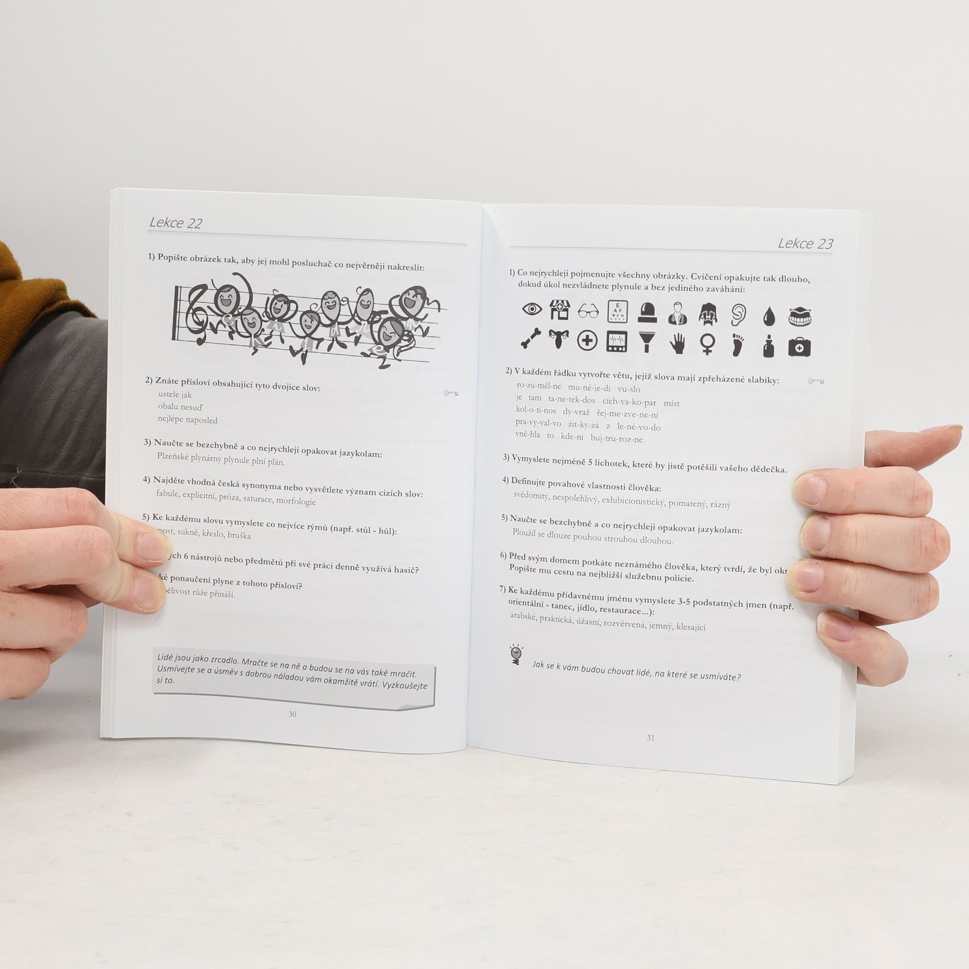 Nové vydání úspěšné knihy Mluvte jako mluvčí přináší Vám, čtenářům, desítky nových druhů originálních cvičení zaměřených na zlepšení mluveného projevu. Pravidelným tréninkem s knihou brzy rozšíříte svou aktivní slovní zásobu v rodném jazyce a zdokonalíte své vyjadřovací i artikulační schopnosti. Naučíte se rychleji vymýšlet konverzační témata v každodenních rozhovorech a debatách nebo lépe obhajovat svůj názor při sporných diskuzích. Pomocí snadno zapamatovatelných a lehce aplikovatelných rétorických rad navíc zjistíte: jak působit obratněji ve společnosti jak získávat pozornost opačného pohlaví jak přesvědčovat druhé a mnoho dalšího. Praktická část knihy je rozdělena do 200 lekcí, z nichž každá nabízí 30 minut intenzivního řečnického tréninku za pomoci 5-7 zajímavých cvičení. Pro své praktické zaměření bývá kniha doporučována jako doplňková literatura v seminářích rétoriky nebo využívána v medicíně jako terapeutická pomůcka při odstraňování řečových vad (ať už vrozených nebo získaných následkem mozkových příhod a jiných vážných onemocnění). Hlavní uplatnění však najde u každého člověka, který občas cítí, že jeho mluvený projev není tak kvalitní, jak by si přál, jeho řeč není tak plynulá a srozumitelná, jak by mohla být či jeho vyjádření vždy nebývají dostatečně výstižná a všem jasná.