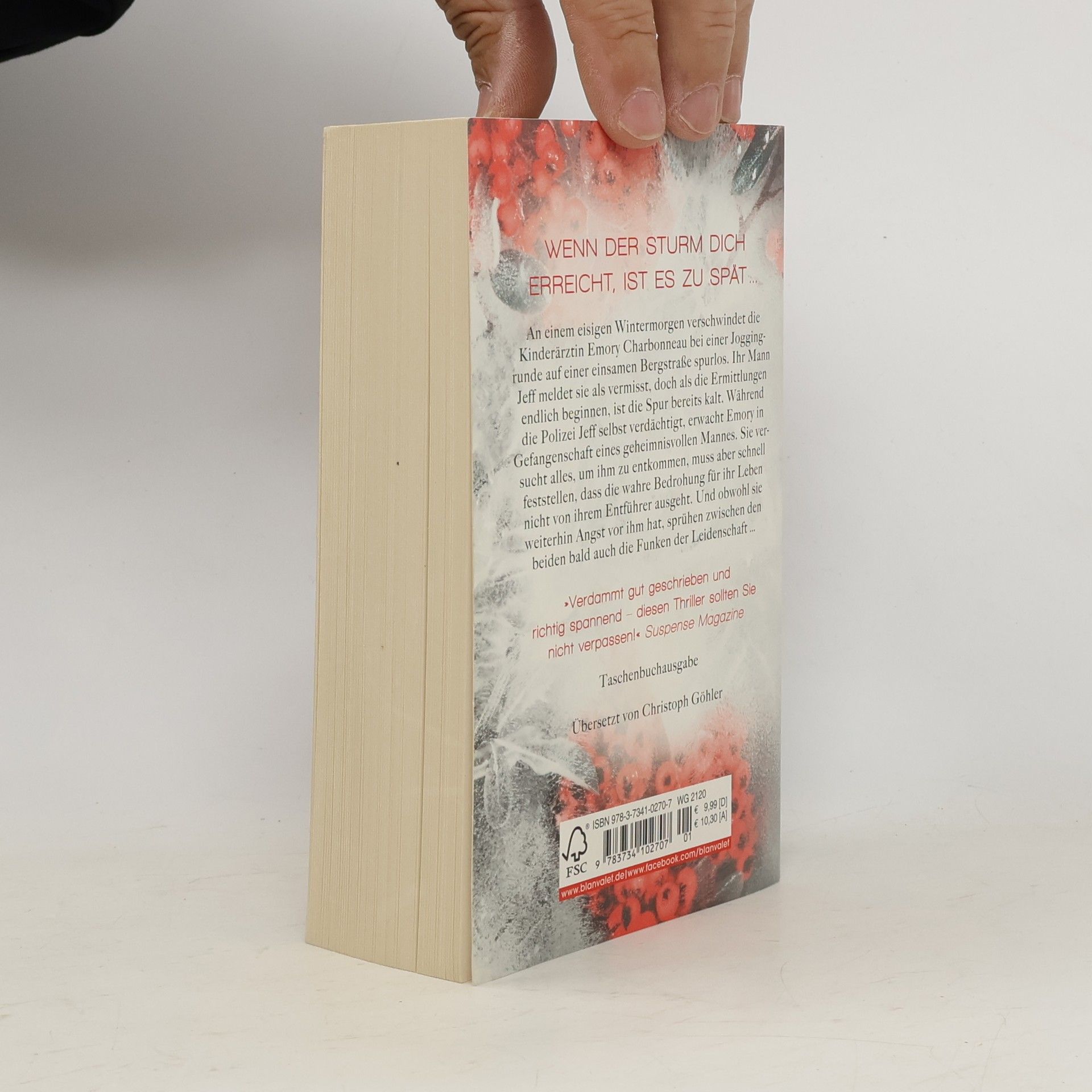 Eine junge Frau, die spurlos verschwindet, ein geheimisvoller Fremder und ein Schneesturm, vor dem es kein Entkommen gibt … An einem eisigen Wintermorgen verschwindet die Kinderärztin Emory Charbonneau bei einer Joggingrunde auf einer einsamen Bergstraße spurlos. Ihr Mann Jeff meldet sie als vermisst, doch als die Ermittlungen endlich beginnen, ist die Spur bereits kalt. Während die Polizei Jeff selbst verdächtigt, erwacht Emory in Gefangenschaft eines geheimnisvollen Mannes. Sie versucht alles, um ihm zu entkommen, muss aber schnell feststellen, dass die wahre Bedrohung für ihr Leben nicht von ihrem Entführer ausgeht. Und obwohl sie weiterhin Angst vor ihm hat, sprühen zwischen den beiden bald auch die Funken der Leidenschaft …
