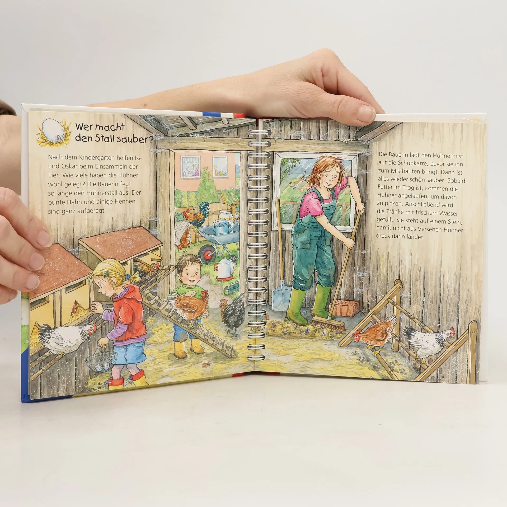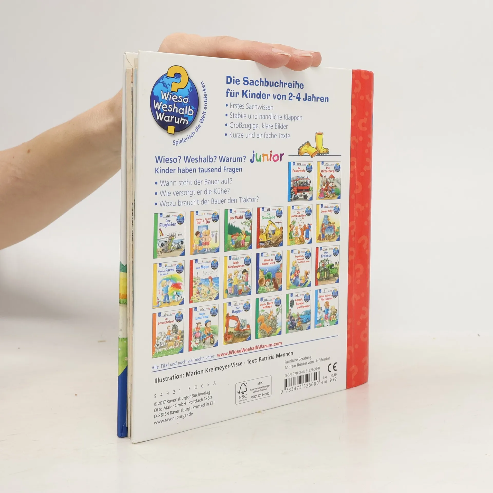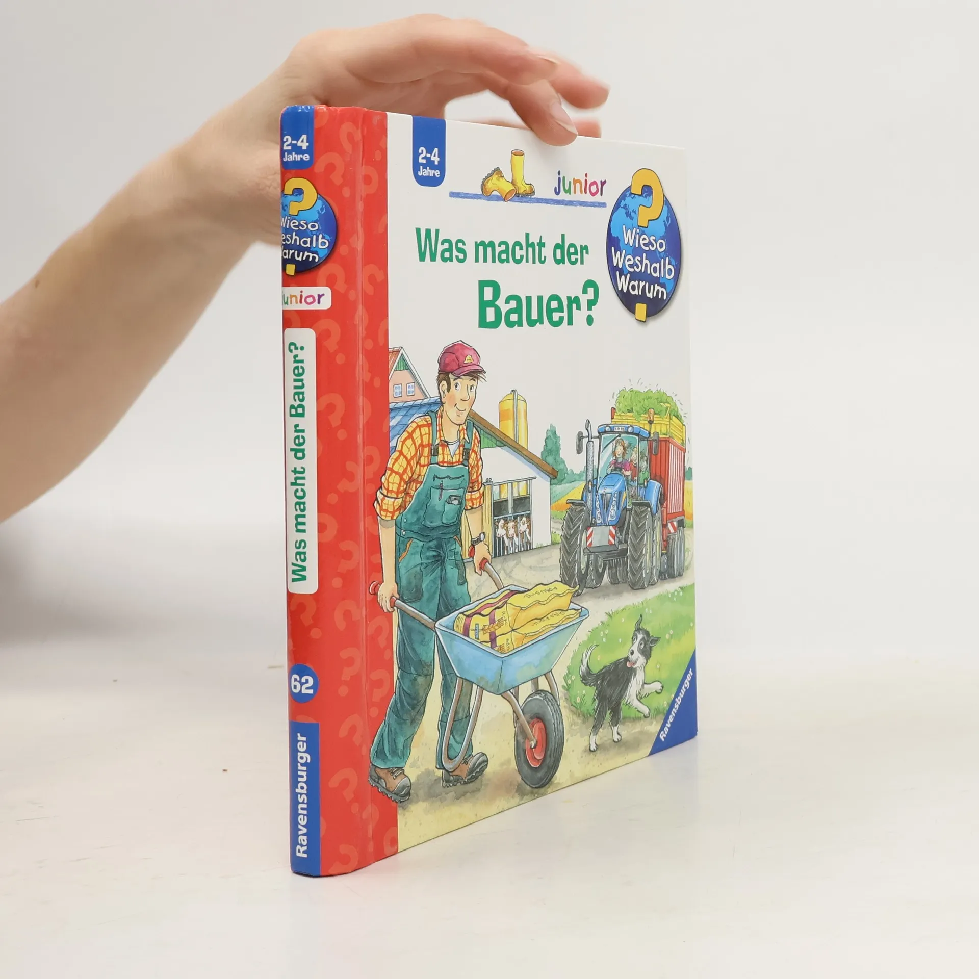 Auf dem Bauernhof helfen alle mit: der Bauer, die Bäuerin und ihre ganze Familie. Wir begleiten sie einen Tag lang bei ihrer Arbeit, angefangen beim frühen Aufstehen, dem Versorgen der Tiere bis zum Einsatz des Traktors. Dank eindrücklicher Bewegungsklappen sind Kinder hautnah dabei, wenn der Stall ausgemistet und die Kuh gemolken wird. So gewinnen Kinder einen realistischen und persönlichen Einblick in den Beruf des Landwirts. Fachlich geprüft. Wieso? Weshalb? Warum? junior Die Sachbuchreihe für Kinder von 2-4 Jahren Jeden Tag entdecken Kinder etwas Neues – und haben viele Fragen. Wann kommt die Feuerwehr? Was machen die Tiere im Winter? Warum muss ich Zähne putzen? Die beliebte Sachbuchreihe Wieso? Weshalb? Warum? junior beantwortet die Fragen der Kinder auf Augenhöhe. Sie beleuchtet unterschiedlichste Themen aus ihrer Alltags- und Interessenswelt altersgerecht und mit viel Liebe zum Detail. Die Reihe ist speziell auf kleine Hände und die Bedürfnisse der Kleinsten angepasst. Klare und liebevolle Bilder, kurze Sachtexte sowie handliche Klappen, die Bewegungen veranschaulichen und überraschende und lustige Einblicke gewähren, ermöglichen Kindern, sich ihre Themen selbst zu erschließen. Der Spaß am eigenhändigen Entdecken, die liebevolle Umsetzung und die hochwertige Ausstattung garantieren langanhaltende Freude an jedem Buch.
