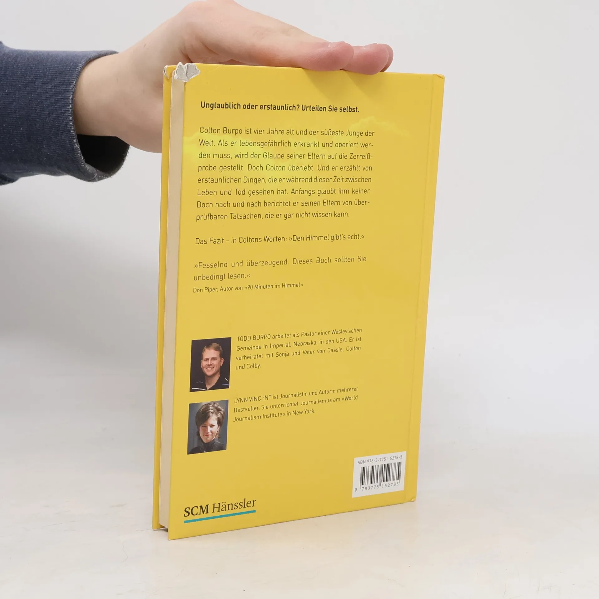 Unglaublich oder erstaunlich? Urteilen Sie selbst: Colton ist vier Jahre alt, als er lebensgefährlich erkrankt und operiert werden muss. Er überlebt um Haaresbreite. Später erzählt er seinen Eltern, dem Pastorenehepaar Todd und Sonja Burpo, von erstaunlichen Dingen, die er während dieser Zeit zwischen Leben und Tod gesehen hat. Er berichtet von Tatsachen, die er gar nicht wissen konnte. Coltons Fazit: "Den Himmel gibt's echt!"