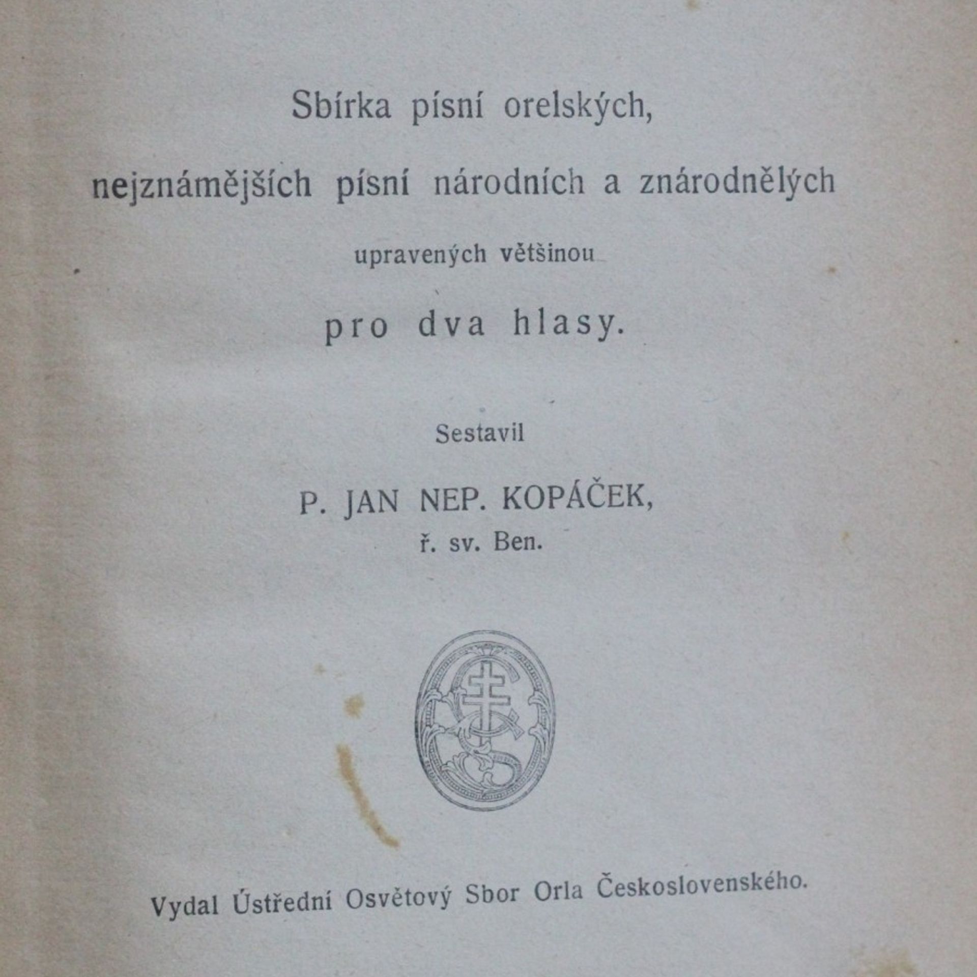 Orelský zpěvník sbírka písní orelských, nejznámějších písní národních a znárodněných upraveným většinou pro dva hlasy, Jan Nepomuk Kopáček