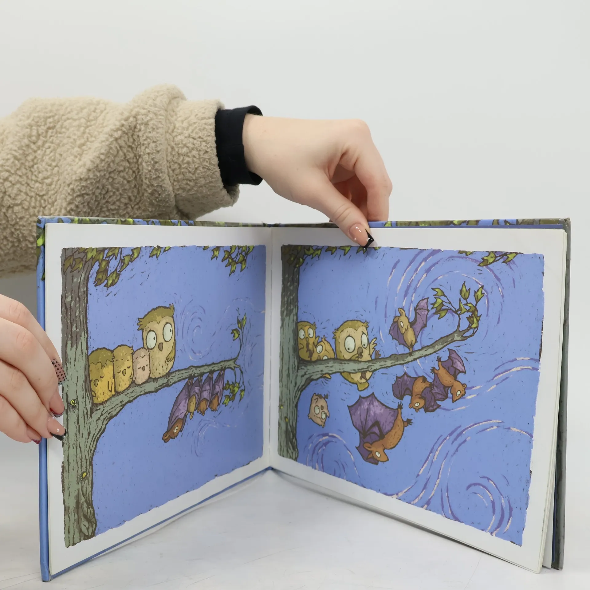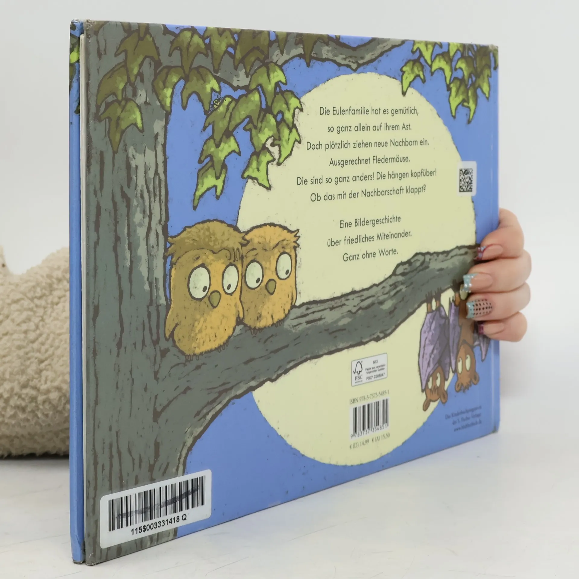 Mama Eule und ihre Kleinen sind glücklich und zufrieden auf ihrem geräumigen Ast. Bis eines Tages eine Fledermausfamilie einzieht. Die neuen Nachbarn beäugen sich ein wenig misstrauisch: Die Eulenfamilie sitzt auf dem Ast und die Fledermäuse hängen kopfüber daran. Das kann doch nicht zusammenpassen? Aber die Kinder sind neugierig aufeinander und würden gern mal die Plätze tauschen. Als dann auch noch ein plötzlicher Wirbelwind alle durcheinanderwürfelt, stellen die beiden Mamas fest, dass das Zusammenleben doch ganz gut funktioniert. Ein weises Buch, das ganz ohne Worte erklärt, dass manches, was anders oder fremd ist, richtig gut sein kann. Und, dass man manchmal einfach die Perspektive wechseln sollte – auch wenn man sich dafür auf den Kopf stellen muss ... Ein Bilderbuch zum Thema Nachbarschaft, Toleranz und hilfsbereites Miteinander. Ganz ohne Worte.