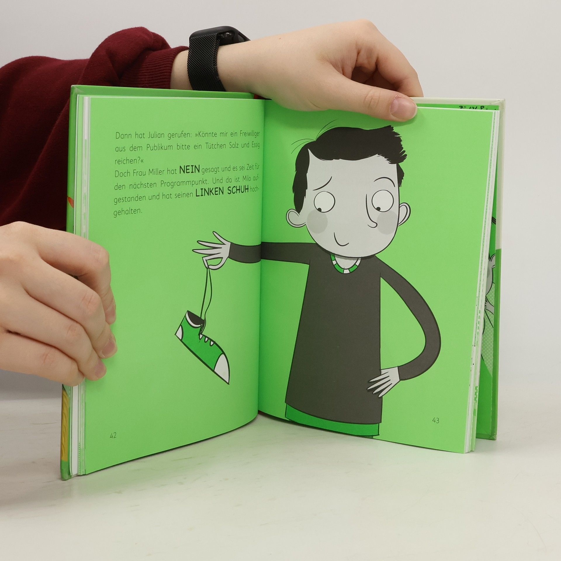 Jonas, Maya, Irfan & Co. sind sprichwörtlich eine Klasse für sich – und haben, zum Leidwesen ihrer Lehrerin Frau Miller, jede Menge Fantasie. In drei in sich abgeschlossenen Geschichten berichtet ein kindlicher Erzähler von den Abenteuern einer Grundschulklasse. Immer ist es etwas ganz Alltägliches, das die Fantasie der Kinder anregt und in kürzester Zeit eine Eigendynamik entwickelt, die die Lehrerinnen und Lehrer gehörig ins Schwitzen bringt und für jede Menge komischer Situationen sorgt. Als Nick nach einem Gang auf die Toilette komplett nass zurückkommt ist für die Kinder klar, dass ihn ein Klogespenst angegriffen und nassgespritzt hat. Dass ab sofort alle Jungs die Mädchentoilette benutzen geht gar nicht, und so sieht der Konrektor höchstpersönlich nach. Und steht fünf Minuten später pitschnass und wie der sprichwörtlich begossene Pudel vor der Klasse. Ein anderes Mal sorgt ein Schuh für Aufregung. Milo behauptet, dass sein Turnschuh magische Kräfte habe und tritt den Beweis auch sogleich an. Die Kinder gehen der Sache auf den Grund. Die durchgängig bebilderten Geschichten bieten nicht nur spannende Abenteuer, es gibt auch jede Menge zu lachen!