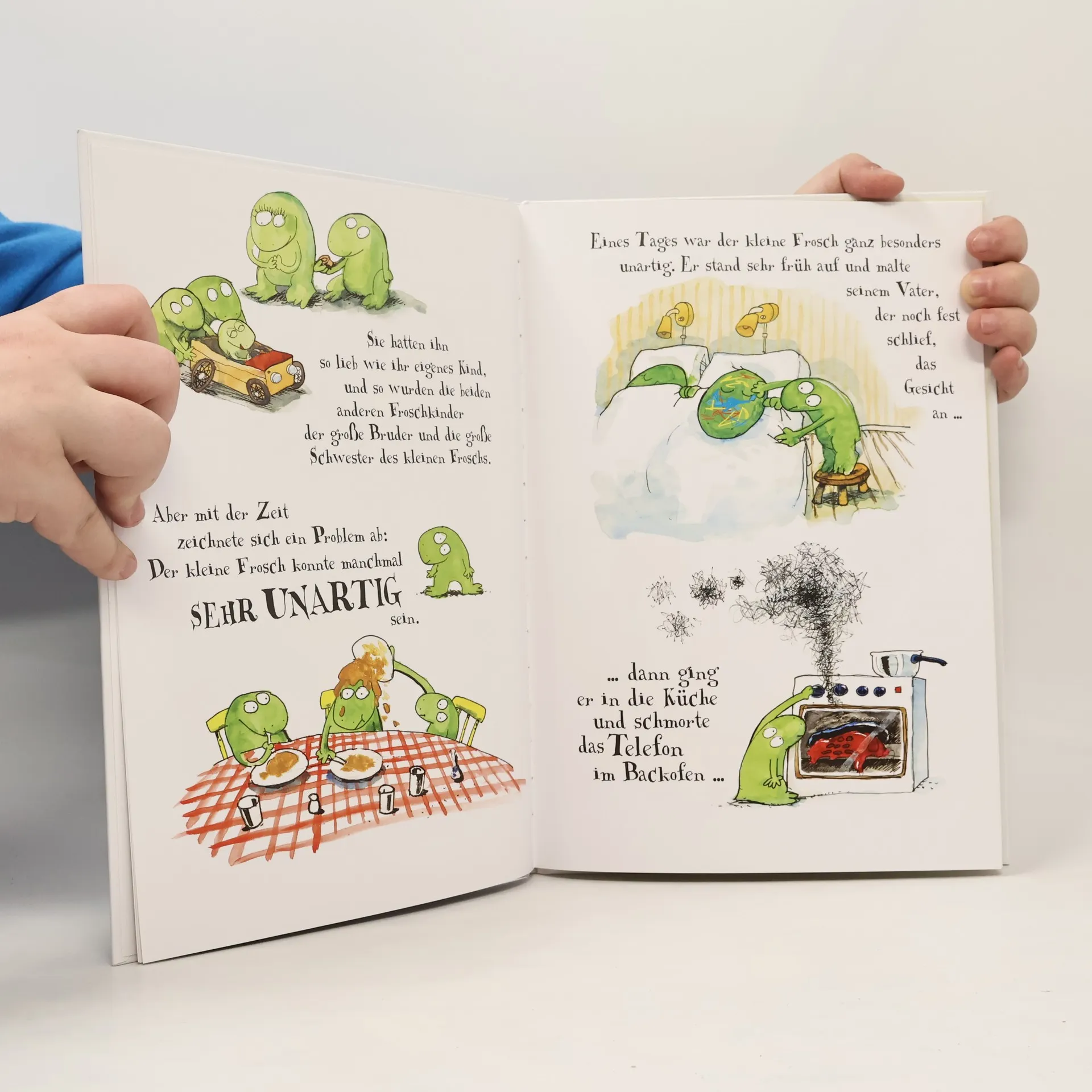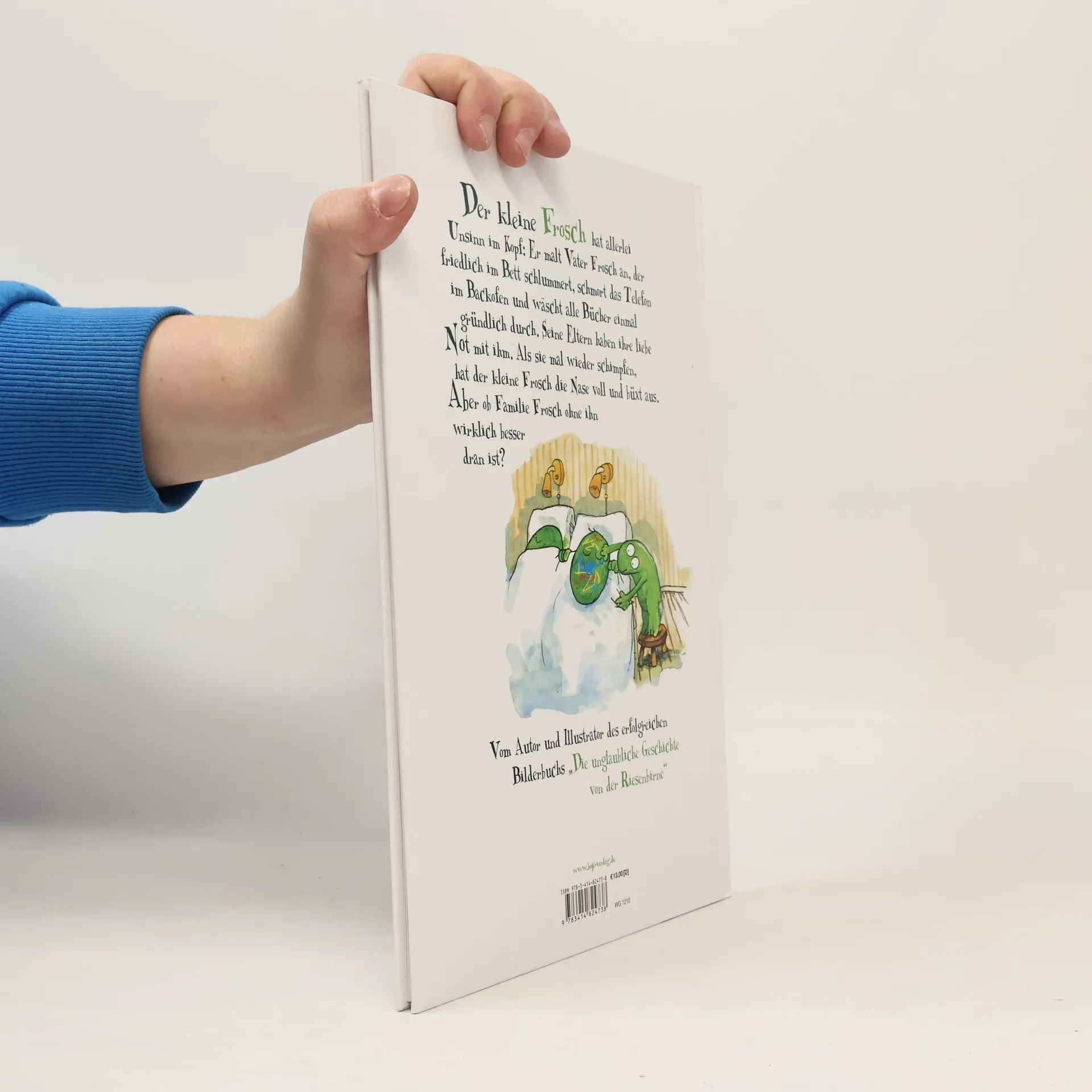 Der kleine Frosch hat allerlei Unsinn im Kopf: Er malt Vater Frosch an, der friedlich im Bett schlummert, schmort das Telefon im Backofen und wäscht alle Bücher einmal gründlich durch. Seine Eltern haben ihre liebe Not mit ihm. Als sie mal wieder schimpfen, hat der kleine Frosch die Nase voll und büxt aus. Aber ob Familie Frosch ohne ihn wirklich besser dran ist? Vom Autor des erfolgreichen Bilderbuchs „Die unglaubliche Geschichte von der Riesenbirne“