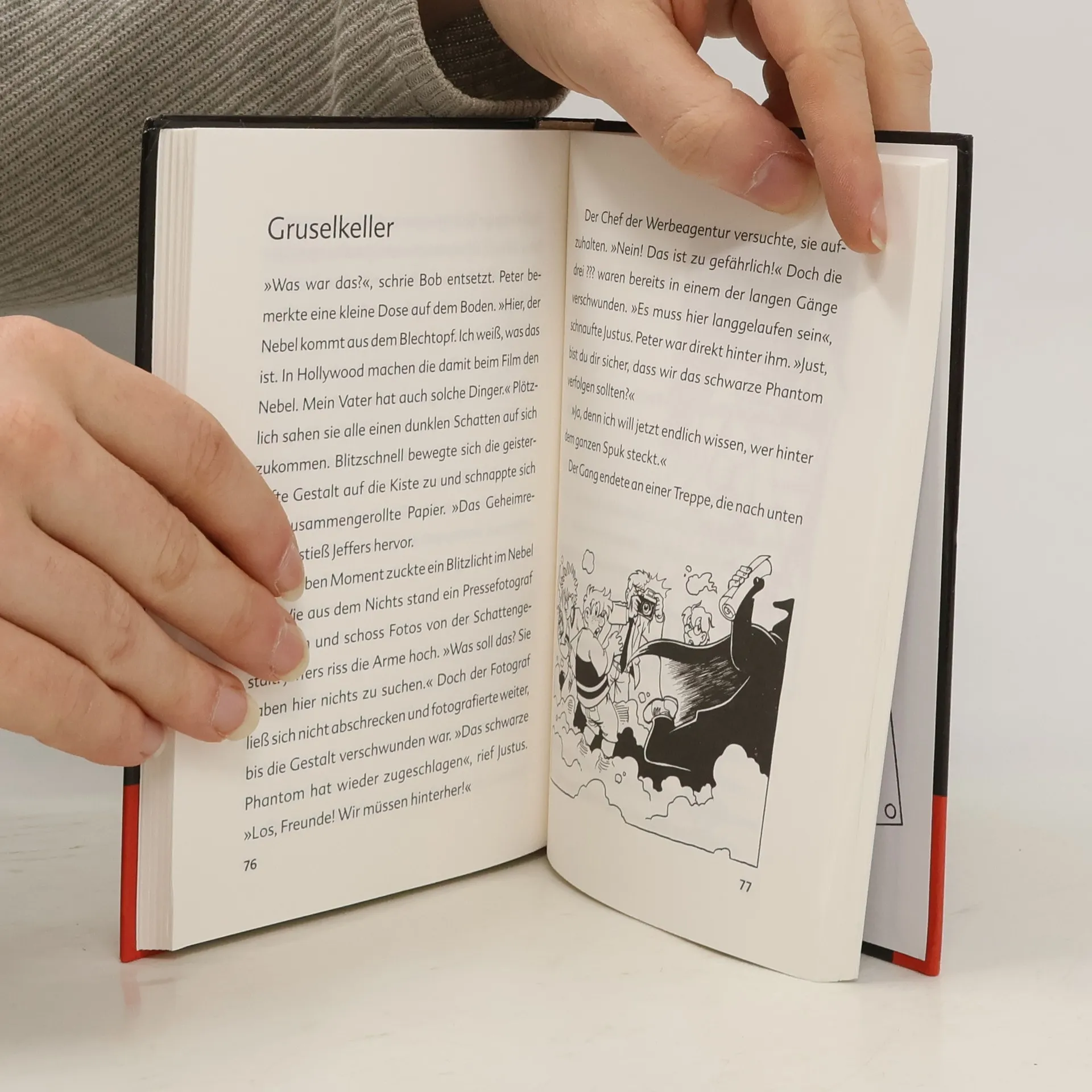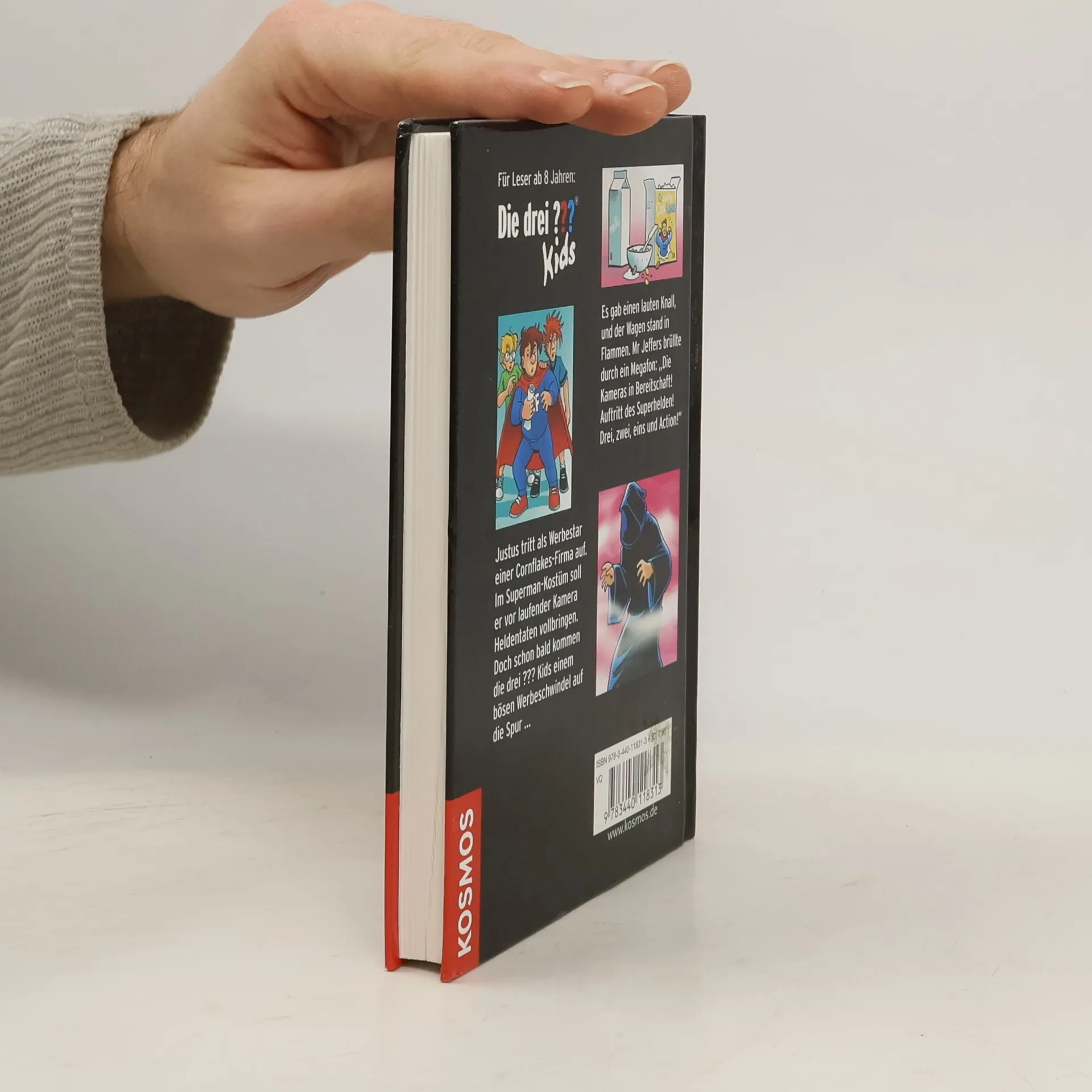 Es gab einen lauten Knall, und der Wagen stand in Flammen. Mr Jeffers brüllte durch ein Megafon: „Die Kameras in Bereitschaft! Auftritt des Superhelden! Drei, zwei, eins und Action! Justus tritt als Werbestar einer Cornflakes-Firma auf. Im Superman-Kostüm soll er vor laufender Kamera Heldentaten vollbringen. Doch schon bald kommen die drei ??? Kids einem bösen Werbeschwindel auf die Spur …