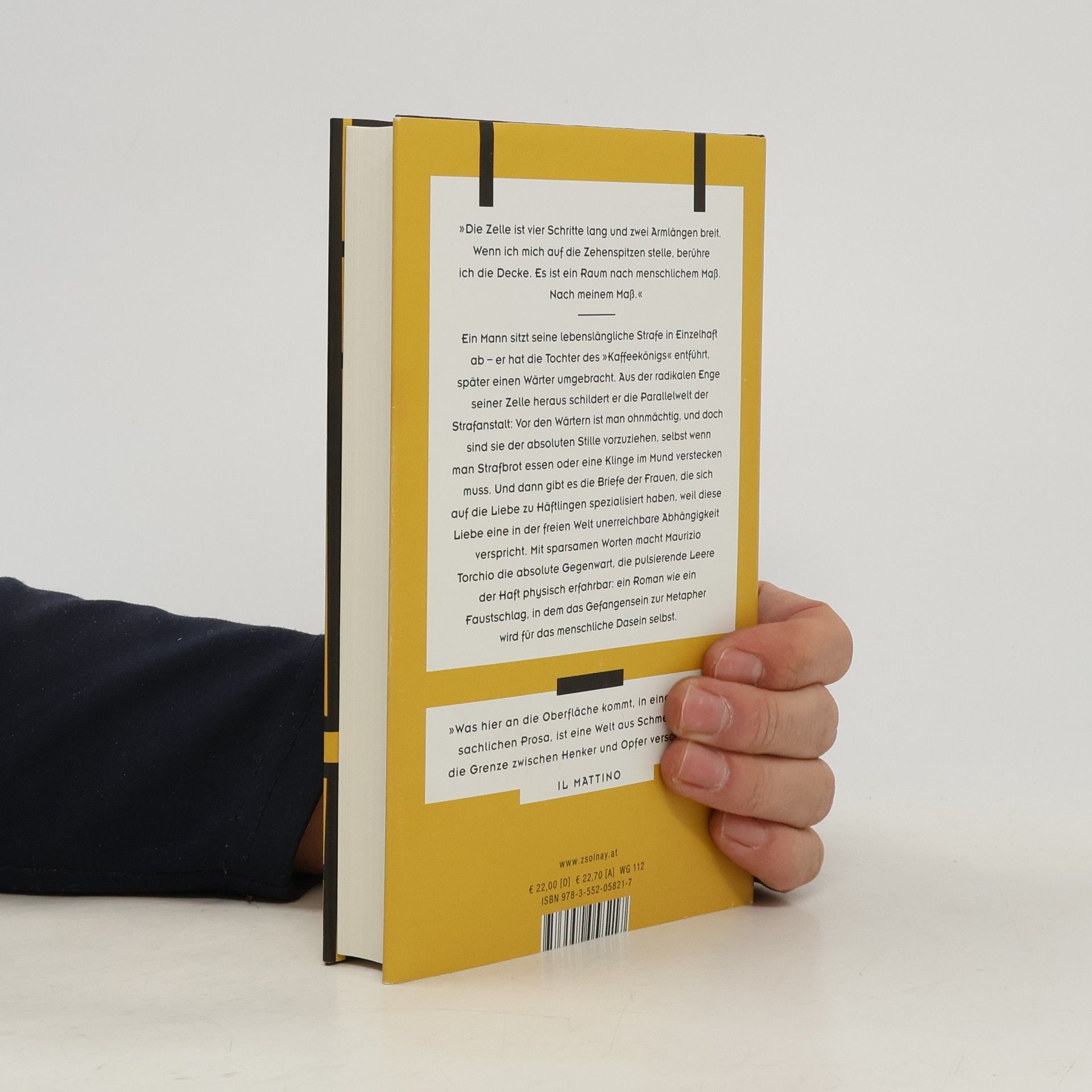 Ein Mann sitzt seine lebenslängliche Strafe in der Einzelhaft ab – er hat die Tochter des „Kaffeekönigs“ entführt, später dann seinen Wärter umgebracht. Er klagt nicht an, sondern beschreibt, wie das Gefängnis Tag für Tag mehr zum eigenen Körper wird: „Mir sind Nerven für das ganze Gefängnis gewachsen. Wenn einer durch den Gang unterm Hof geht, ist es, als ginge er über meinen linken Arm.“ Maurizio Torchio ist etwas Einzigartiges gelungen: Mit sparsamsten Worten macht er die absolute Gegenwart, die pulsierende Leere der Haft physisch erfahrbar. Ein Roman wie ein Faustschlag, in dem das „Gefangensein“ auch eine Metapher ist für das Menschsein.