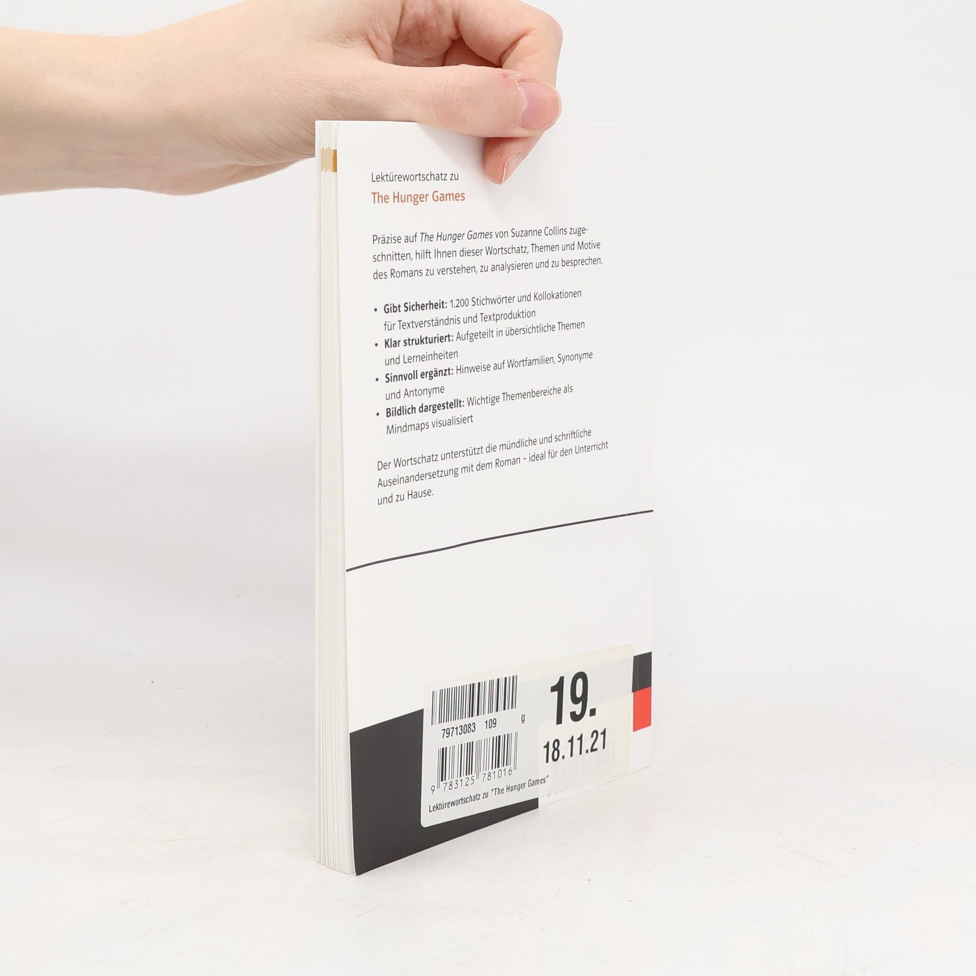 Präzise auf The Hunger Games von Suzanne Collins zugeschnitten, hilft Ihnen dieser Wortschatz, Themen und Motive des Romans zu verstehen, zu analysieren und zu besprechen. Gibt Sicherheit: 1.200 Stichwörter und Kollokationen für Textverständnis und Textproduktion Klar strukturiert: Aufgeteilt in übersichtliche Lerneinheiten Sinnvoll ergänzt: Hinweise auf Wortfamilien, Synonyme und Antonyme Bildlich dargestellt: Wichtige Themenbereiche als Mindmaps visualisiert Der Wortschatz unterstützt die mündliche und schriftliche Auseinandersetzung mit dem Roman – ideal für den Unterricht und zu Hause.