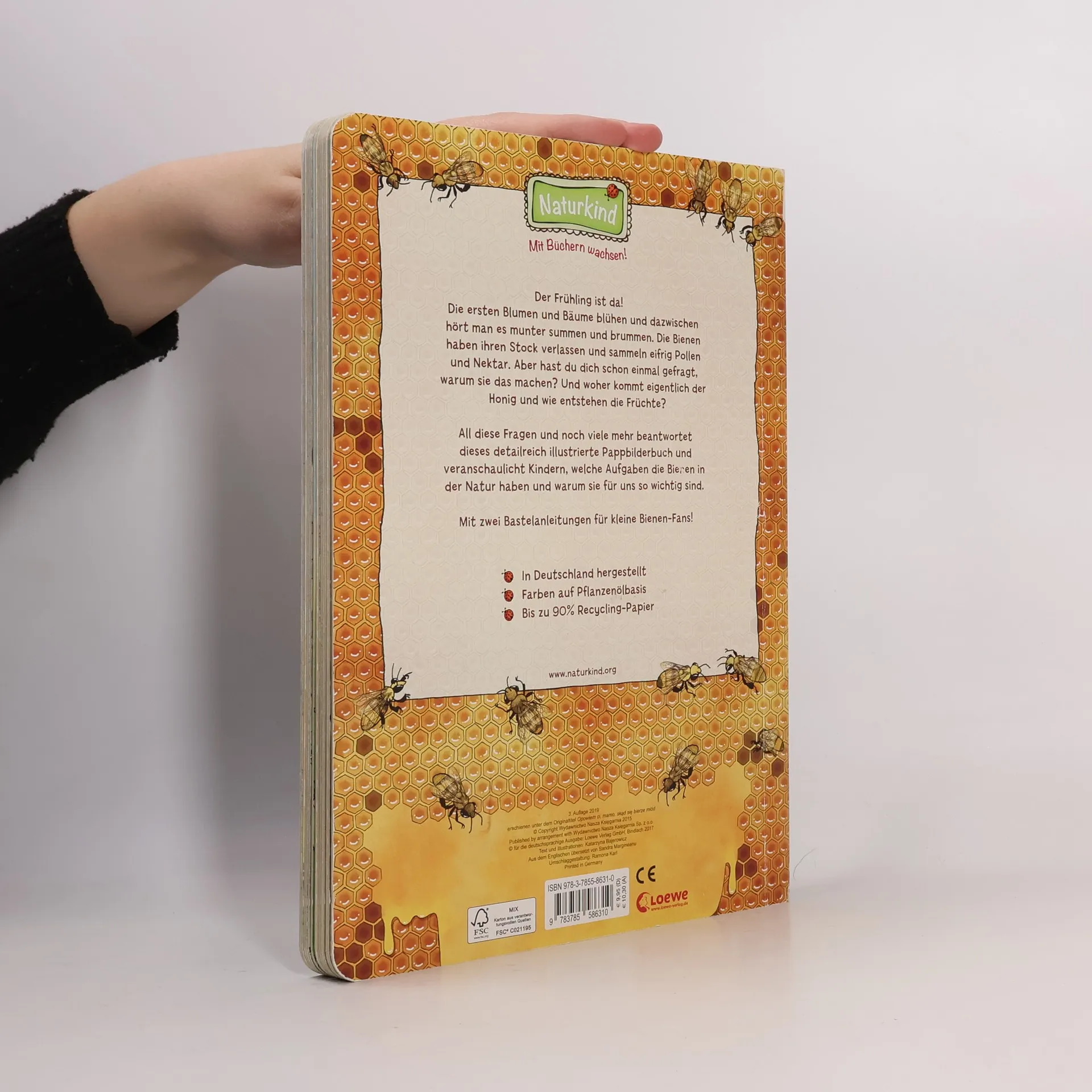 Der Frühling ist da! Die ersten Blumen und Bäume blühen und dazwischen hört man es munter summen und brummen. Die Bienen haben ihren Stock verlassen und sammeln eifrig Pollen und Nektar. Aber hast du dich schon einmal gefragt, warum sie das machen? Und woher kommt eigentlich der Honig und wie entstehen die Früchte? Nahwelt zum Mitmachen und Erleben in der Naturkind-Reihe! Mit wimmeligen Bildern, Bastelanleitungen und Informationsseiten zeigt dieses großformatige Pappbilderbuch Kindern das faszinierende Leben der Bienen sowie deren enorme Wichtigkeit für unsere Umwelt und wie diese im Laufe eines Jahres leben. - Mit zwei Bastelanleitungen für kleine Bienen-Fans! - Farben auf Pflanzenölbasis - Bis zu 90% Recycling-Papier Mehr Infos rund um die Naturkind-Reihe: www.naturkind.org