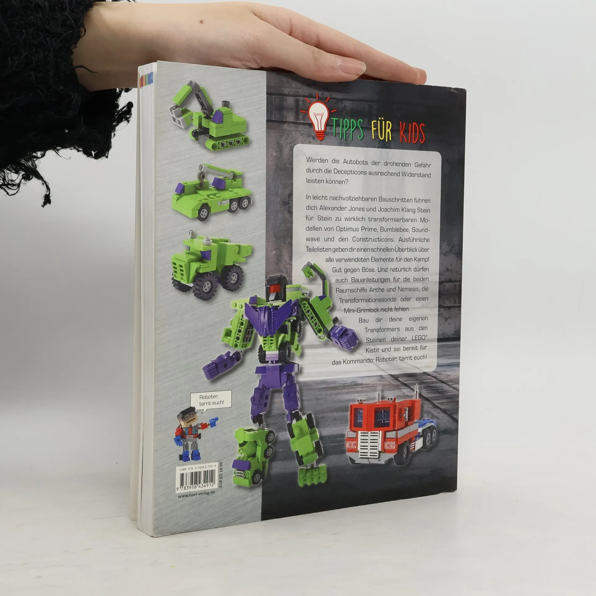 Werden die Autobots der drohenden Gefahr durch die Decepticons ausreichend Widerstand leisten können? Alexander Jones und Joachim Klang führen dich in leicht nachvollziehbaren Bauschritten zu transformierbaren Modellen von Optimus Prime, Bumblebee, Soundwave und den Constructicons. Ausführliche Teilelisten bieten einen schnellen Überblick über alle verwendeten Elemente für den Kampf zwischen Gut und Böse. Bauanleitungen für die Raumschiffe Arche und Nemesis, die Transformationssonde sowie einen Mini-Grimlock sind ebenfalls enthalten. Baue deine eigenen Transformers aus den Steinen deiner LEGO® Kiste und sei bereit für das Kommando: Roboter, tarnt euch! Außerdem in der Lego-Reihe von HEEL erhältlich sind verschiedene Titel, darunter Tricks für Bricks, Bricks: Lego Sammeln, Lego Bauen, Lego Kreativ, sowie zahlreiche Bauanleitungen für Städte, Galaxien, Ritterwelten und Autos. Es gibt auch spezielle Boxen und Bücher mit coolen Projekten für Kinder zu Themen wie Space, Minecraft und Minions. Entdecke die bunte Welt der Lego-Steine und lass deiner Kreativität freien Lauf!