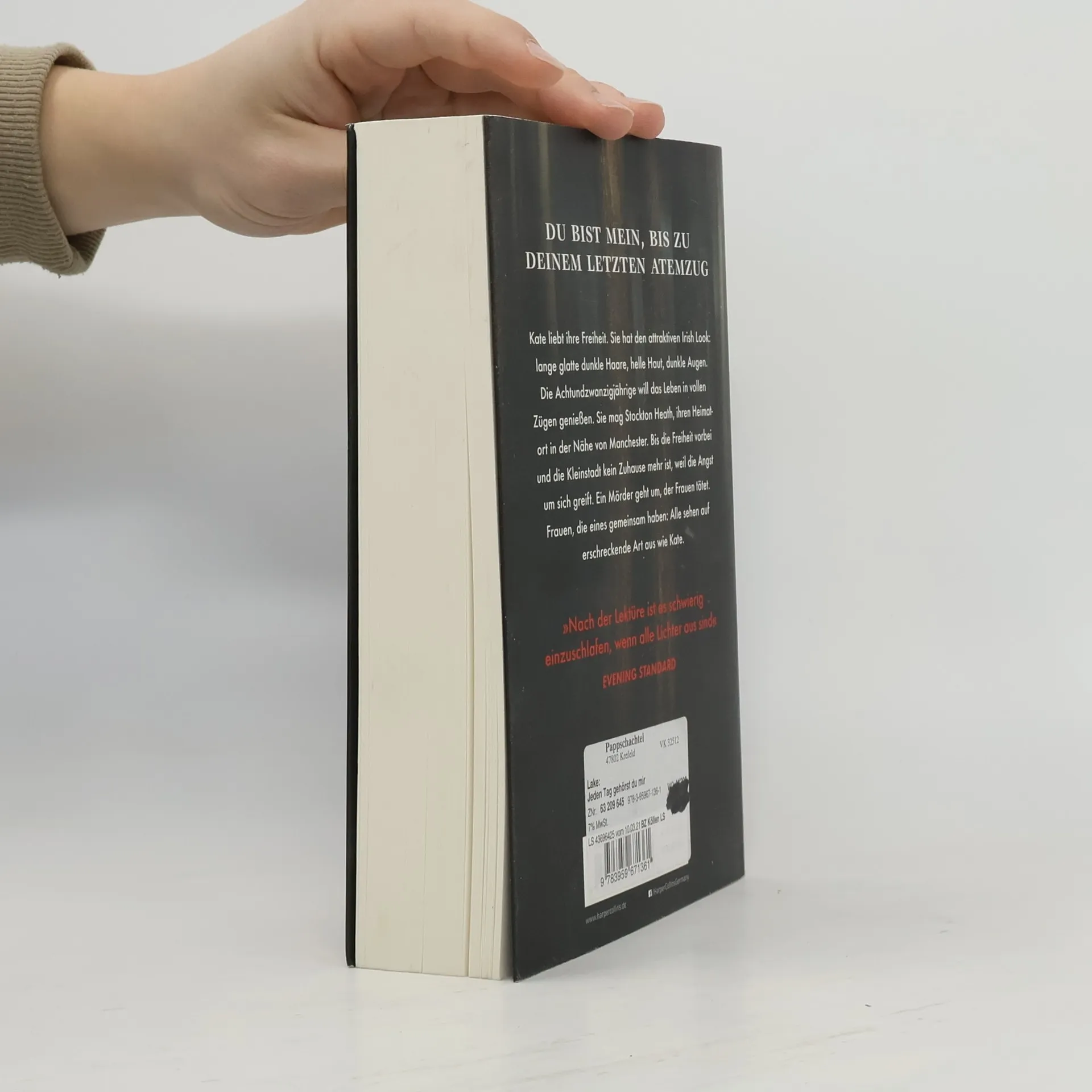 Kate liebt ihre Freiheit. Sie hat den attraktiven Irish Look: lange glatte dunkle Haare, helle Haut, dunkle Augen. Die Achtundzwanzigjährige will das Leben in vollen Zügen genießen. Sie mag Stockton Heath, ihren Heimatort in der Nähe von Manchester. Bis die Freiheit vorbei und die Kleinstadt kein Zuhause mehr ist, weil die Angst um sich greift. Ein Mörder geht um, der Frauen tötet. Frauen, die eines gemeinsam haben: Alle sehen auf erschreckende Art aus wie Kate. „Es ist schwierig, nach der Lektüre, wenn die Lichter aus sind, einzuschlafen.“ Evening Standard