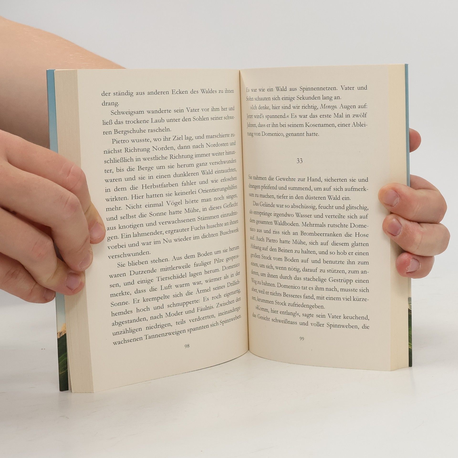 An einem Herbstmorgen im Jahr 1963 eröffnet der Tischler Pietro seinem Sohn, dass er heute nicht zur Schule gehen soll: Sie werden für einige Tage in die Berge gehen – mit Proviant und zwei alten Gewehren. Im Laufe des mühevollen Aufstiegs erfährt der 12-jährige Junge, dass Pietro eine Wette eingegangen ist: Ausgerechnet er, der Außenseiter im Dorf, hat versprochen, den Bären zu erlegen, der in dieser Gegend seit einigen Wochen Bienenstöcke zermalmt, Hirsche und Rehe reißt. Auf ein solches Abenteuer hat Domenico schon lange gewartet. Dass es ihn an seine Grenzen führt, wird rasch deutlich. Zugleich spürt er im Laufe der abenteuerlichen Jagd eine wundersame Wandlung seines Vaters: Unter dessen rauer Schale bricht ein zugänglicher, viel emotionalerer Mensch hervor, als Domenico es je für möglich gehalten hätte. Hochspannend und faszinierend anschaulich erzählt dieser Roman davon, wie Menschen sich Mythen schaffen, die sich verselbstständigen und über wirkliche Bedrohungen hinwegtäuschen.