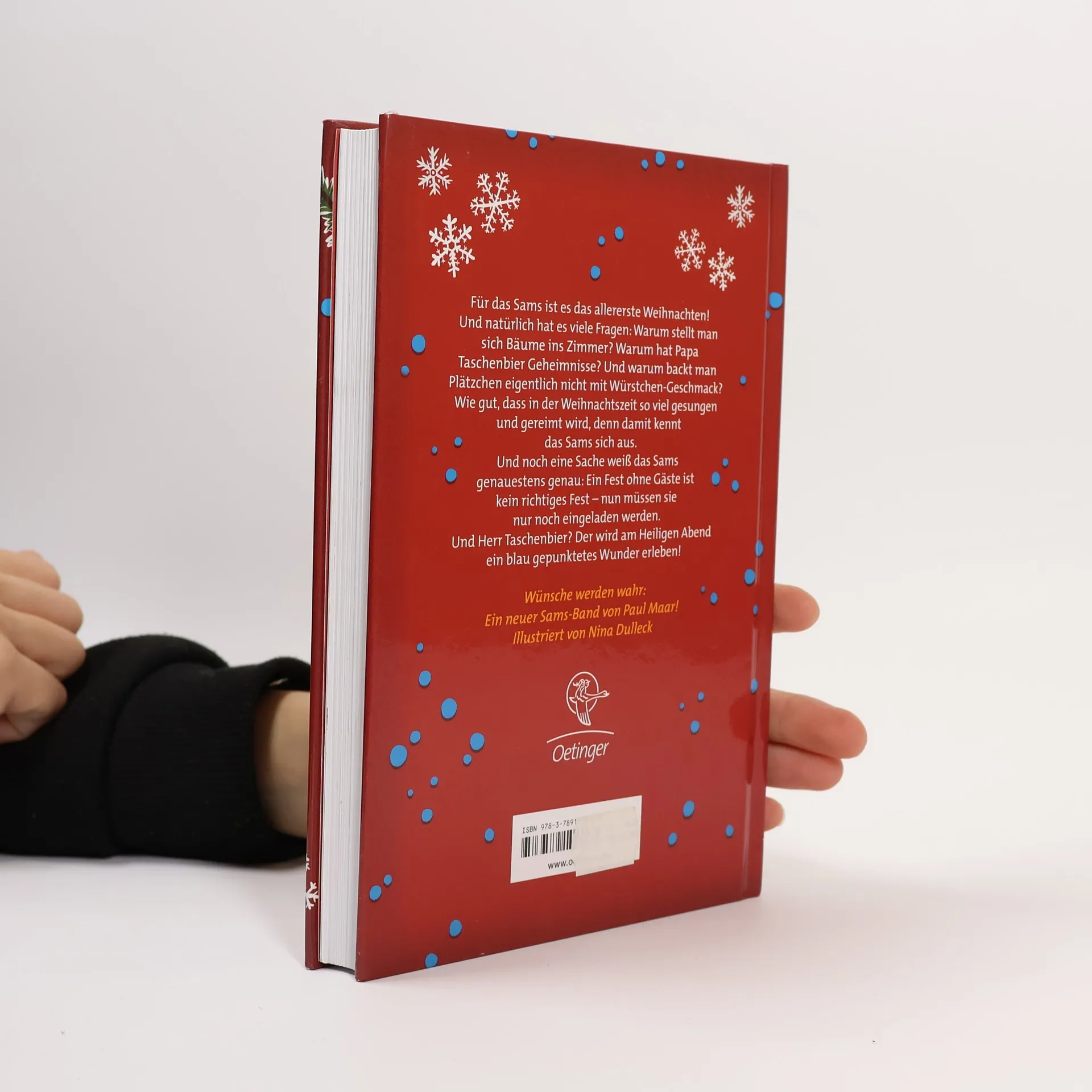 Weihnachten werden Wünsche wahr! So etwas hat das Sams noch nicht erlebt! Was sind das nur für Flügelwesen, die angeblich im Himmel wohnen? Wieso hat Papa Taschenbier auf einmal so viele Geheimnisse? Und warum stellt man sich Bäume ins Wohnzimmer? Als das Sams zu seinem Weihnachtsfestdebüt noch ein paar Kollegen aus der Welt der Samse einlädt, geht so mancher gewünschter, allerdings auch mancher ungewünschter Wunsch in Erfüllung. Aber am Ende bescheren die vielen Samse Herrn Taschenbier einen stürmischen, wirklich absolut unvergesslichen Weihnachtsabend. Turbulent und charmant: mit allem, was das Kinderherz begehrt. Das perfekte Weihnachtsgeschenk für alle Fans des witzigen und vorlauten Sams. Zeitloser Kinderbuch-Klassiker für Kinder ab 7 Jahren. Die Bände der Sams-Reihe sind sowohl mit den Original-Illustrationen von Paul Maar erhältlich als auch modern interpretiert von Star-Illustratorin Nina Dulleck („Die Schule der magischen Tiere“): Band 1: Eine Woche voller Samstage Band 2: Am Samstag kam das Sams zurück Band 3: Neue Punkte für das Sams Band 4: Ein Sams für Martin Taschenbier Band 5: Sams in Gefahr Band 6: Onkel Alwin und das Sams Band 7: Sams im Glück Band 8: Ein Sams zu viel Band 9: Das Sams feiert Weihnachten Band 10: Das Sams und der blaue Drache Band 11: Das Sams und die große Weihnachtssuche