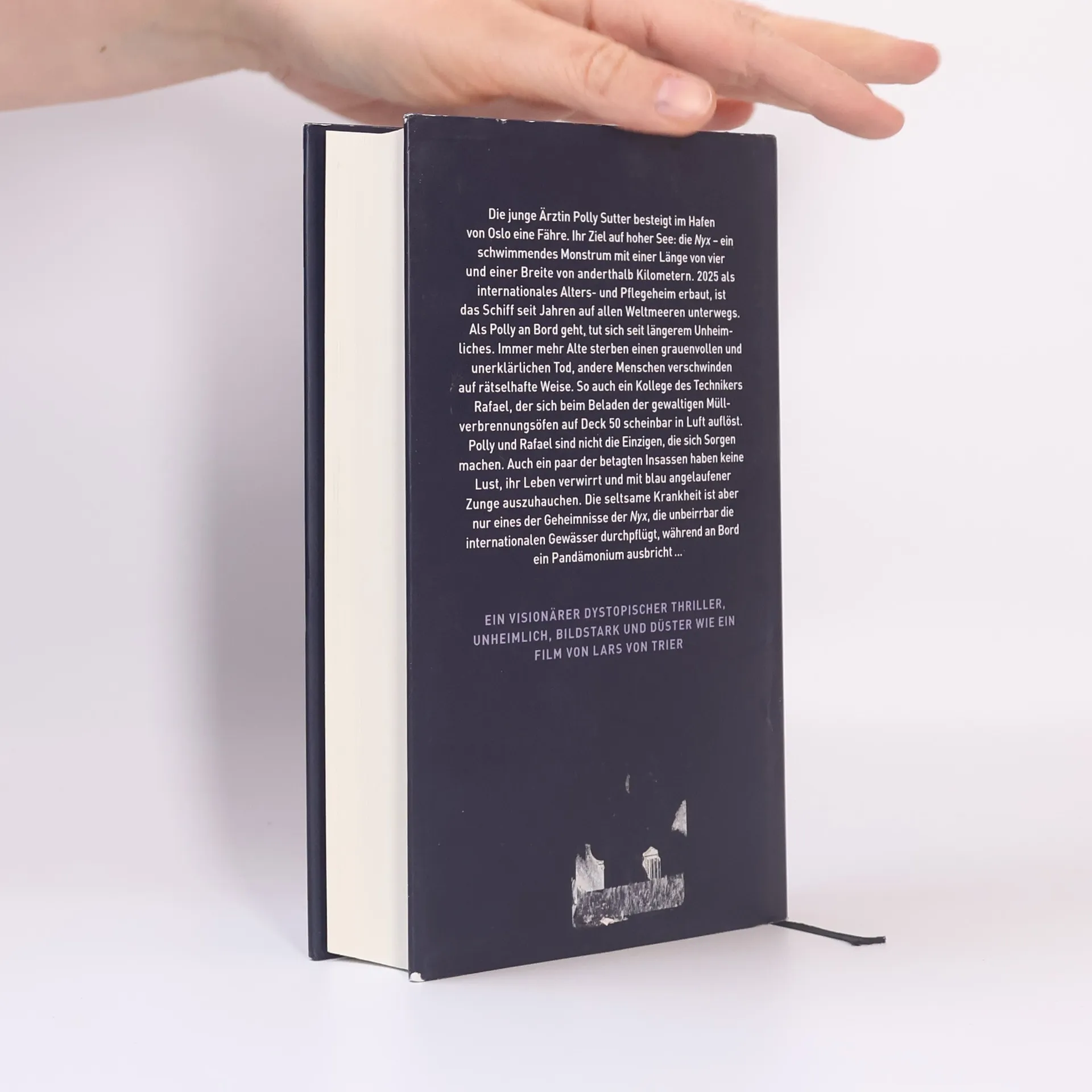 Ein unglaublich visionärer dystopischer Thriller, monumental, erschreckend und düster wie ein Film von Lars von Trier. Im Jahr 2025 wurde sie erbaut, die Nyx, ein schwimmendes Ungetüm, viereinhalb Kilometer lang und anderthalb Kilometer breit. Der Koloss zieht als gigantisches Alters- und Pflegeheim seine Bahnen durch alle Weltmeere - Das ist einfach billiger, als die Alten an Land zu versorgen. Als die junge Ärztin Polly Sutter an Bord geht, tut sich aber schon seit längerem Unheimliches. Immer mehr Alte sterben, in ihren Kabinen, in der Wanne, es ist unerklärlich. Und dann verschwinden Menschen. Wie etwa ein Kollege des Technikers Rafael, der sich beim Befüllen der riesigen Müllverbrennungsöfen auf Deck 50 scheinbar in Luft auflöst. Polly und Rafael sind nicht die einzigen, denen zunehmend flau zumute wird. Auch ein paar der betagten Insassen haben keine Lust, als nächste tot und mit blau angelaufener Zunge gefunden werden. Und die mysteriöse Seuche ist nur eines der Geheimnisse der Nyx, die unbeirrbar die internationalen Gewässer durchpflügt, während an Bord ein Pandämonium ausbricht…