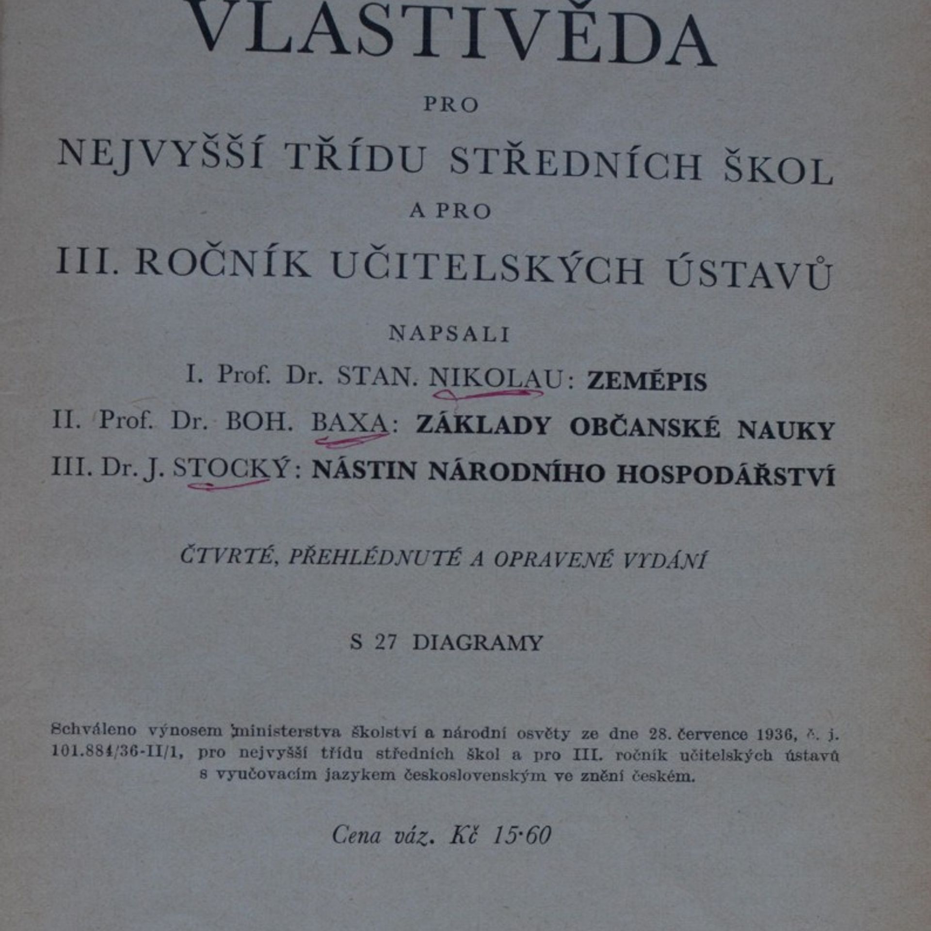 Československá vlastivěda pro nejvyšší třídu středních škol a pro III. ročník učitelských ústavů, Nikolau Stanislav, Jan Stocký, Bohumil Baxa