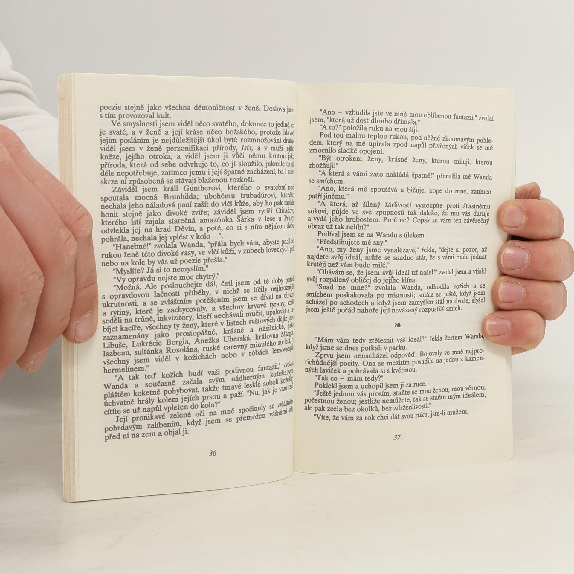Klasické erotické dílo autora, jemuž vděčí masochismus za své jméno. Příběh mladíka Severina, který se natolik zamiluje do krásné Wandy von Dunajew, že si přeje stát se jejím otrokem. Wanda jeho přání zpočátku nechápe, záhy však v podobných praktikách najde zalíbení a trýzní Severina s rostoucí rafinovaností. Čím je ale Severinovo utrpení větší, tím více jím Wanda opovrhuje. Doslov „Život v literaturu proměněný“, poprvé otištěný ve vydání z roku 1990, napsala Gabriela Veselá. Doslov k novému vydání, „Sonda do hlubin deviantní duše“, pak napsala Lenka Blažejová-Teremová.