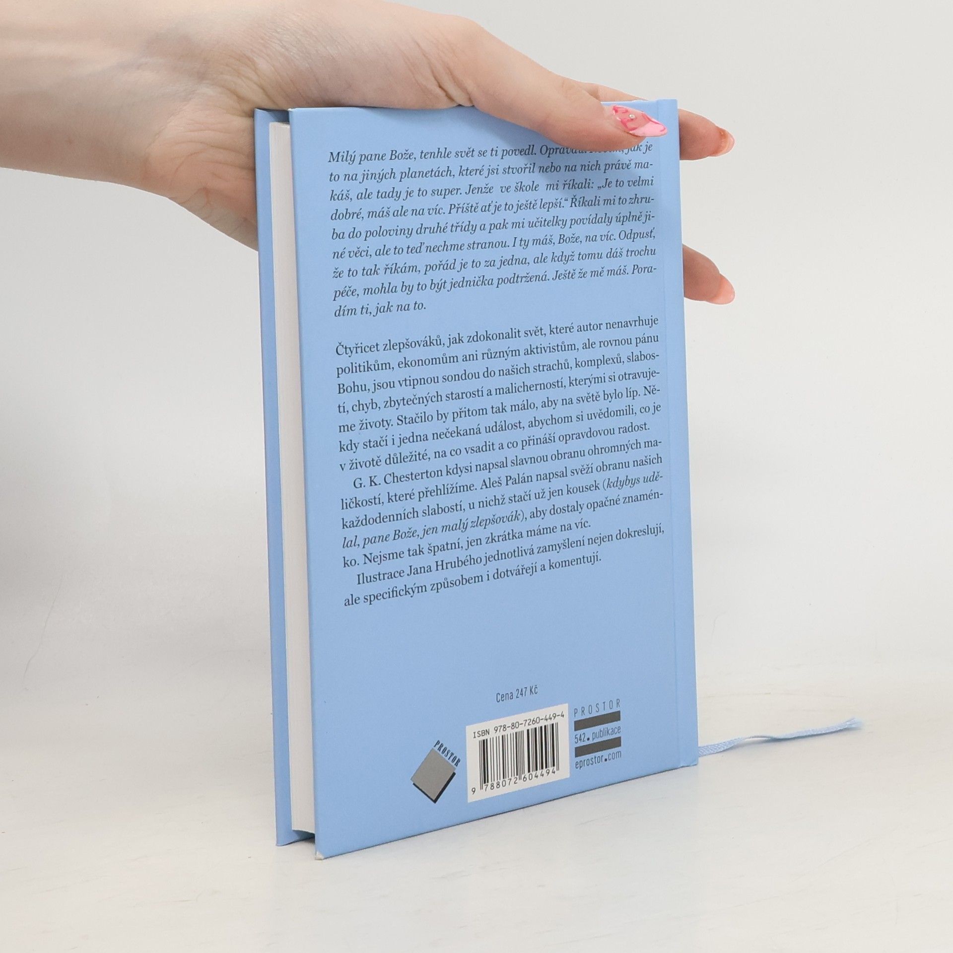 Milý pane Bože, tenhle svět se ti povedl. Opravdu. Nevím, jak je to na jiných planetách, které jsi stvořil nebo na nich právě makáš, ale tady je to super. Jenže ve škole mi říkali: „Je to velmi dobré, máš ale na víc. Příště ať je to ještě lepší.“ Říkali mi to zhruba do poloviny druhé třídy a pak mi učitelky povídaly úplně jiné věci, ale to teď nechme stranou. I ty máš, Bože, na víc. Odpusť, že to tak říkám, pořád je to za jedna, ale když tomu dáš trochu péče, mohla by to být jednička podtržená. Ještě že mě máš. Poradím ti, jak na to. Čtyřicet zlepšováků, jak zdokonalit svět, které autor nenavrhuje politikům, ekonomům ani různým aktivistům, ale rovnou pánu Bohu, jsou vtipnou sondou do našich strachů, komplexů, slabostí, chyb, zbytečných starostí a malicherností, kterými si otravujeme životy. Stačilo by přitom tak málo, aby na světě bylo líp. Někdy stačí i jedna nečekaná událost, abychom si uvědomili, co je v životě důležité, na co vsadit a co přináší opravdovou radost. G. K. Chesterton kdysi napsal slavnou obranu ohromných maličkostí, které přehlížíme. Aleš Palán napsal svěží obranu našich každodenních slabostí, u nichž stačí už jen kousek (kdybys udělal, pane Bože, jen malý zlepšovák), aby dostaly opačné znaménko. Nejsme tak špatní, jen zkrátka máme na víc. Ilustrace Jana Hrubého jednotlivá zamyšlení nejen dokreslují, ale specifickým způsobem i dotvářejí a komentují.