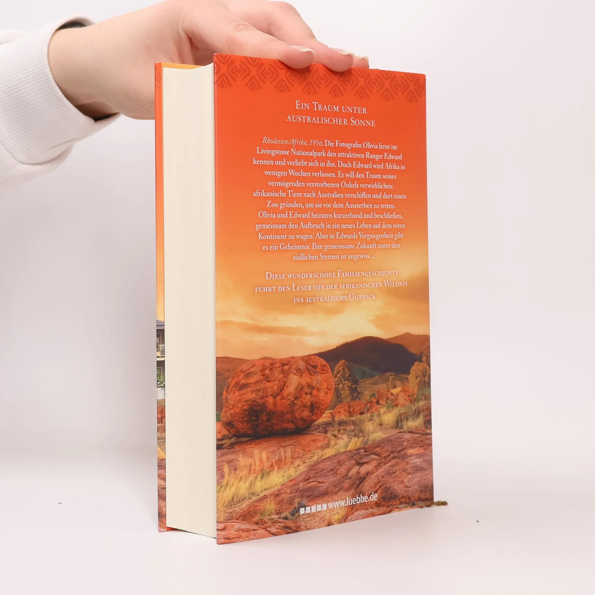 Rhodesien/ Afrika, 1956: Die Fotografin Olivia lernt im Livingstone Nationalpark den attraktiven Edward kennen. Doch er wird Afrika in ein paar Wochen verlassen. Er will bedrohte afrikanische Tiere nach Australien verschiffen und dort einen Zoo gründen. Kurzerhand beschließen Olivia und Edward zu heiraten und gemeinsam zum roten Kontinent aufzubrechen. Aber in Edwards Vergangenheit gibt es ein Geheimnis ... Diese wunderschöne Familiengeschichte führt den Leser von Afrika nach Australien